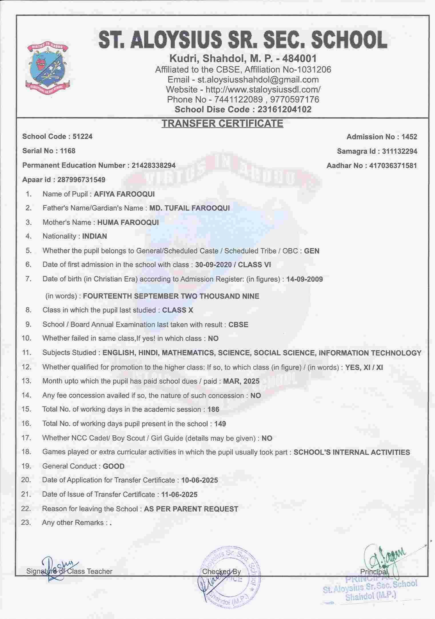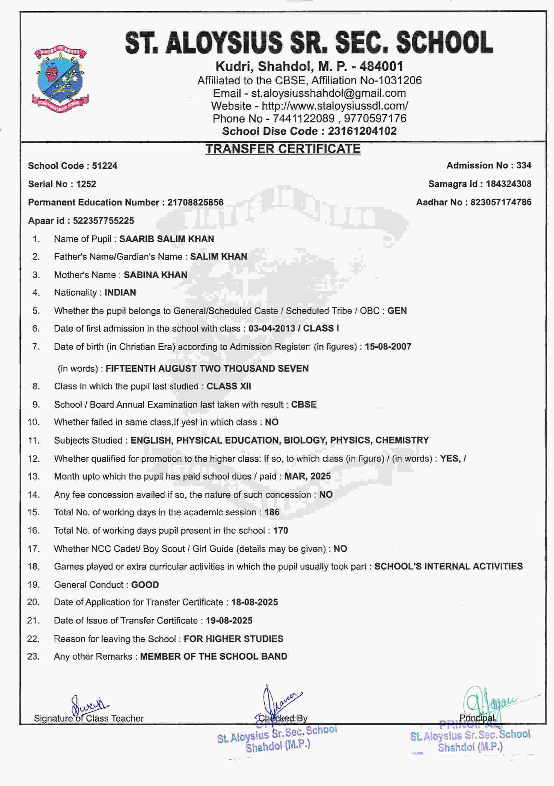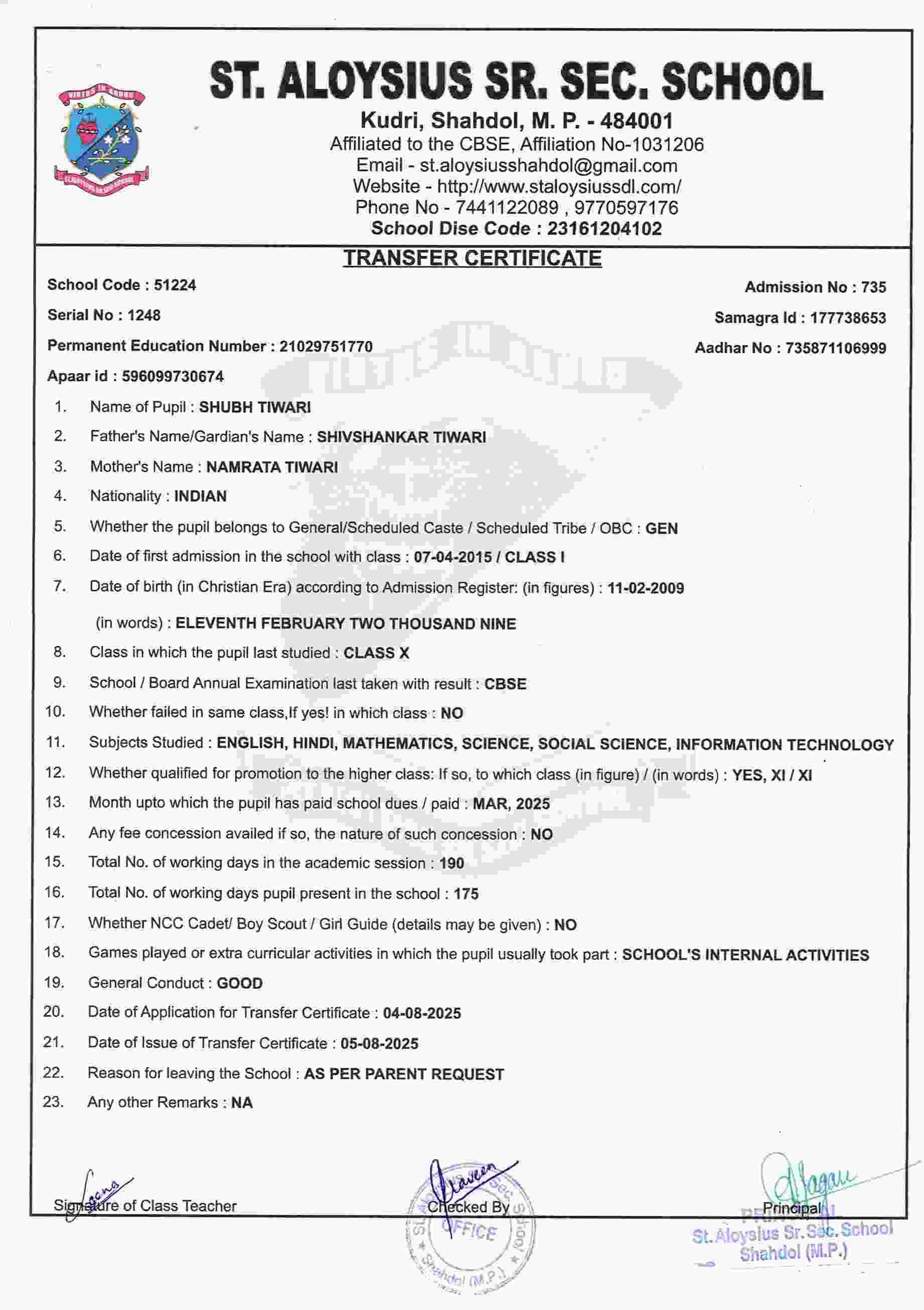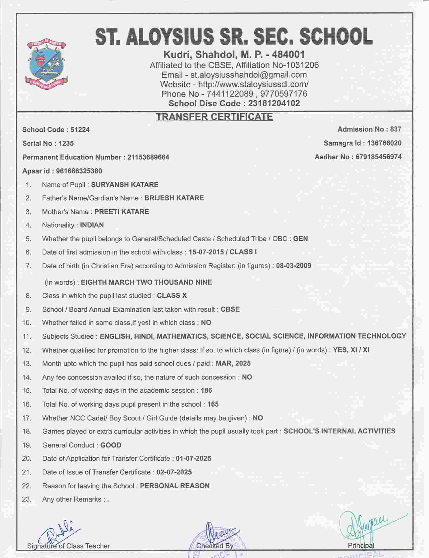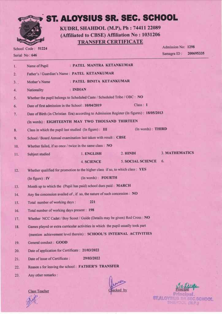 AFFILIATION NUMBER TRANSFER CERTIFICATE SCHOOL CODE