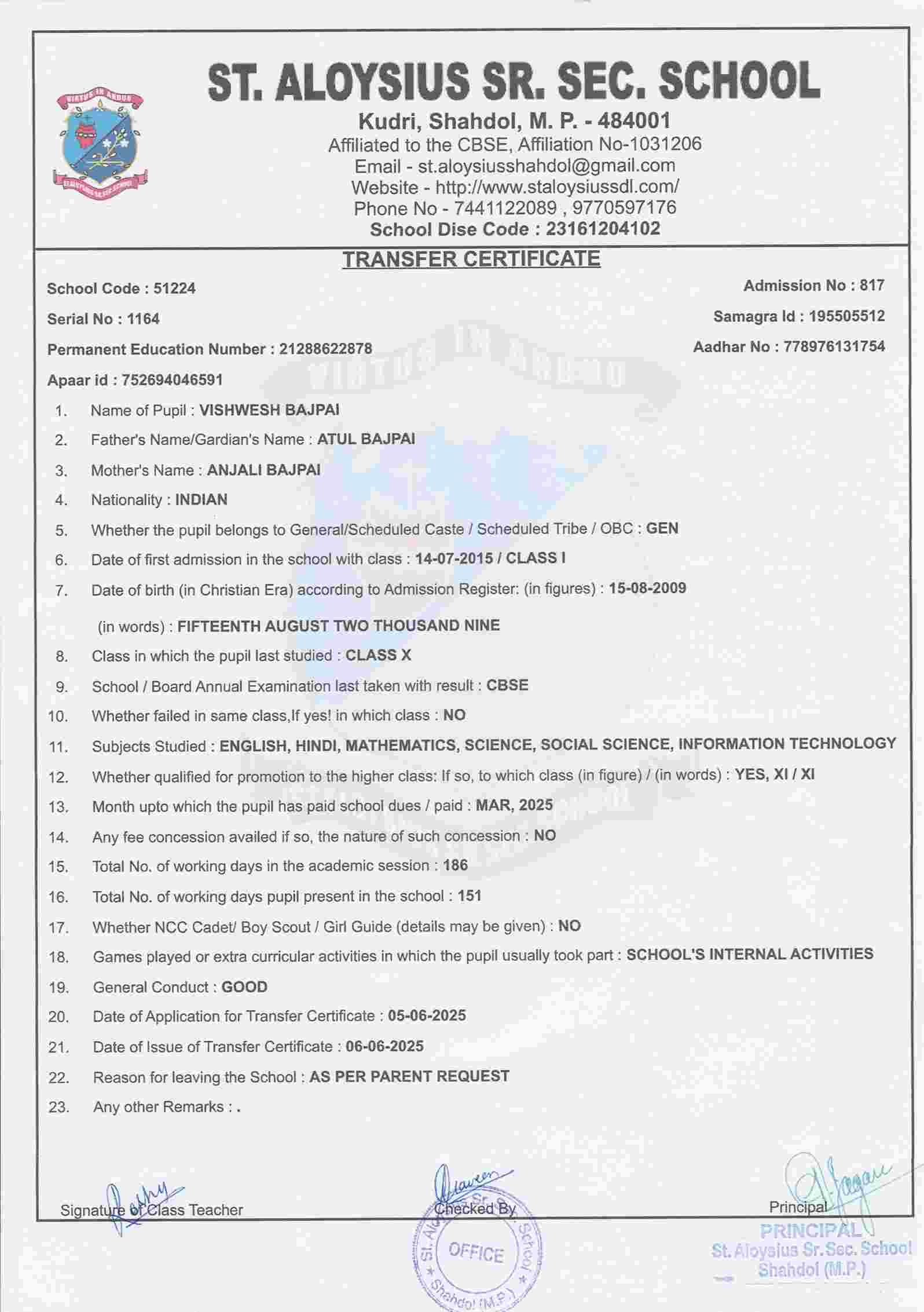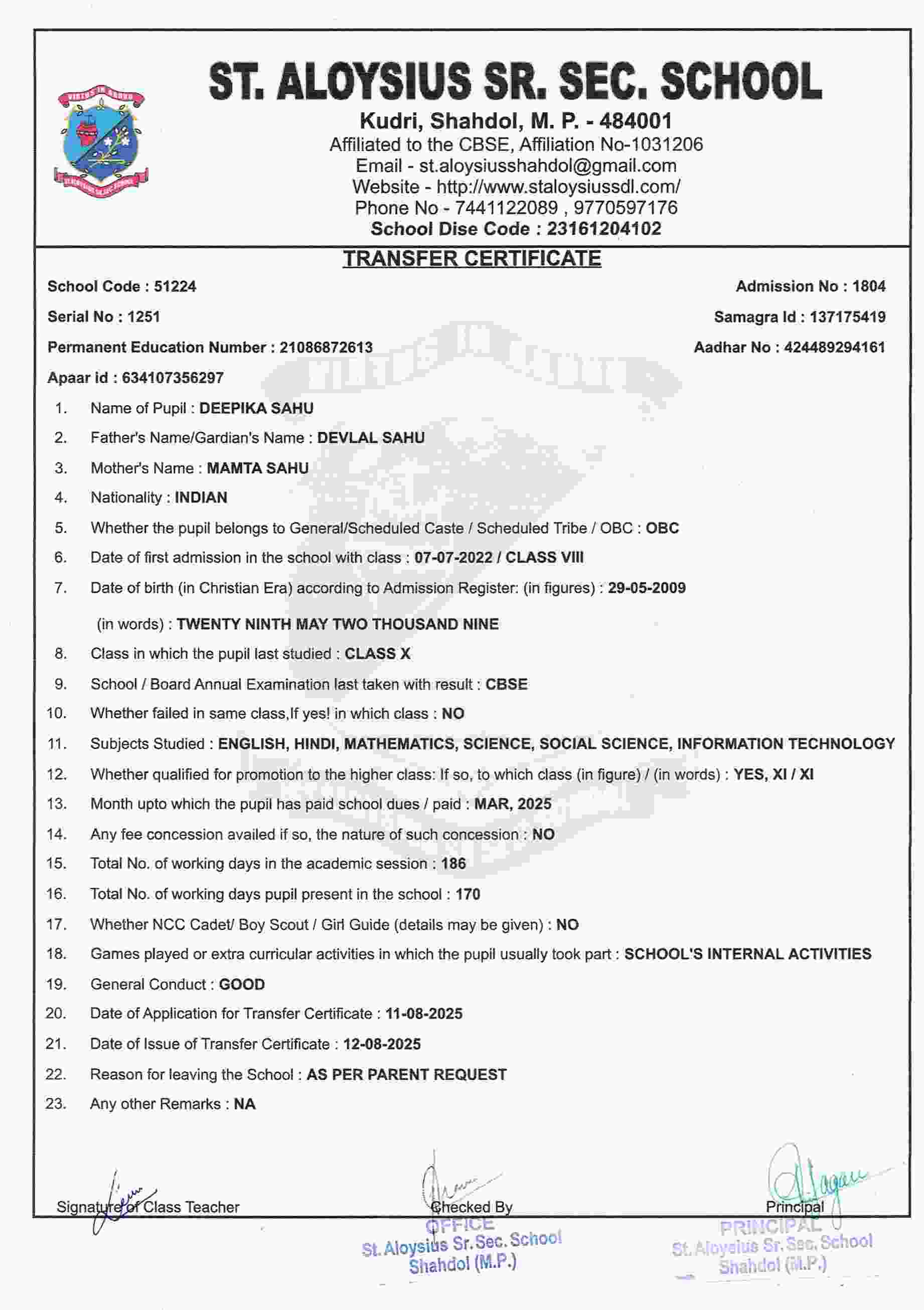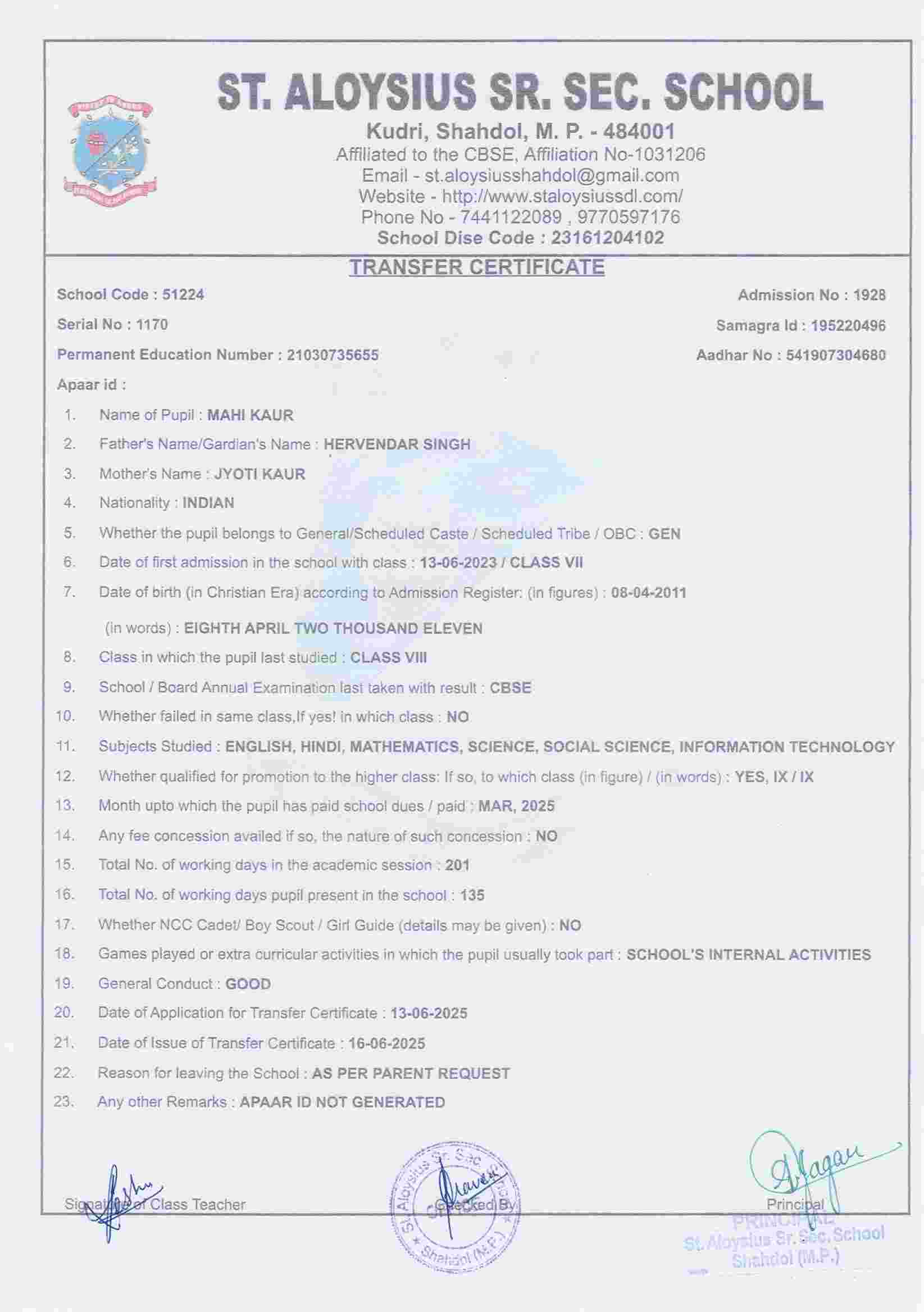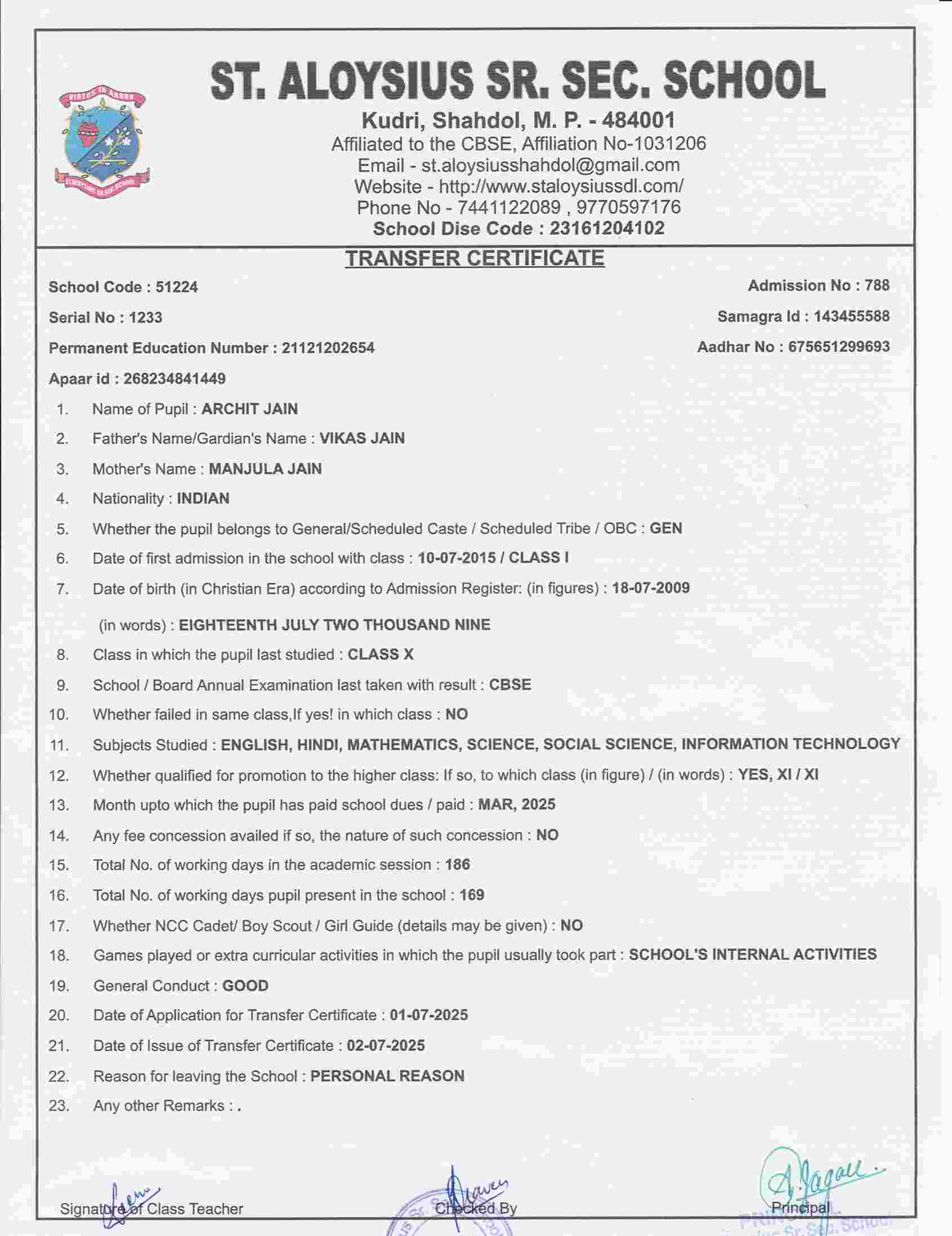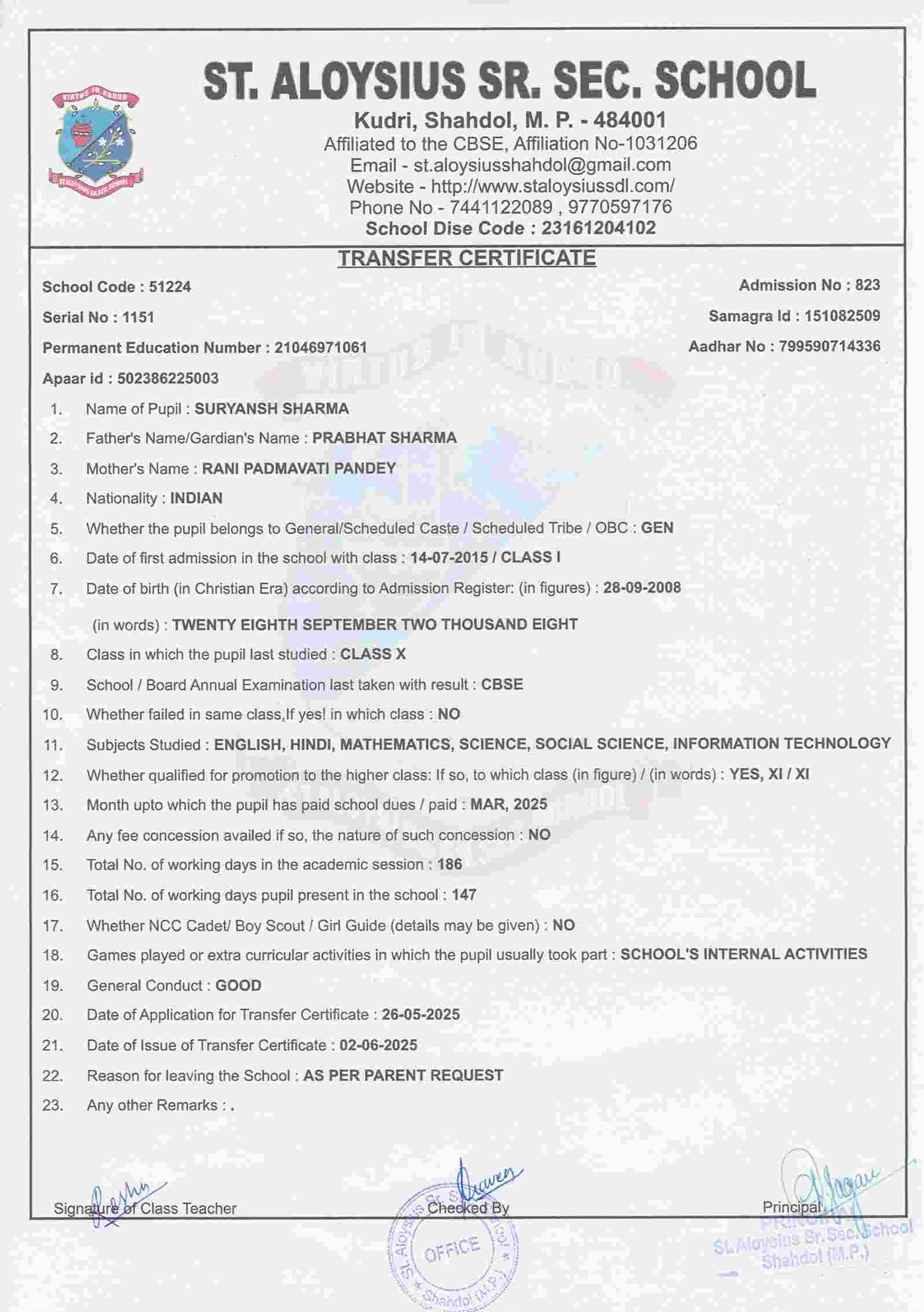 AFFILIATION NUMBER TRANSFER CERTIFICATE SCHOOL CODE