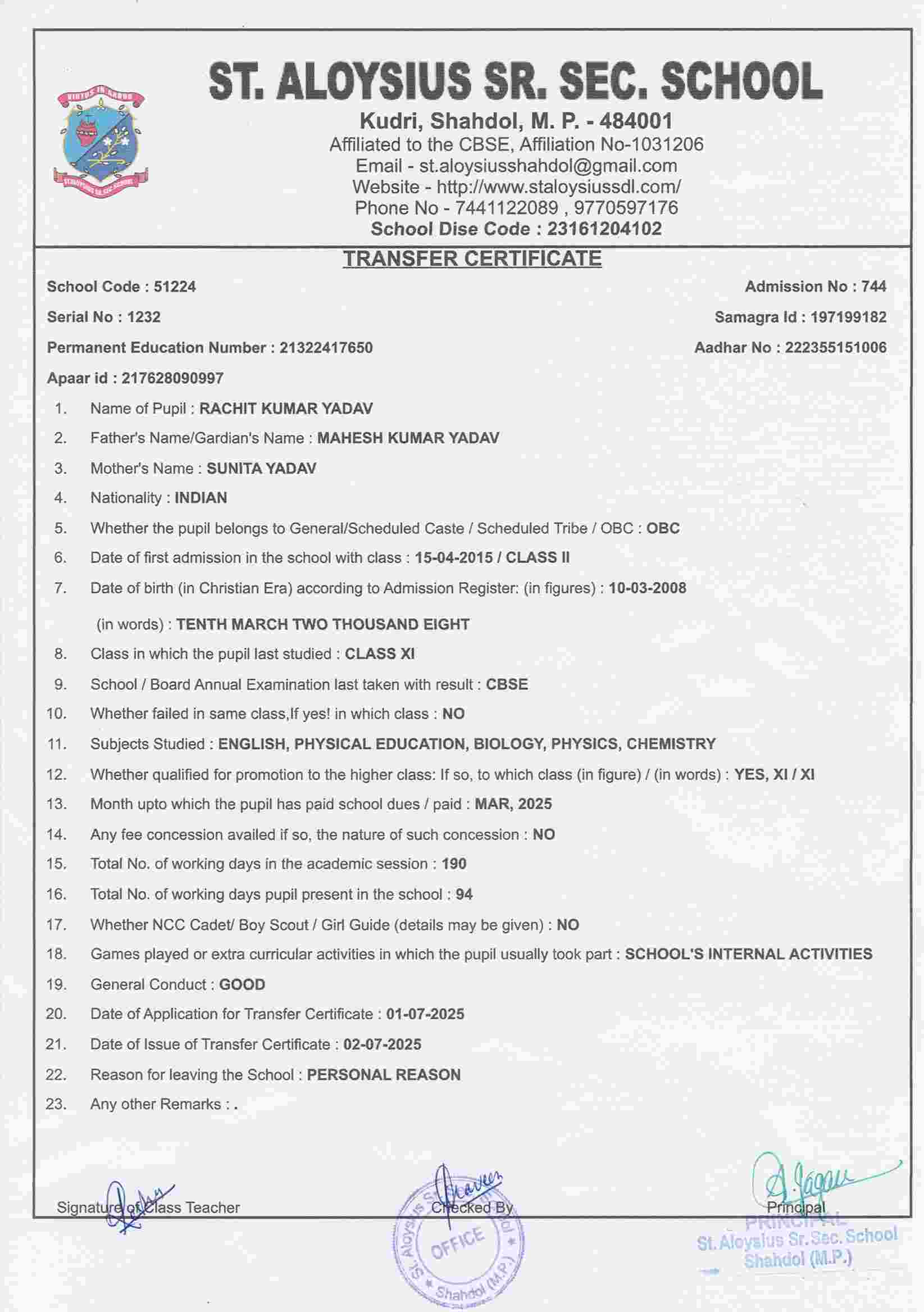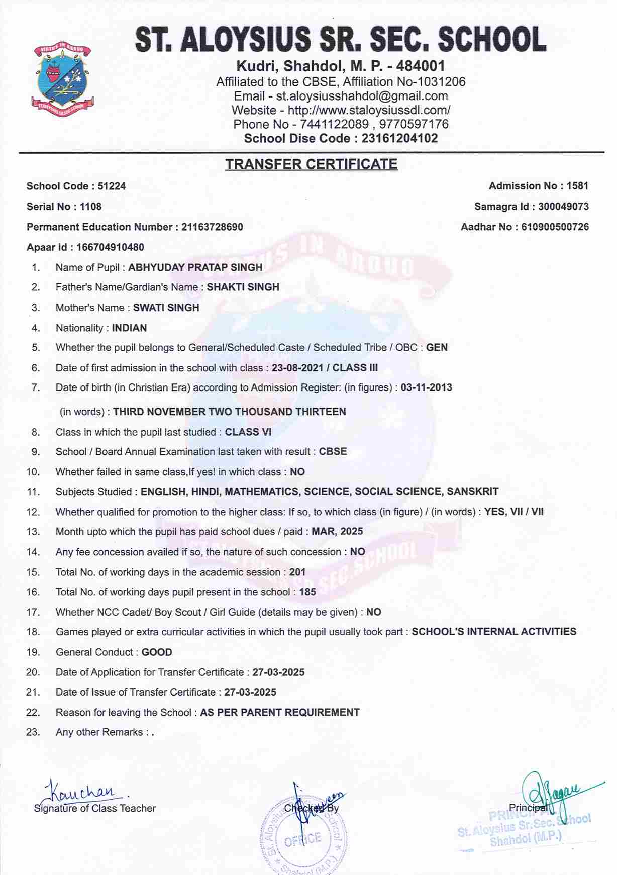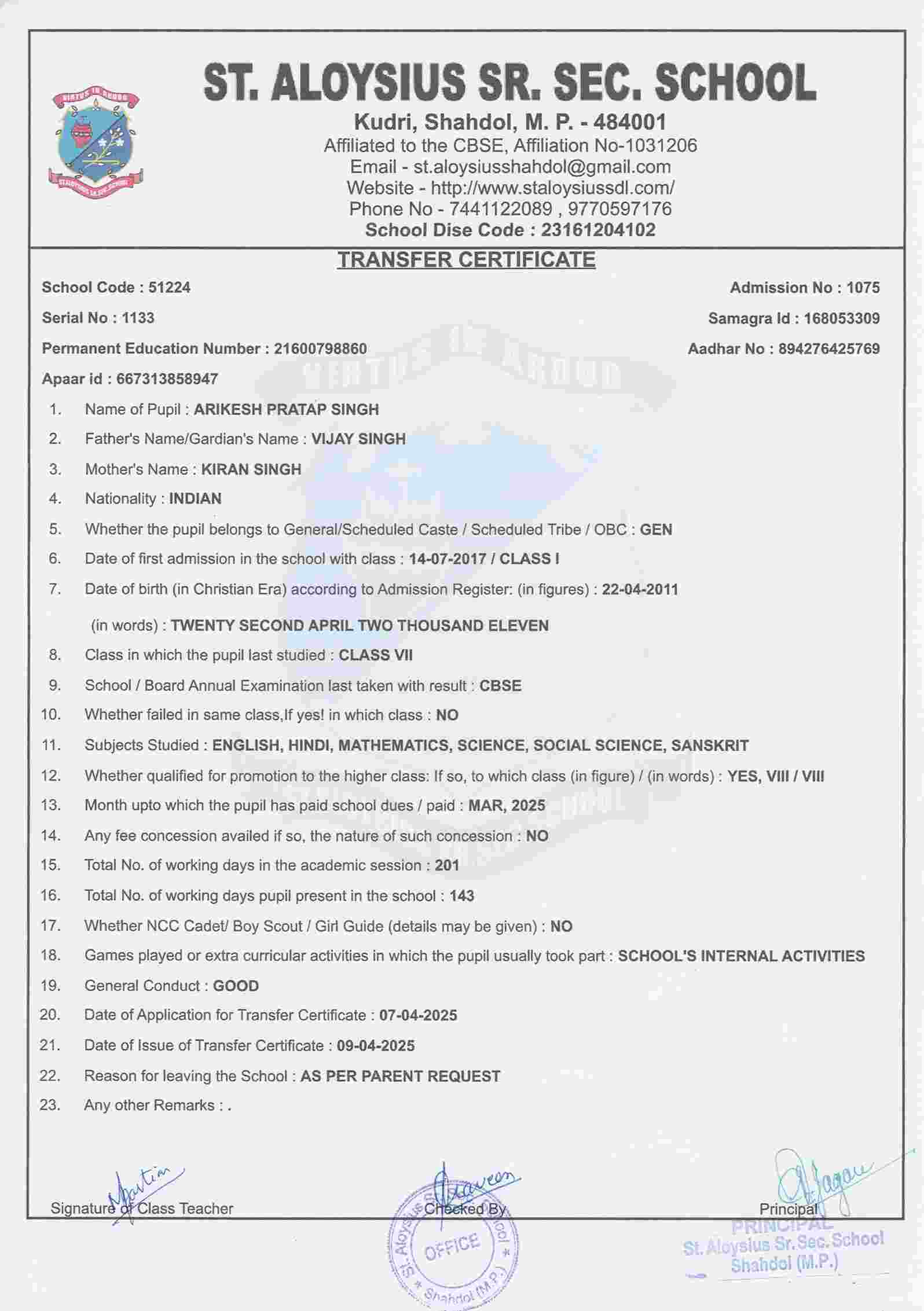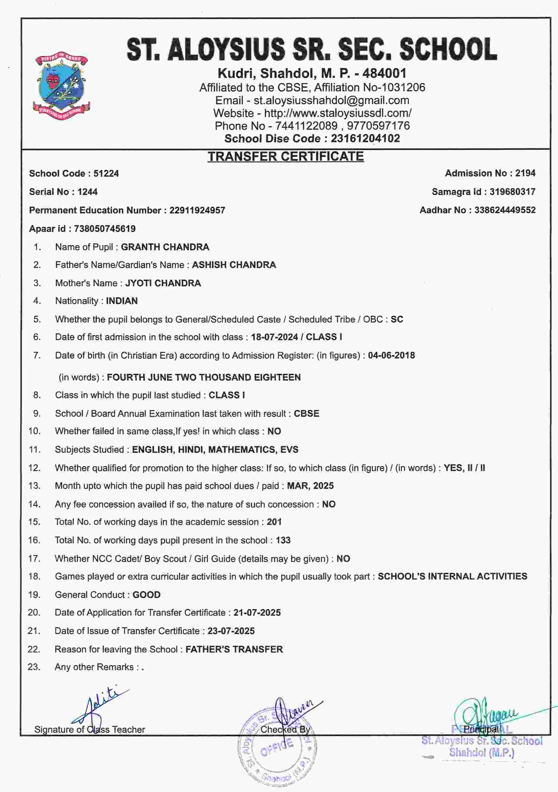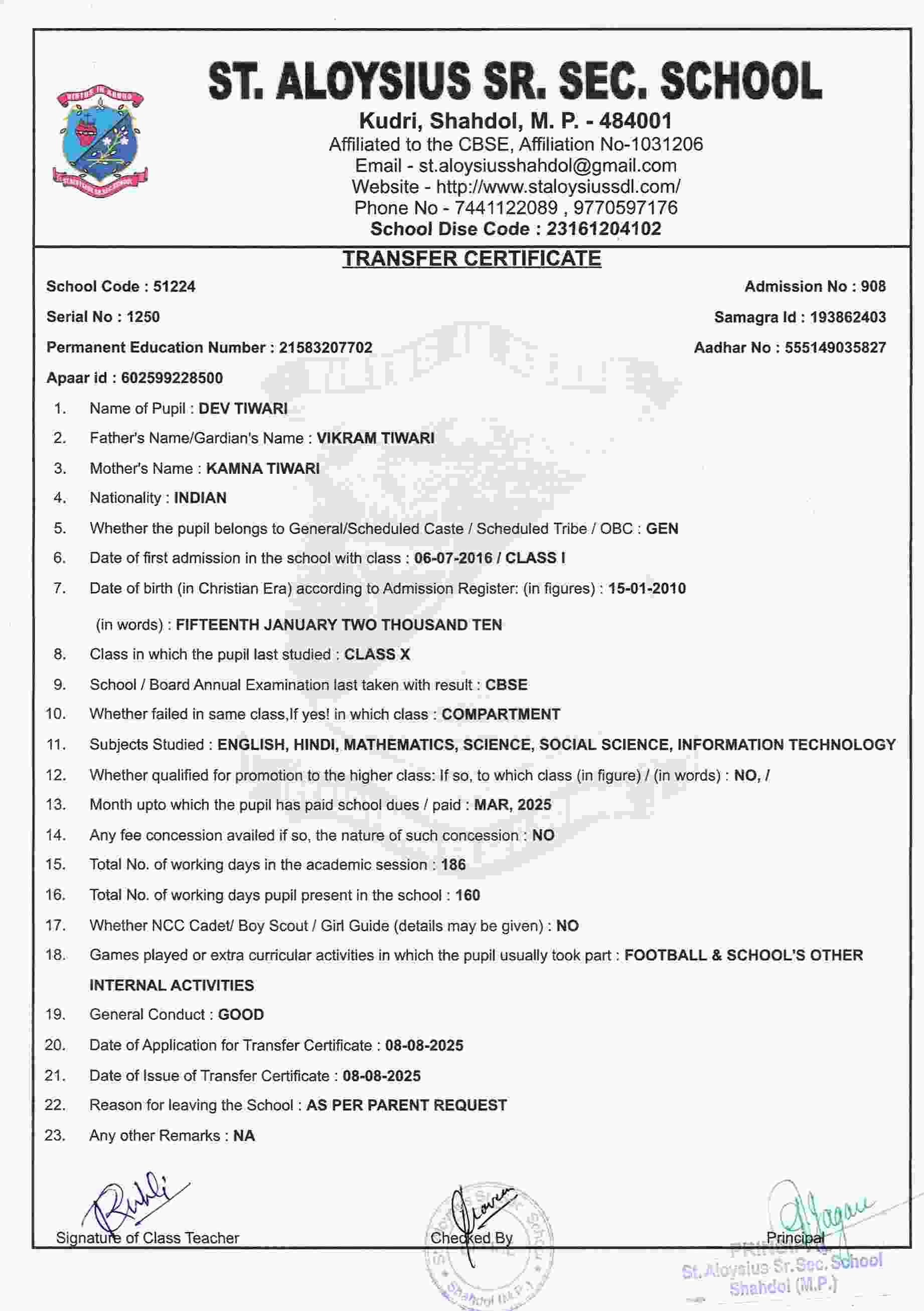 AFFILIATION NUMBER TRANSFER CERTIFICATE SCHOOL CODE