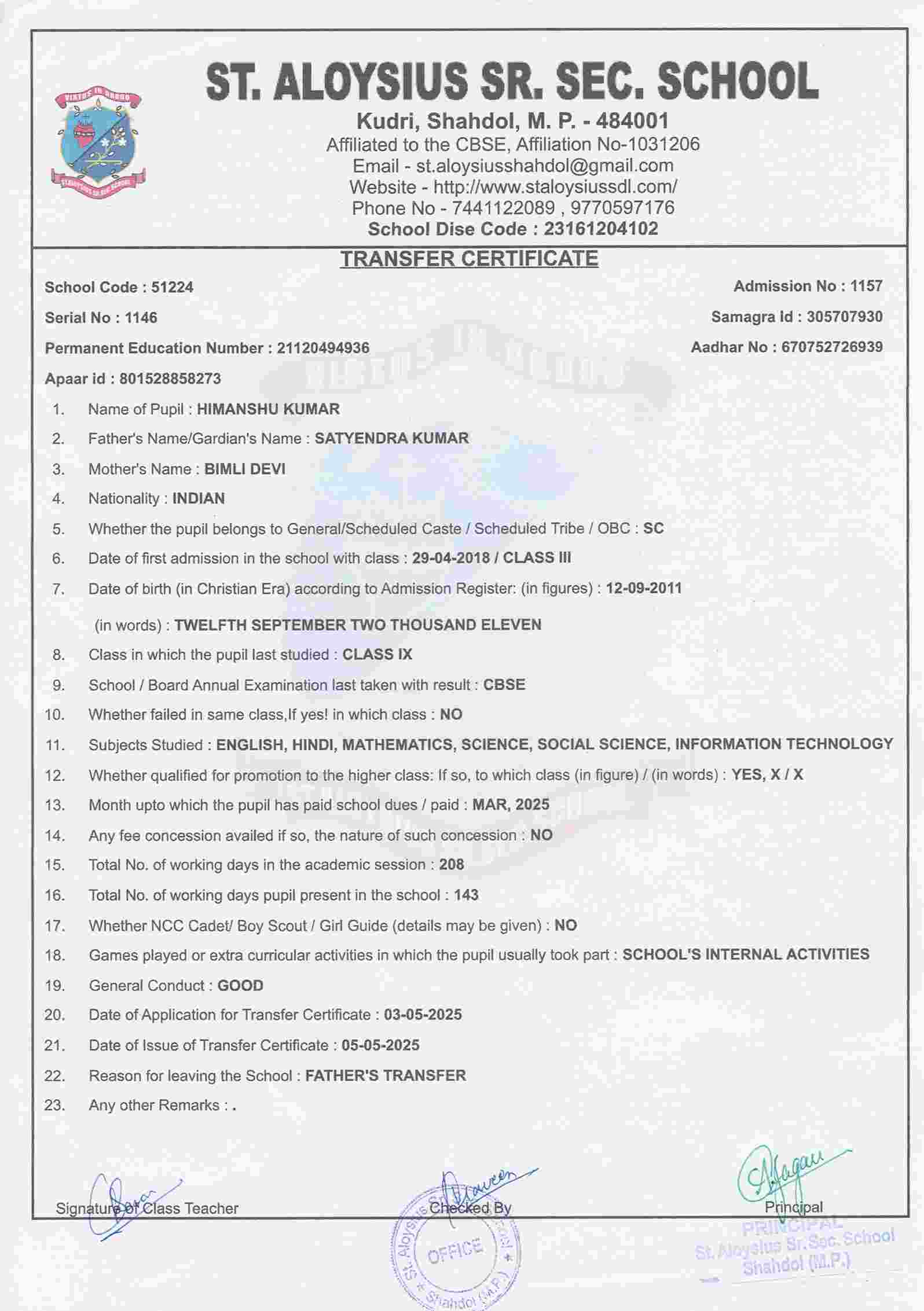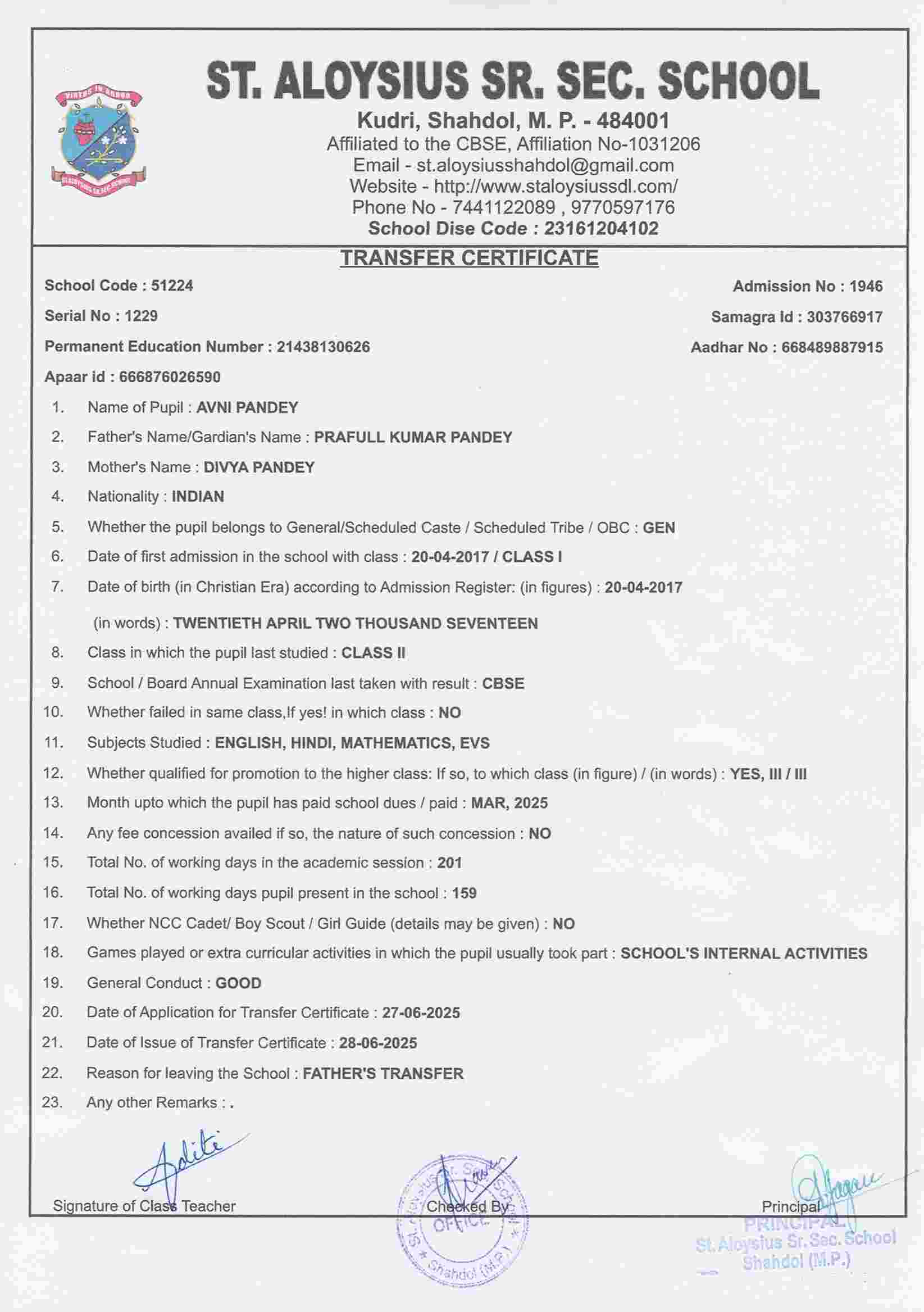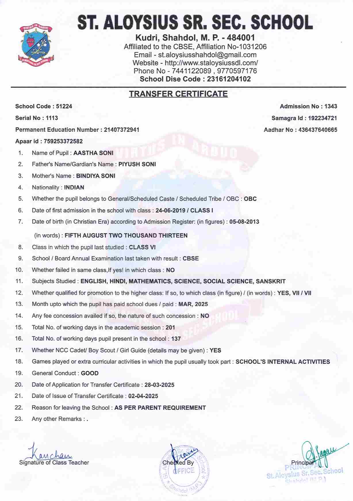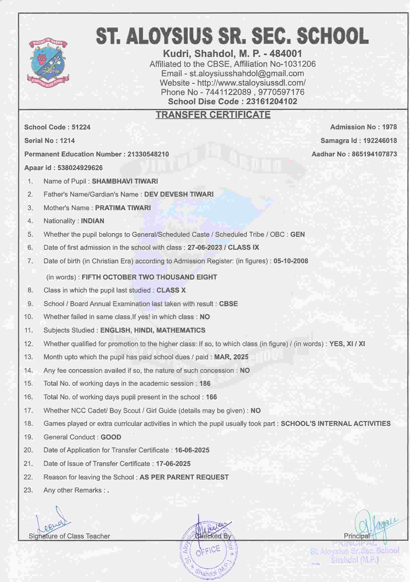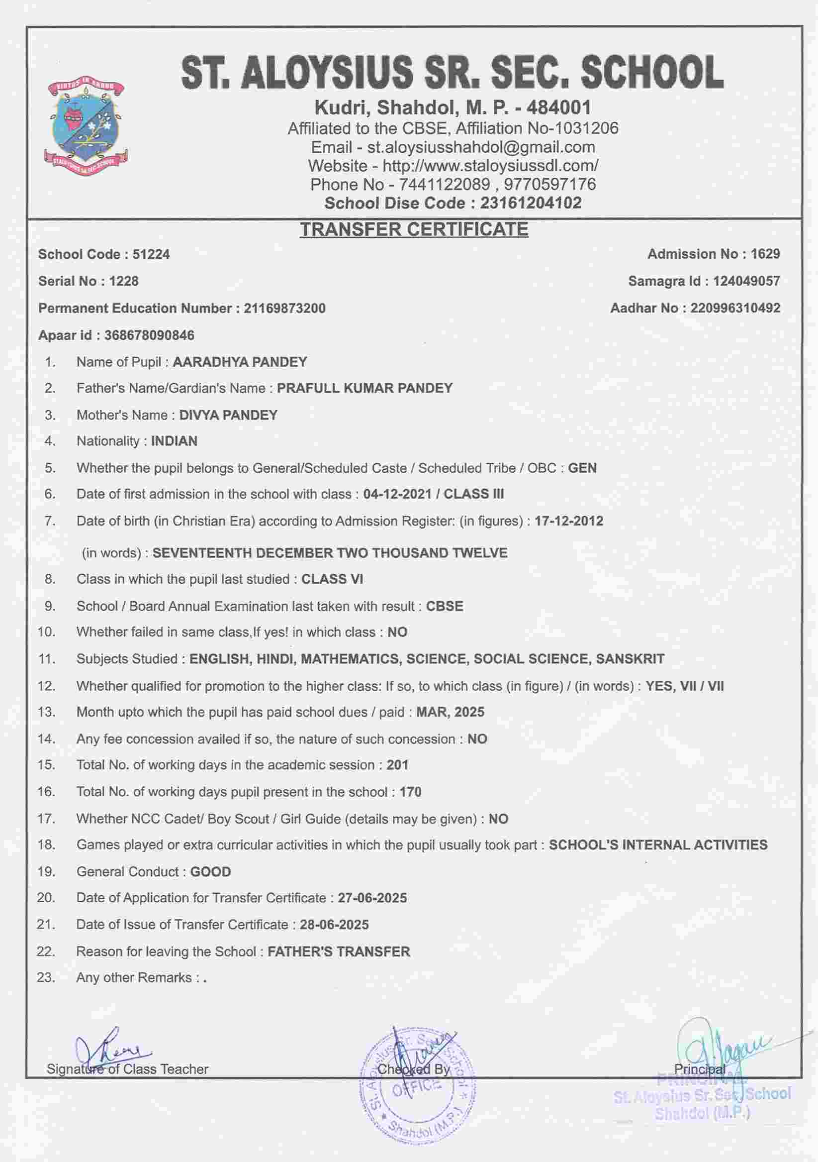 AFFILIATION NUMBER TRANSFER CERTIFICATE SCHOOL CODE