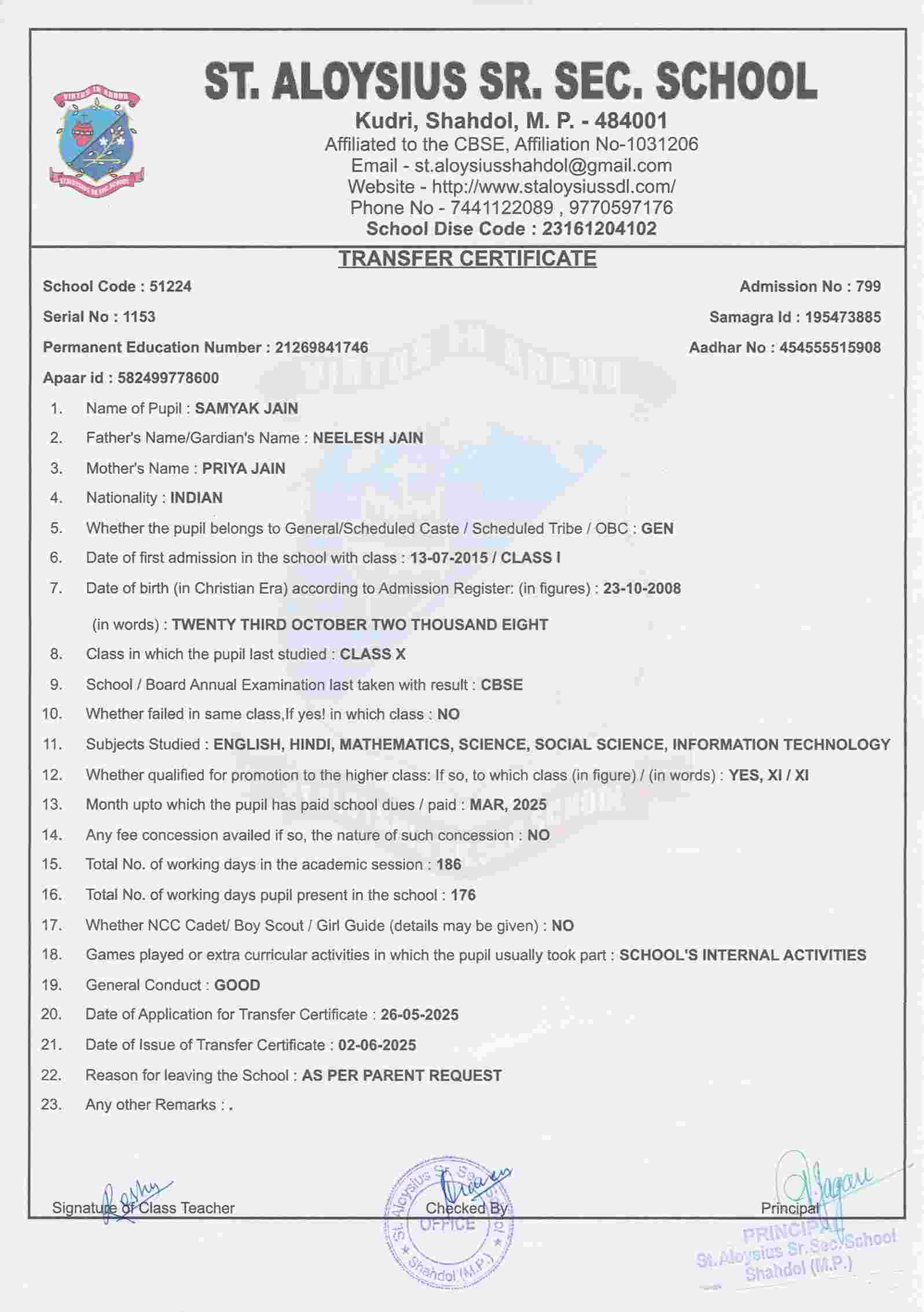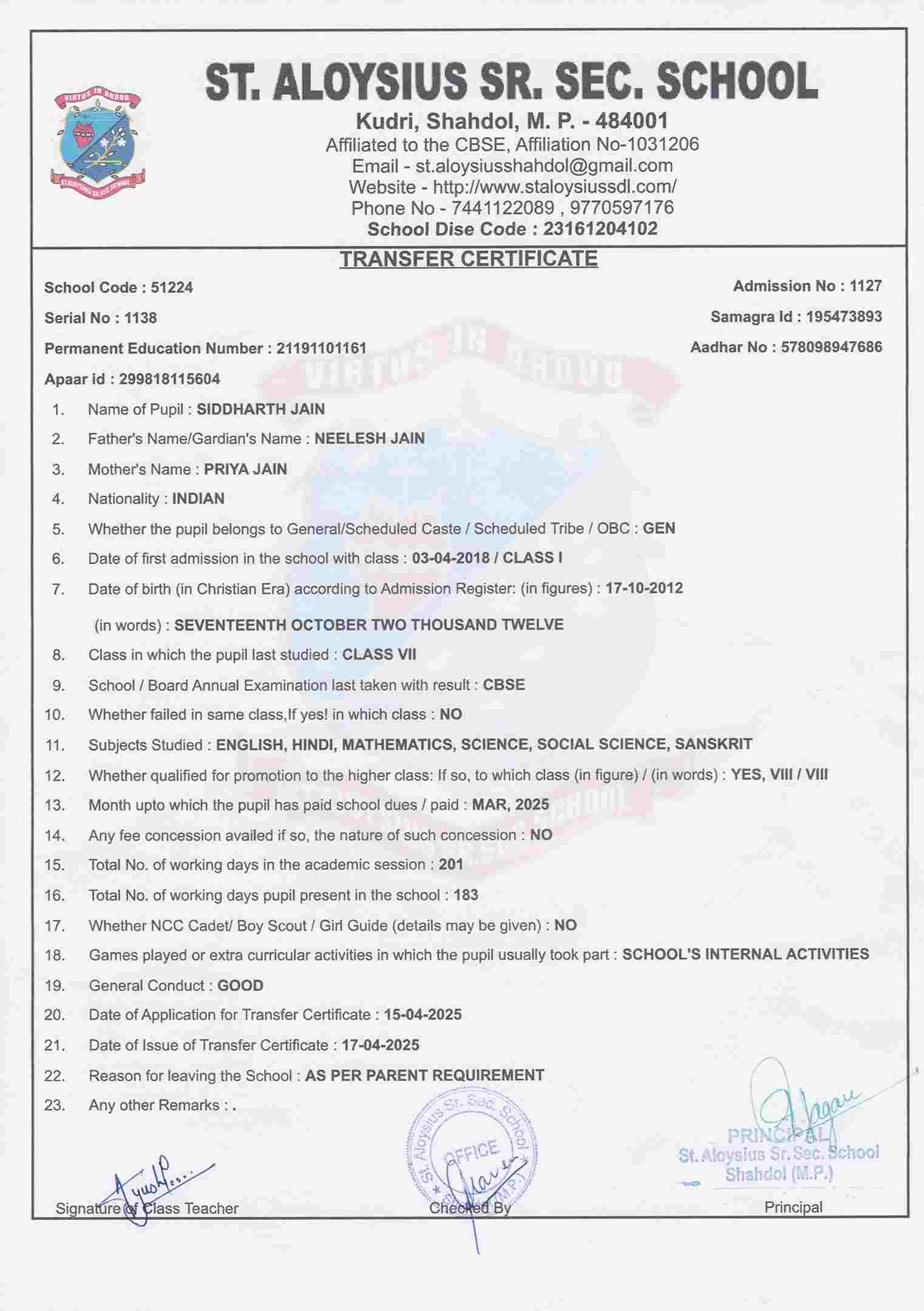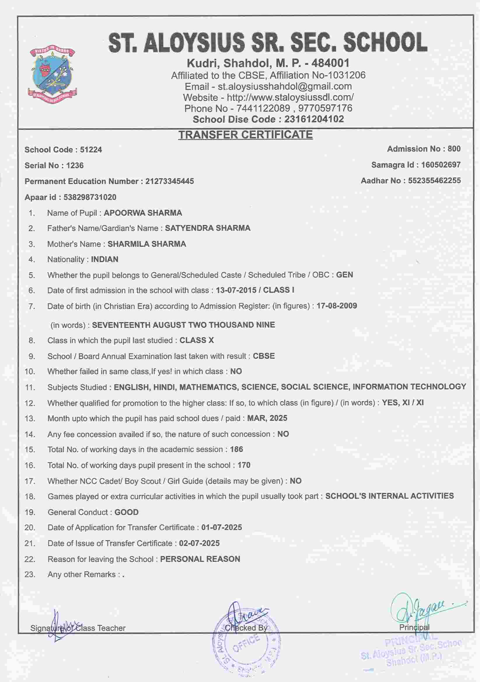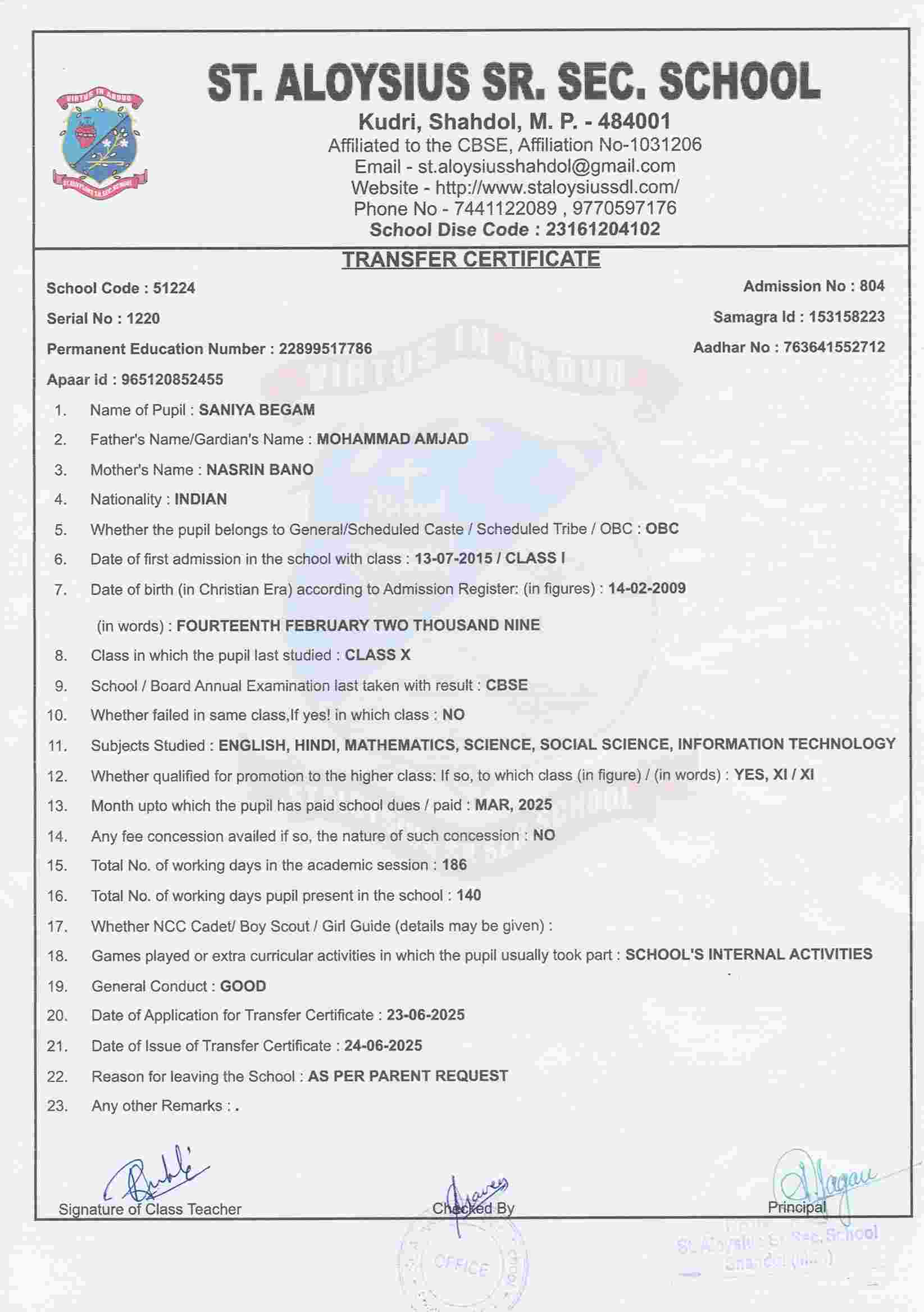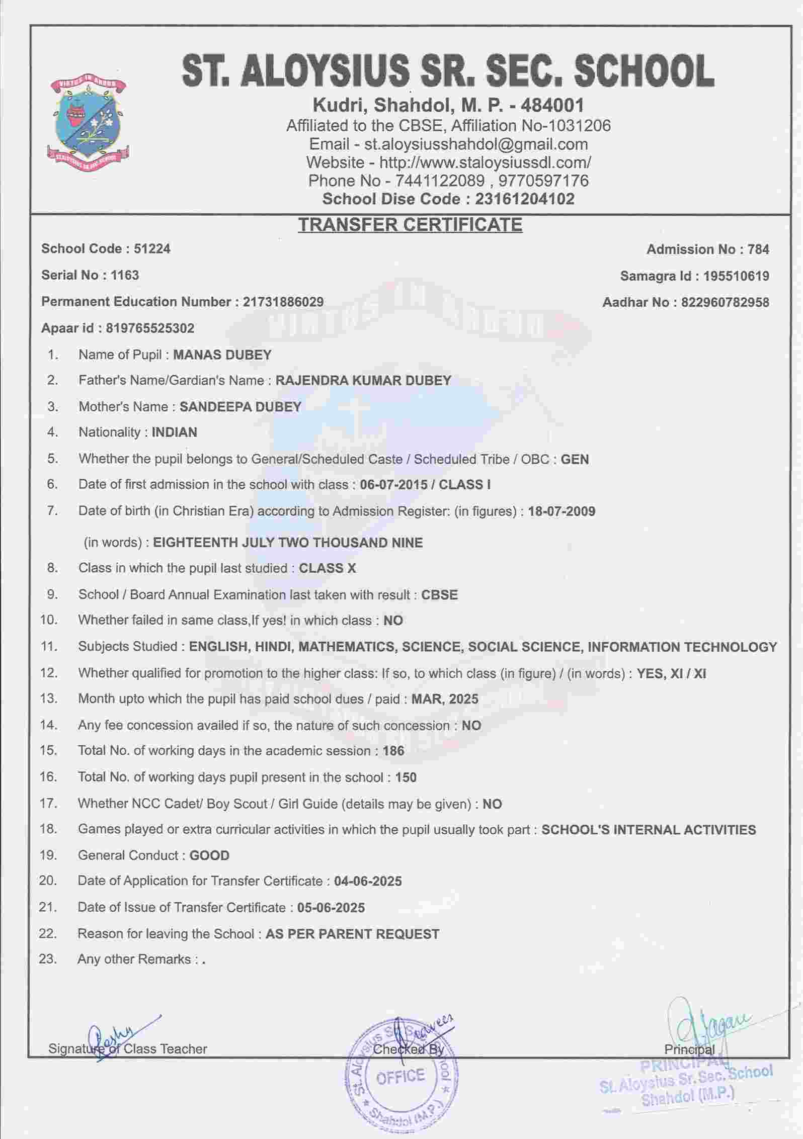 AFFILIATION NUMBER TRANSFER CERTIFICATE SCHOOL CODE