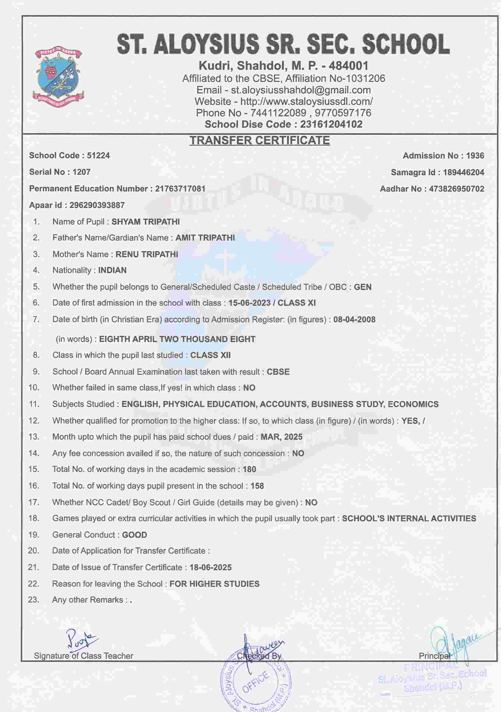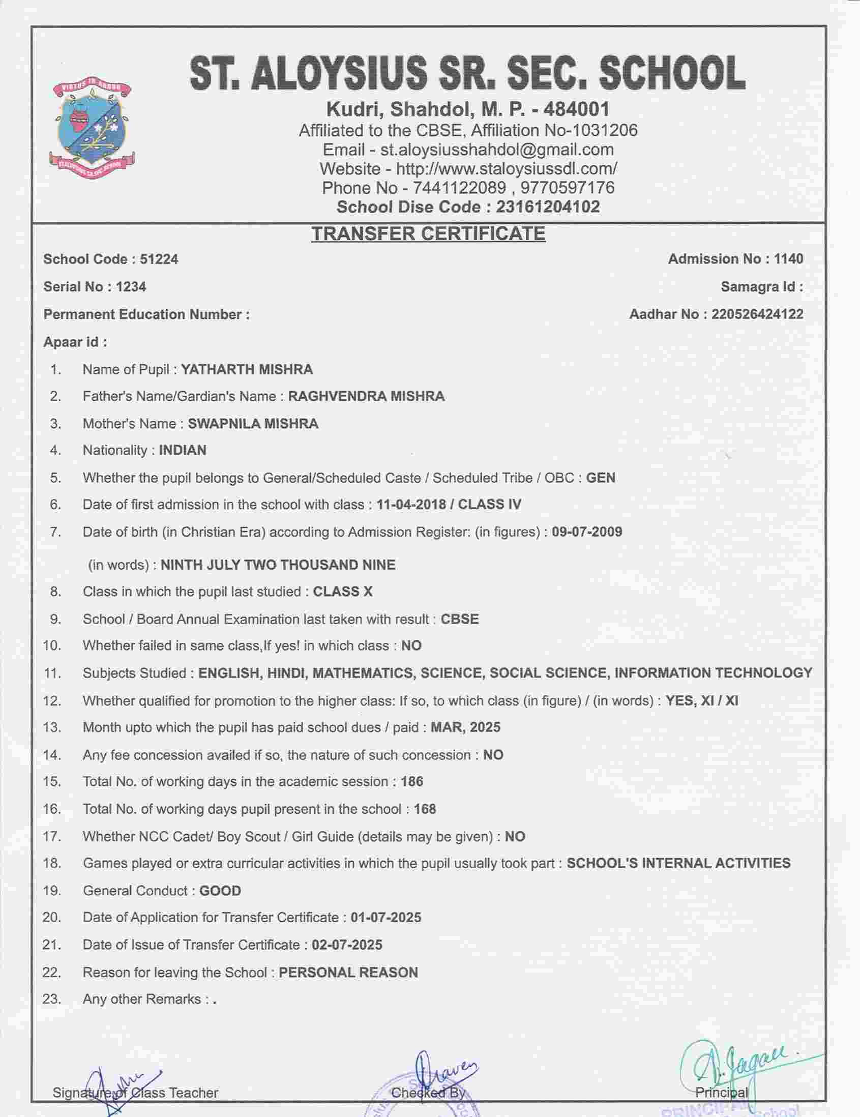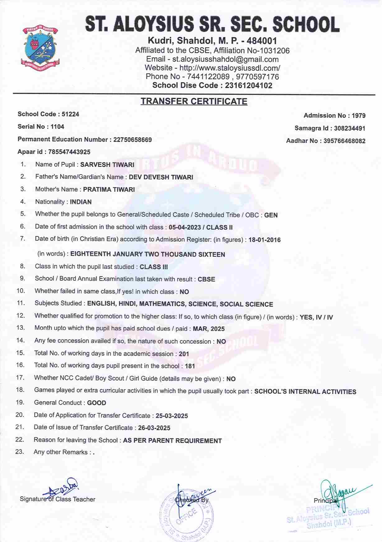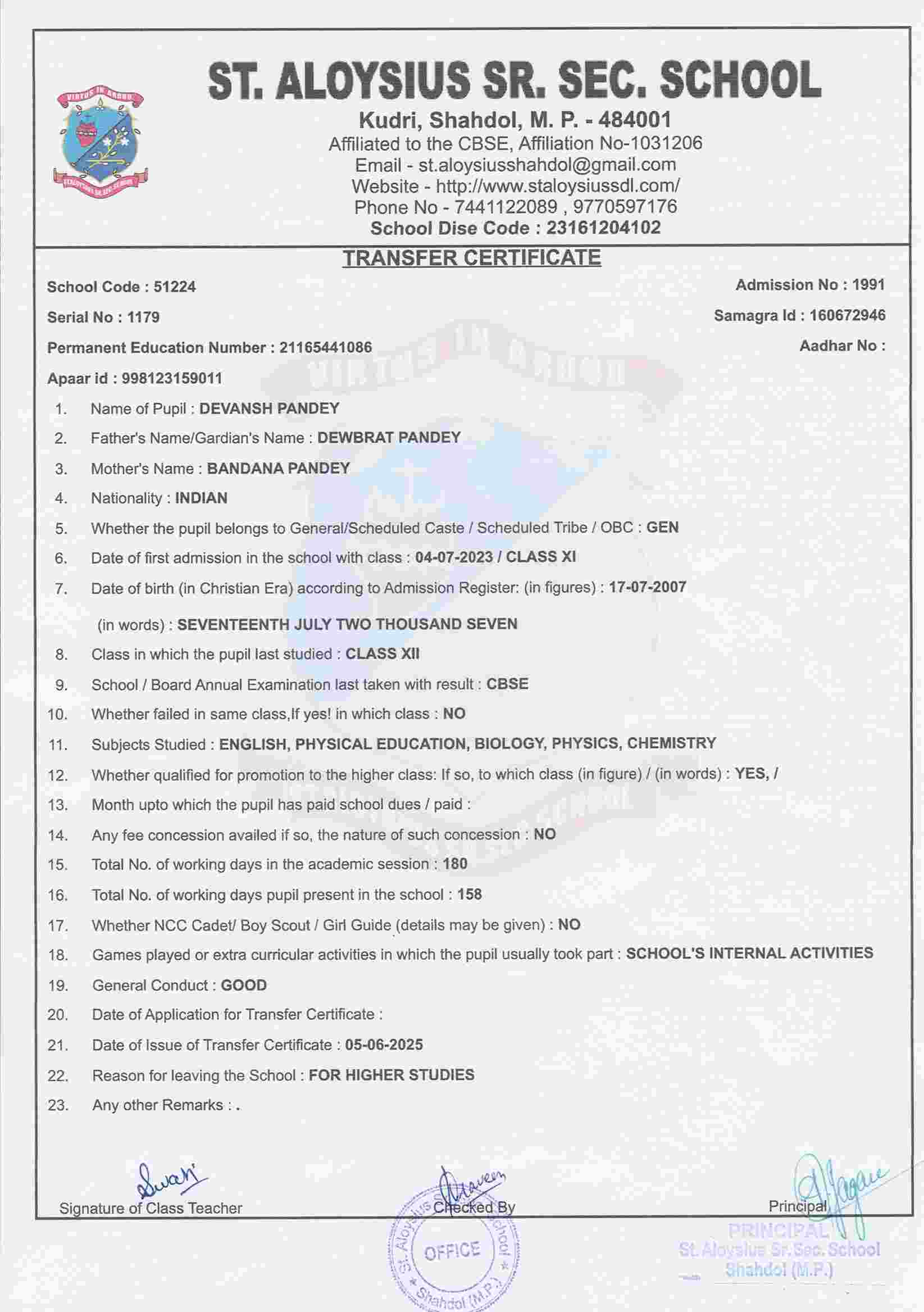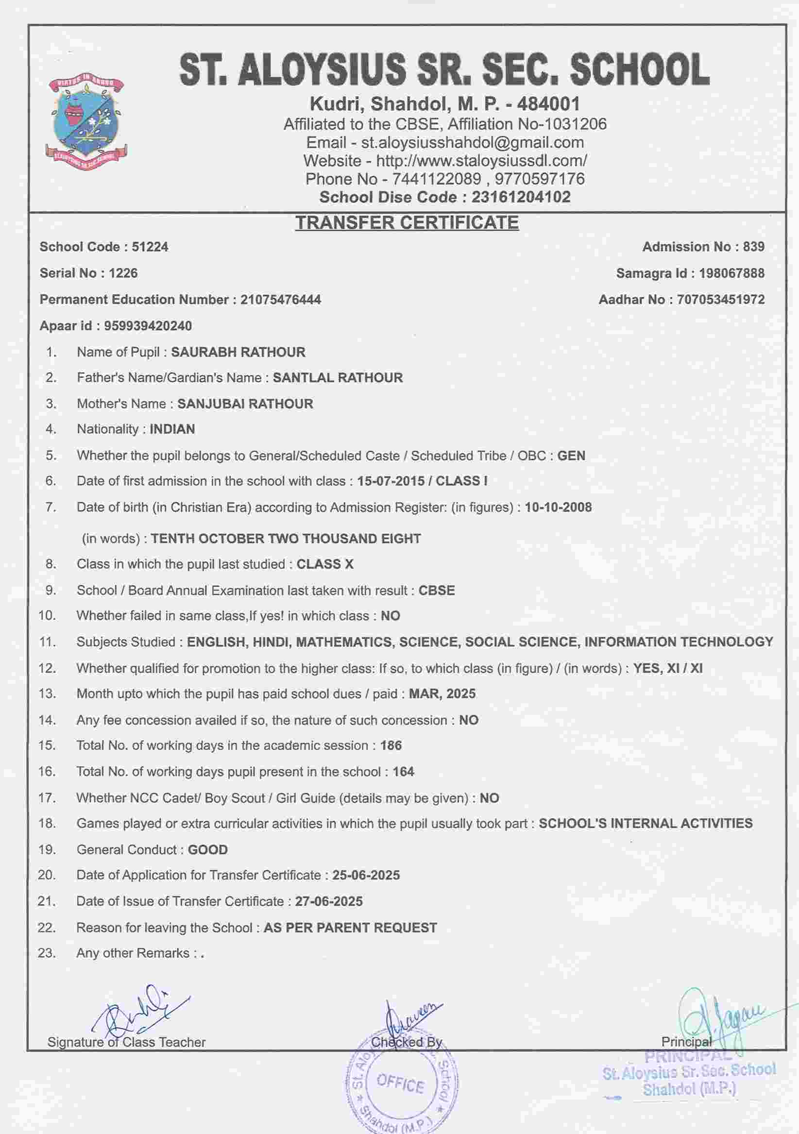 AFFILIATION NUMBER TRANSFER CERTIFICATE SCHOOL CODE