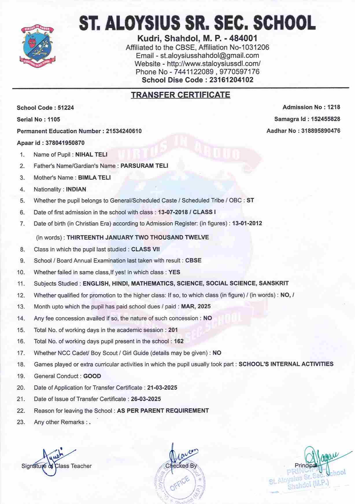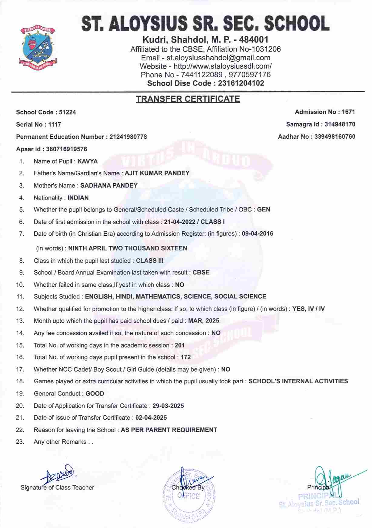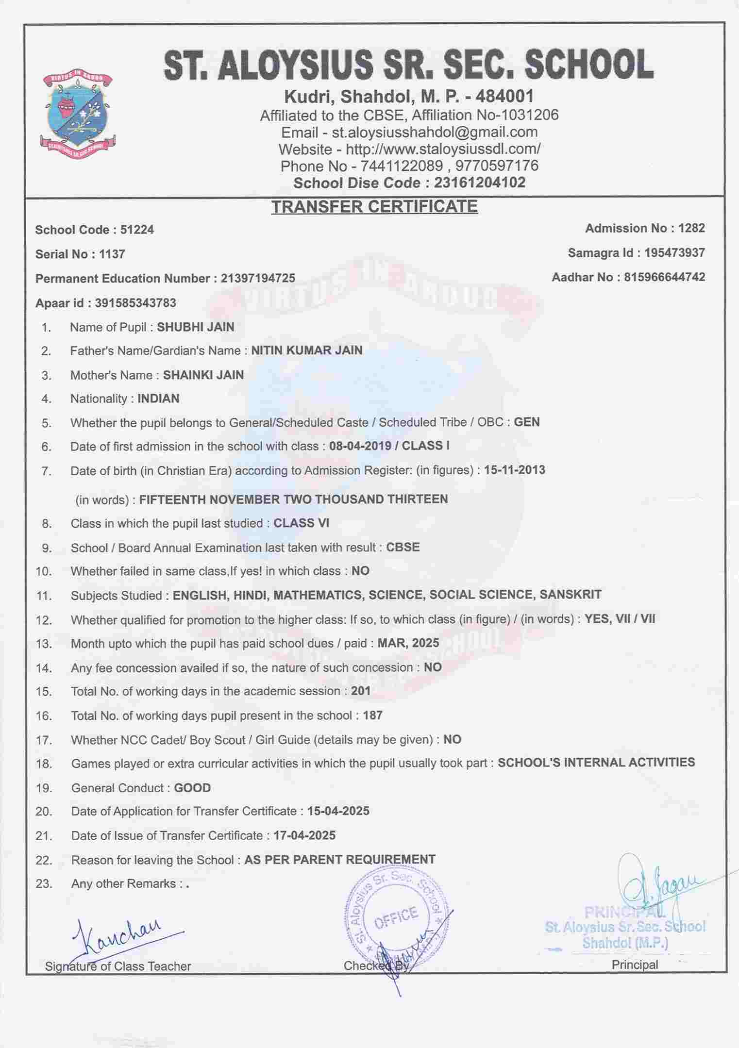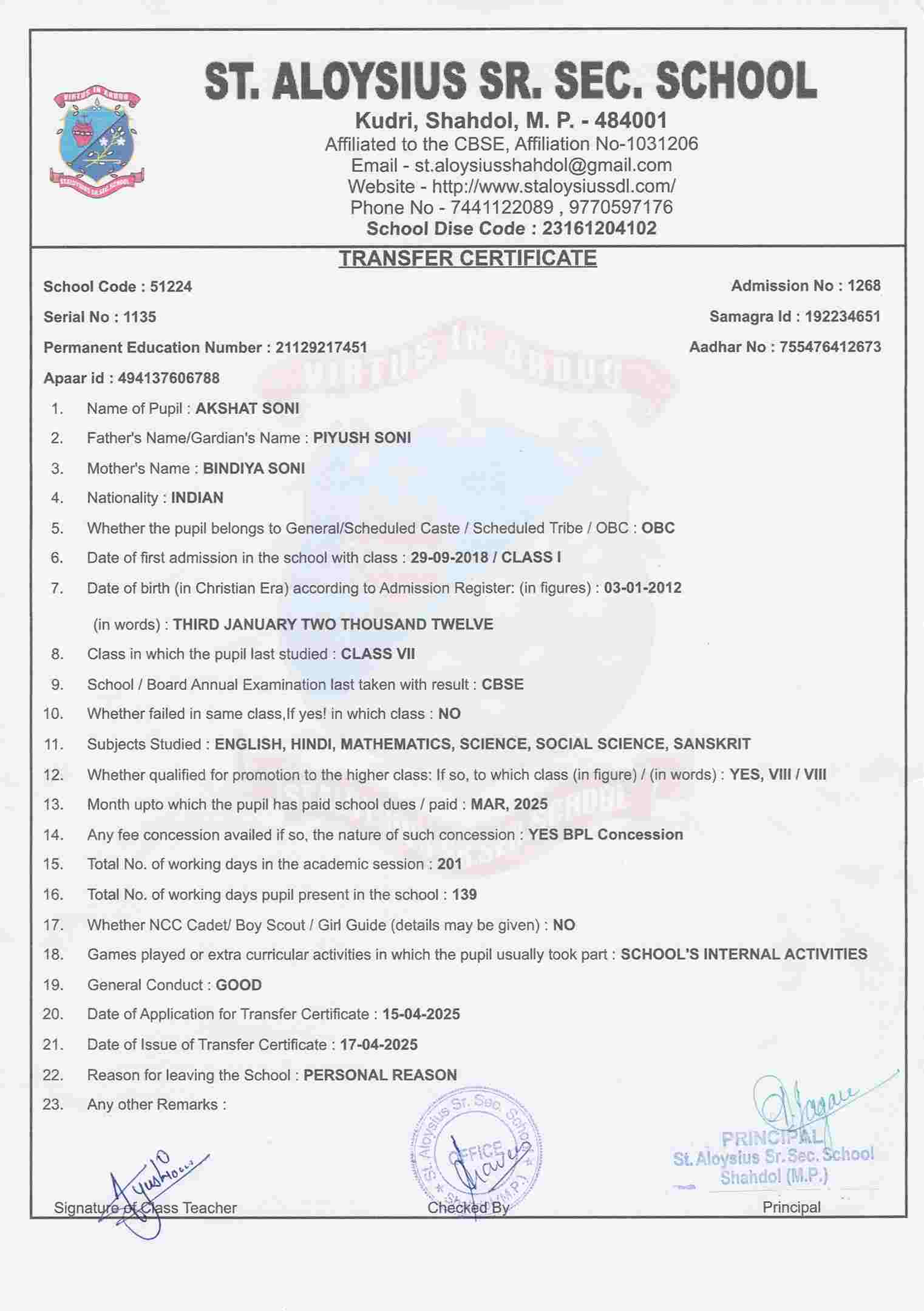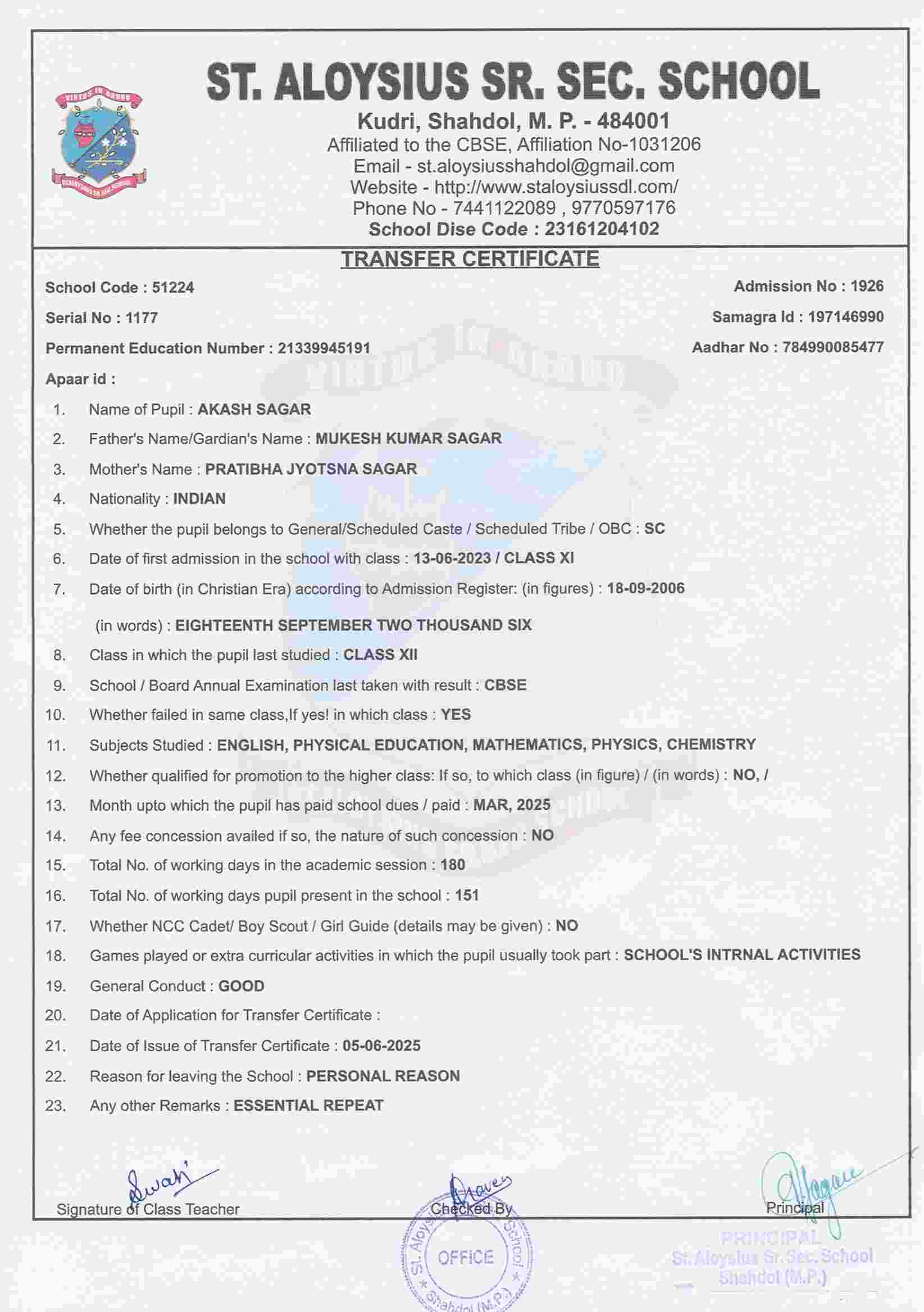 AFFILIATION NUMBER TRANSFER CERTIFICATE SCHOOL CODE