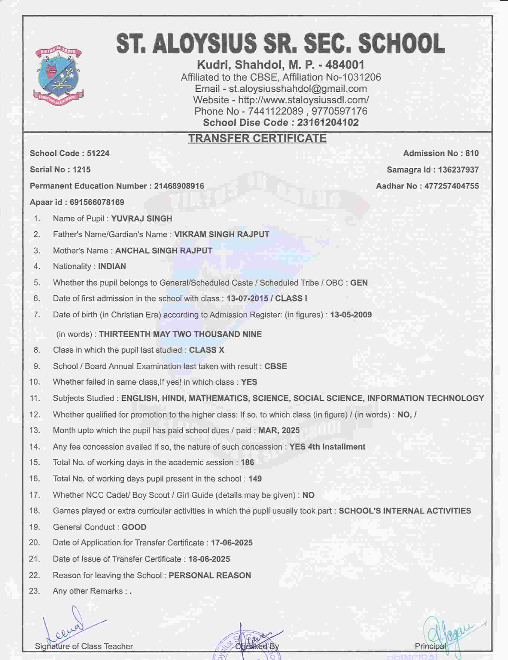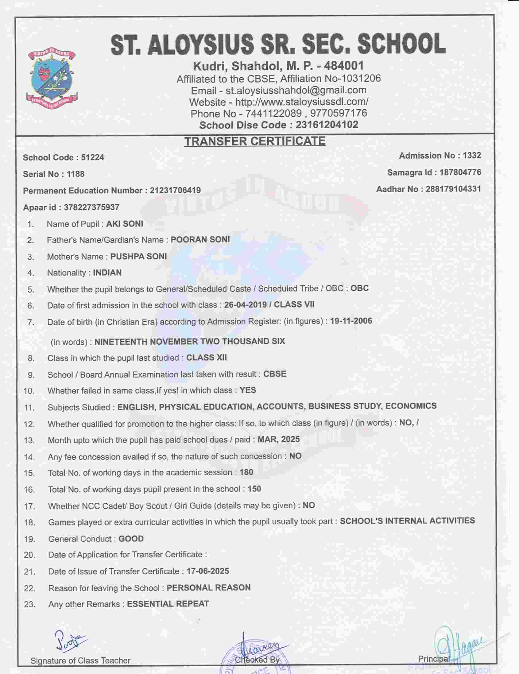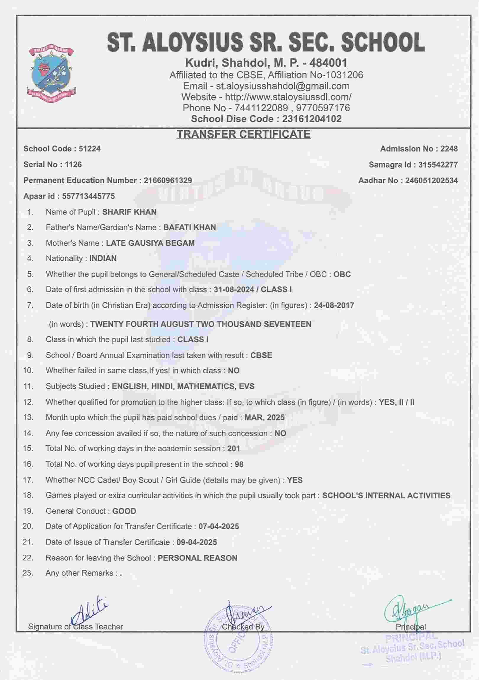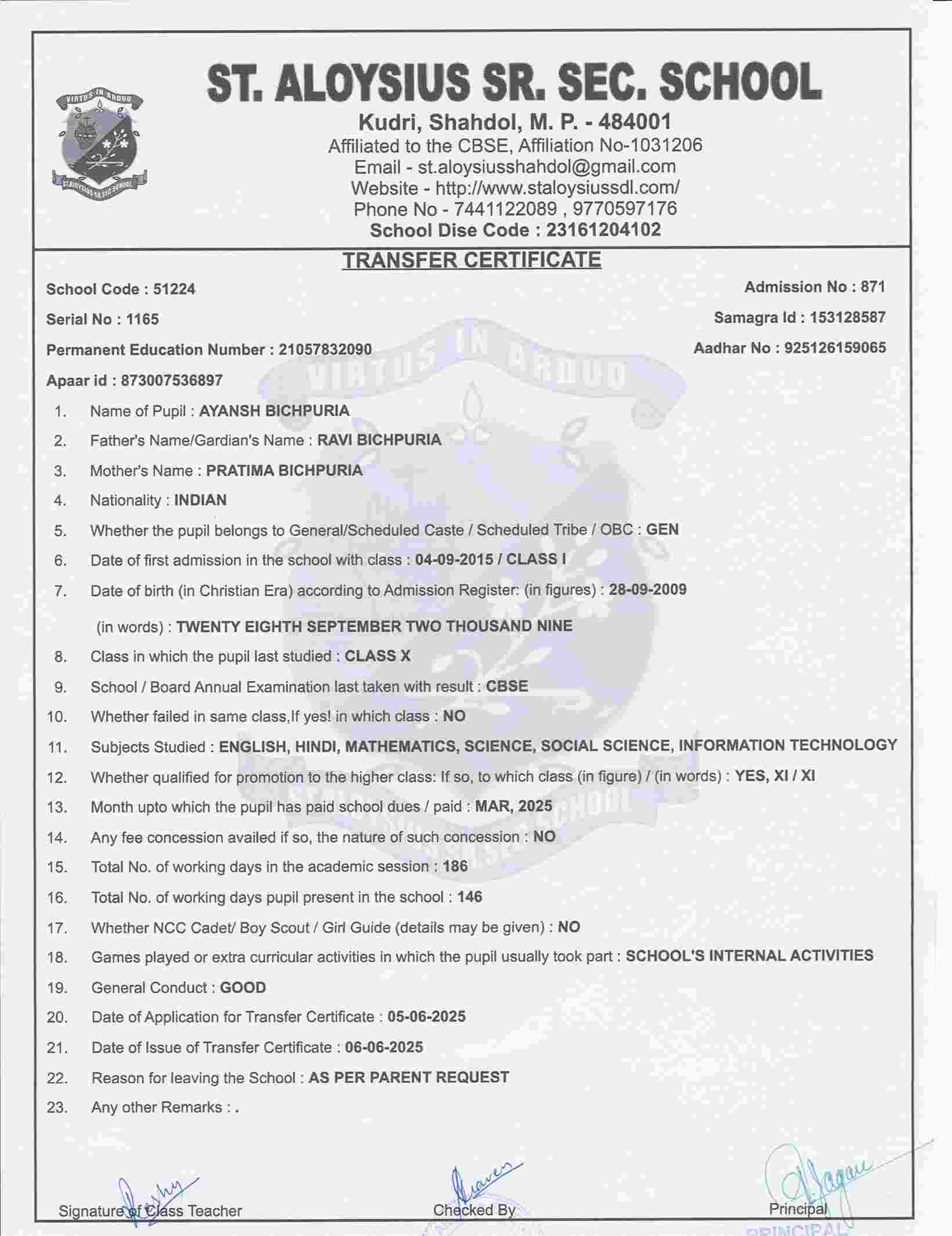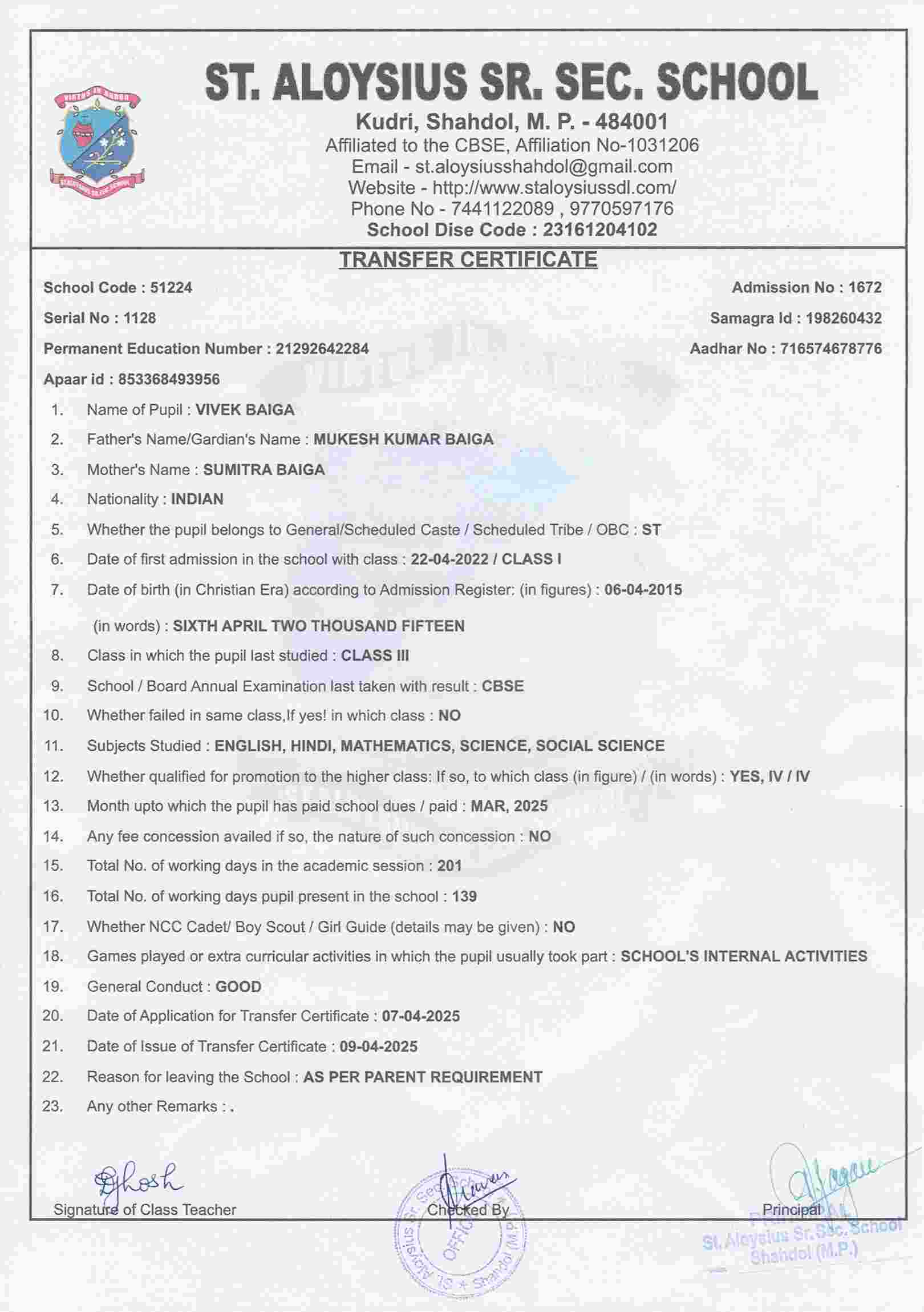 AFFILIATION NUMBER TRANSFER CERTIFICATE SCHOOL CODE