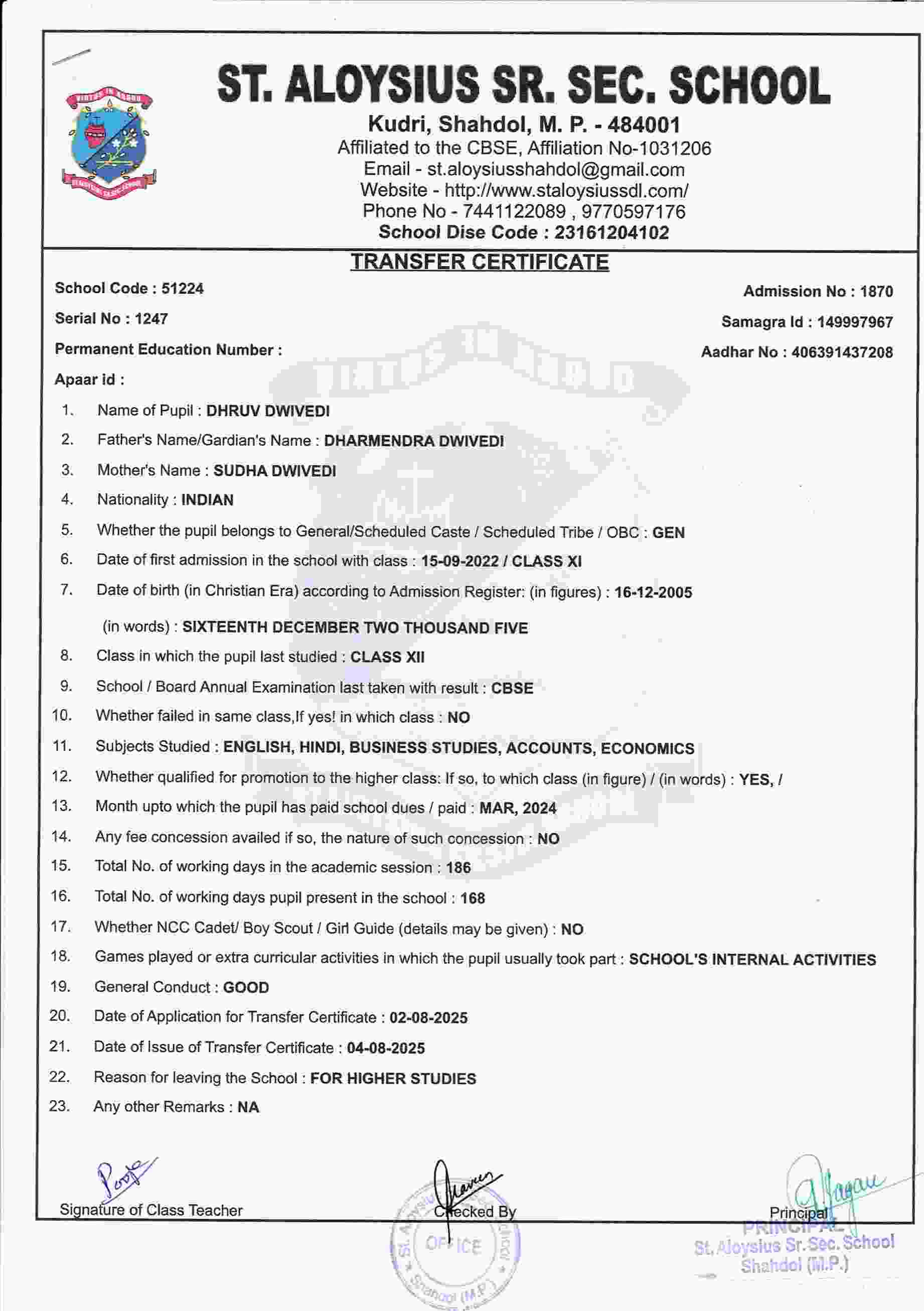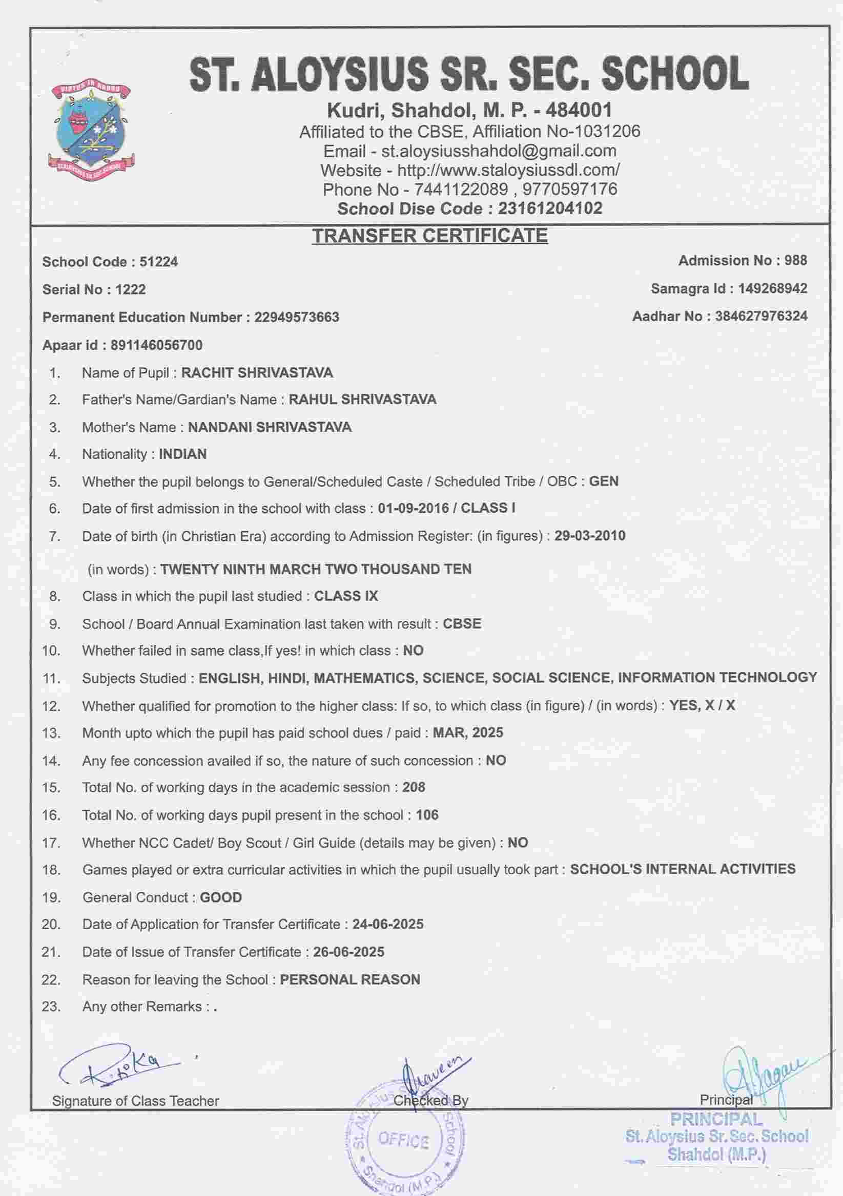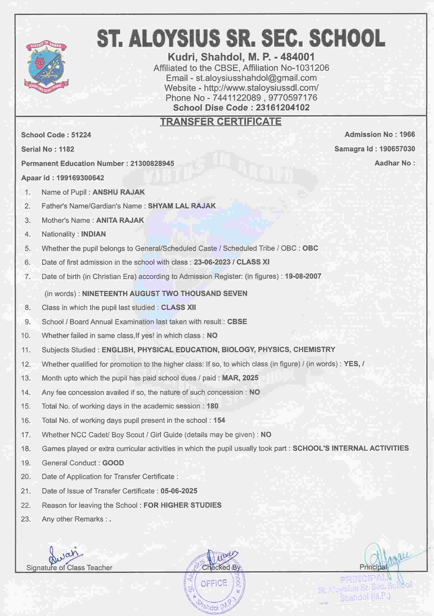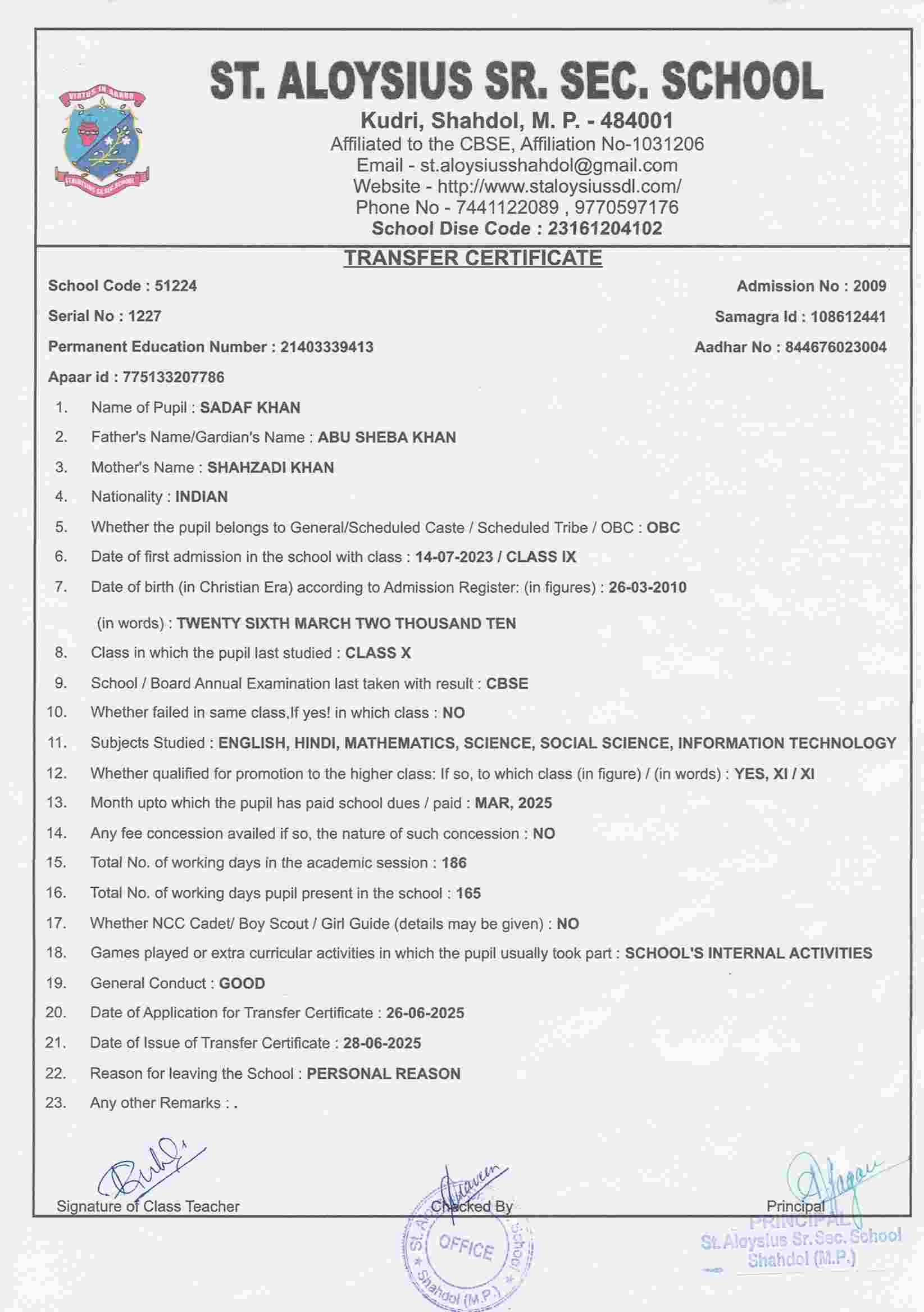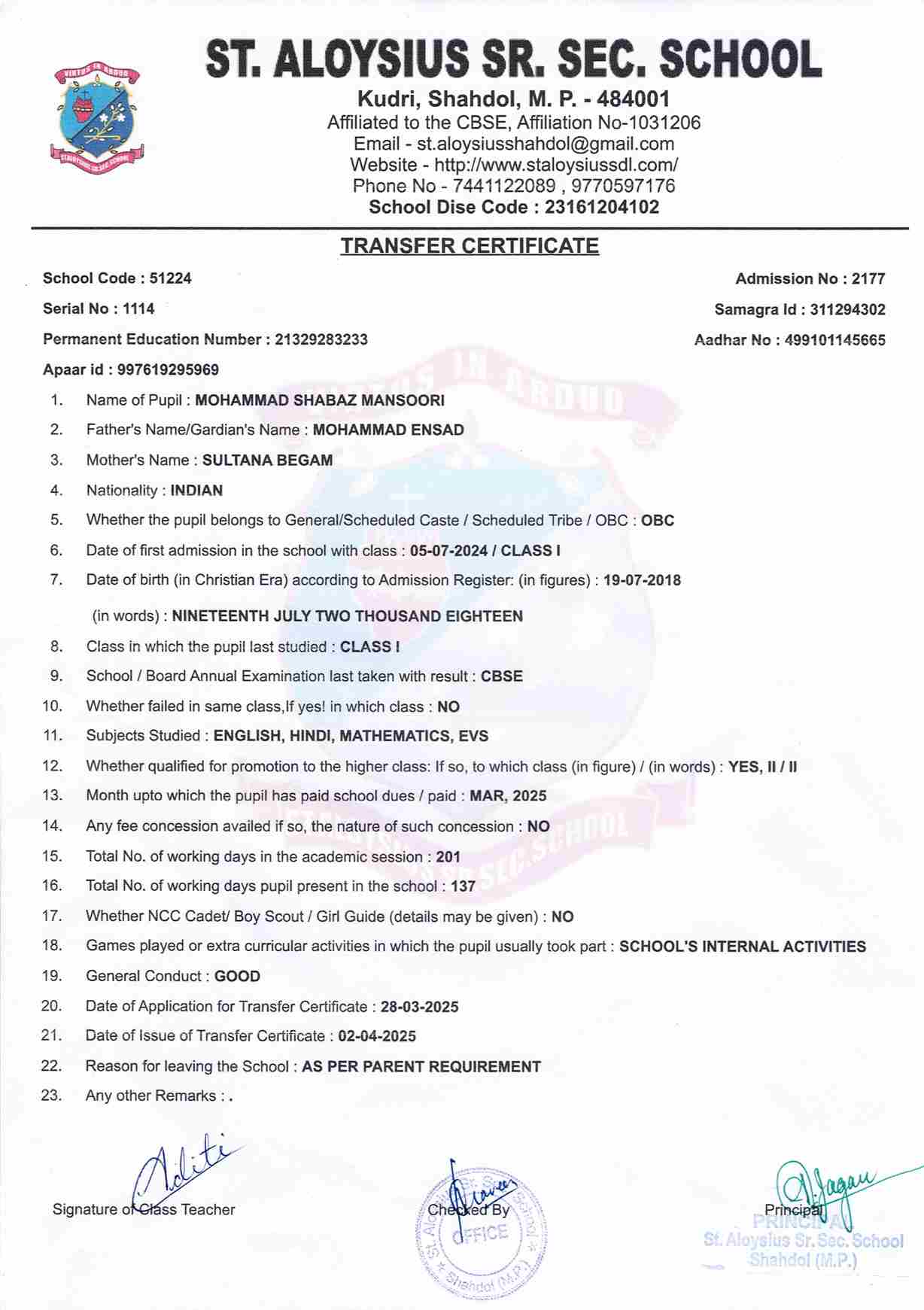 AFFILIATION NUMBER TRANSFER CERTIFICATE SCHOOL CODE