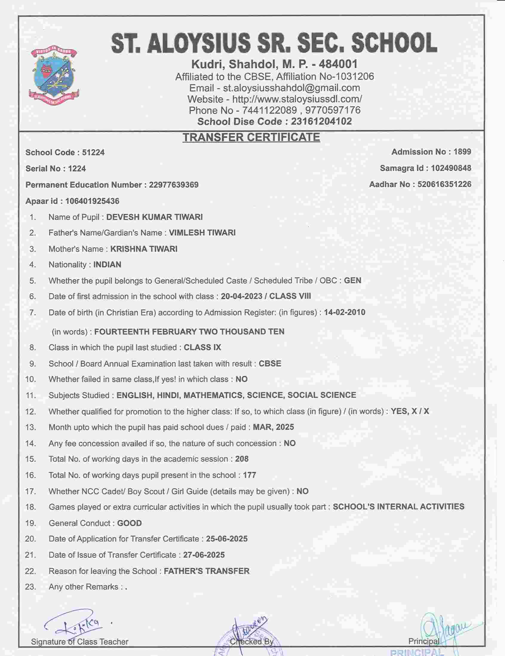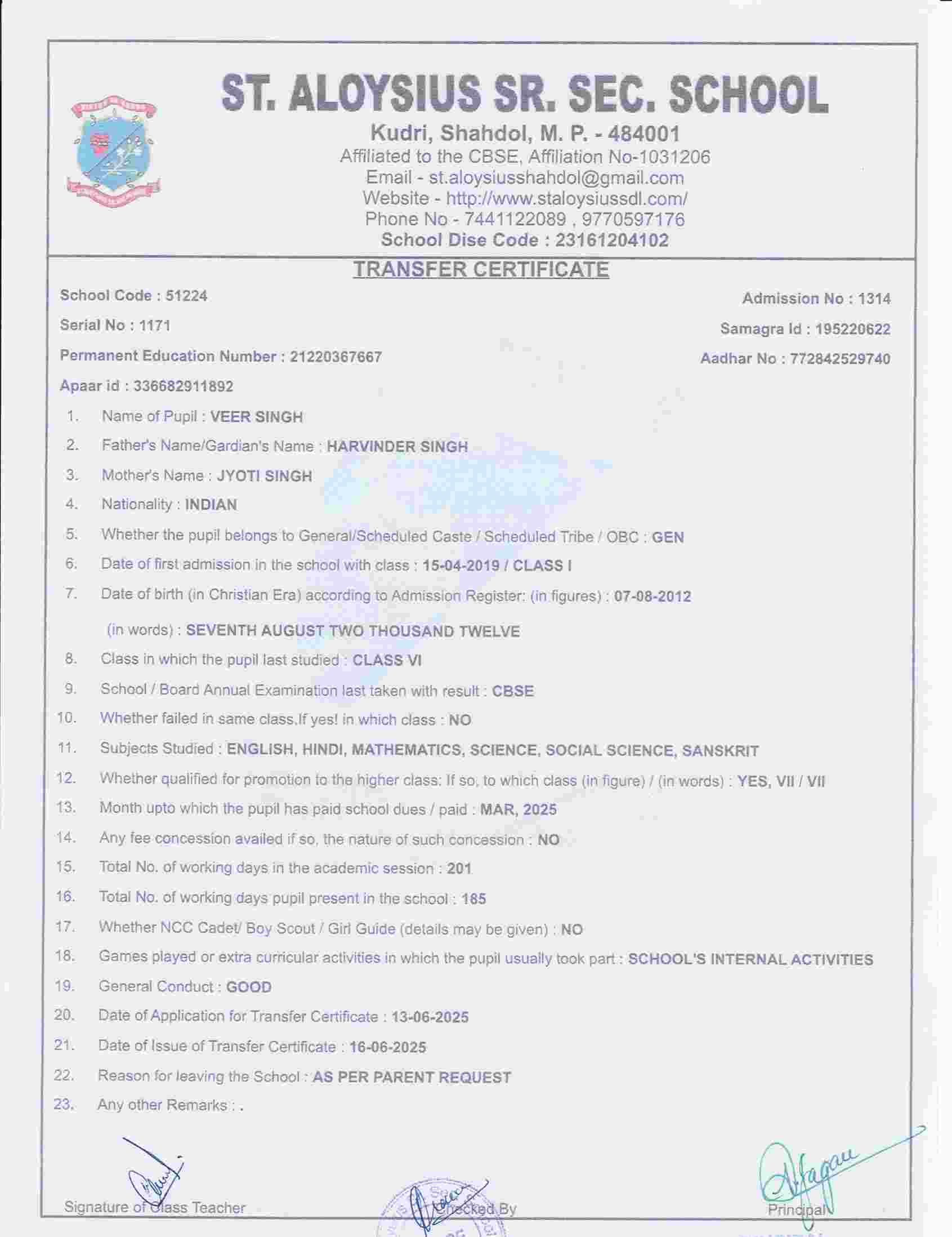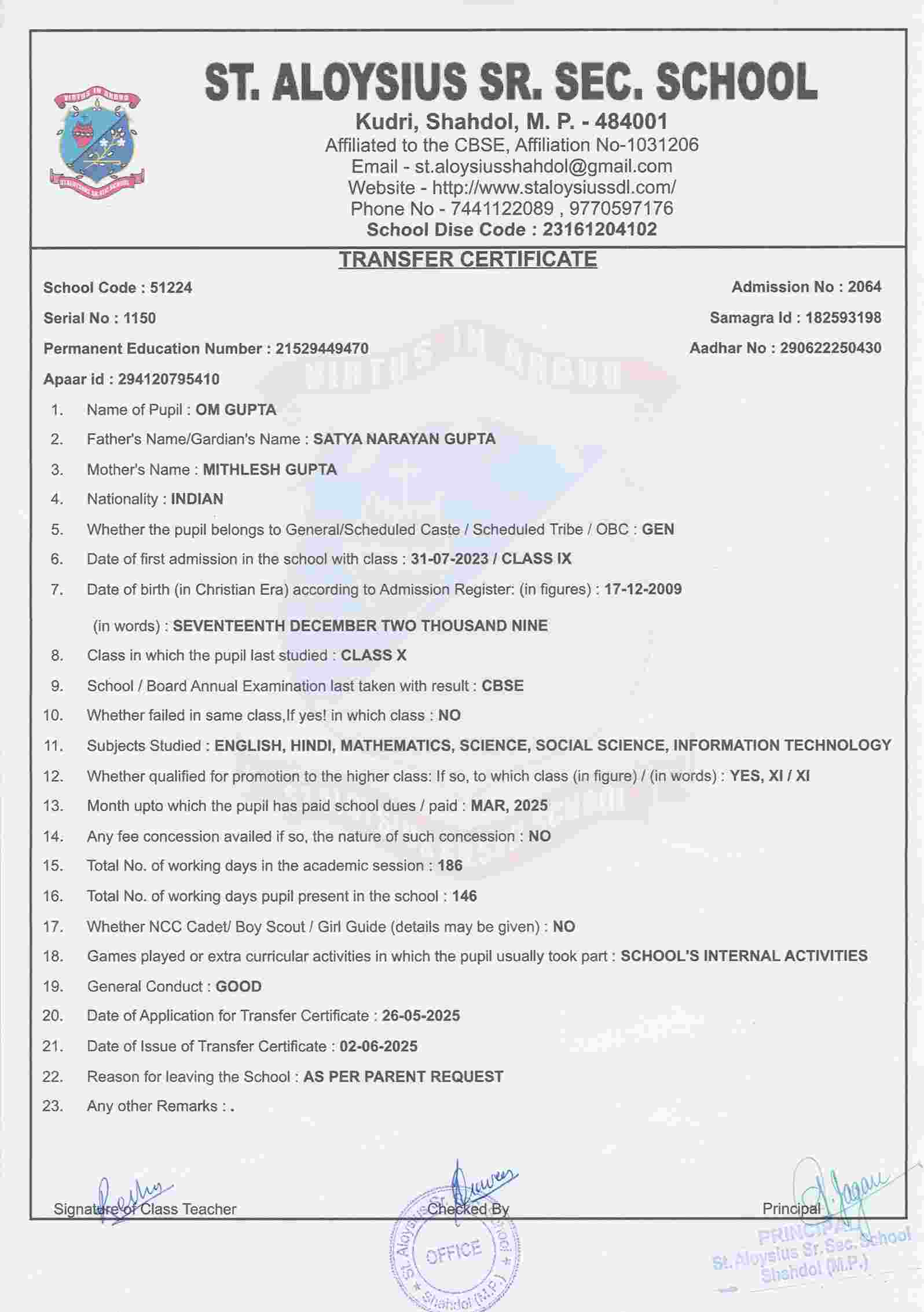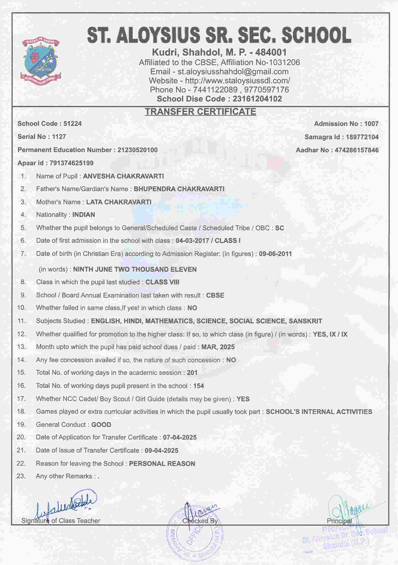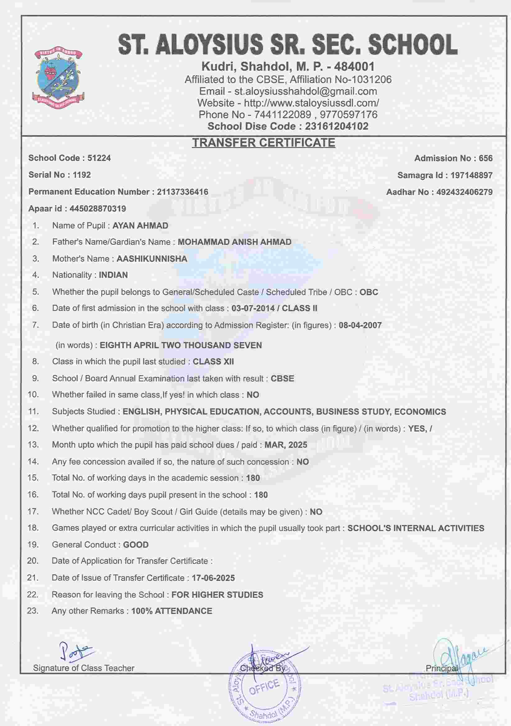AFFILIATION NUMBER TRANSFER CERTIFICATE SCHOOL CODE