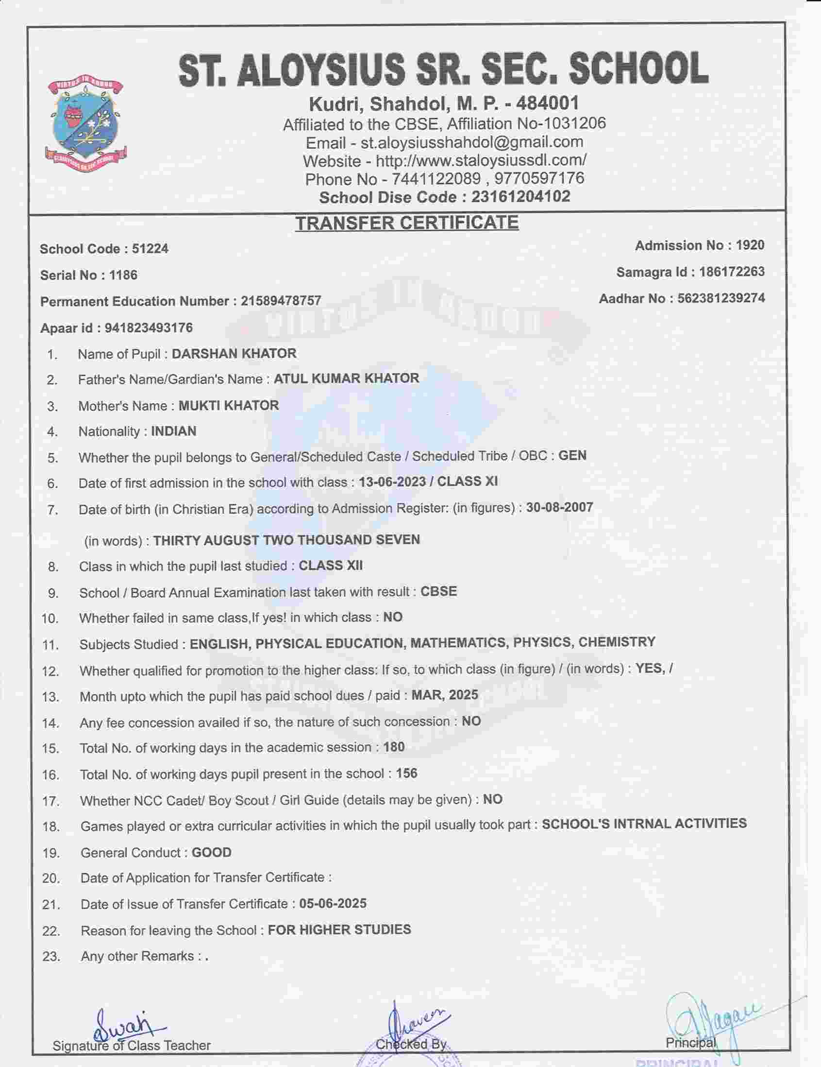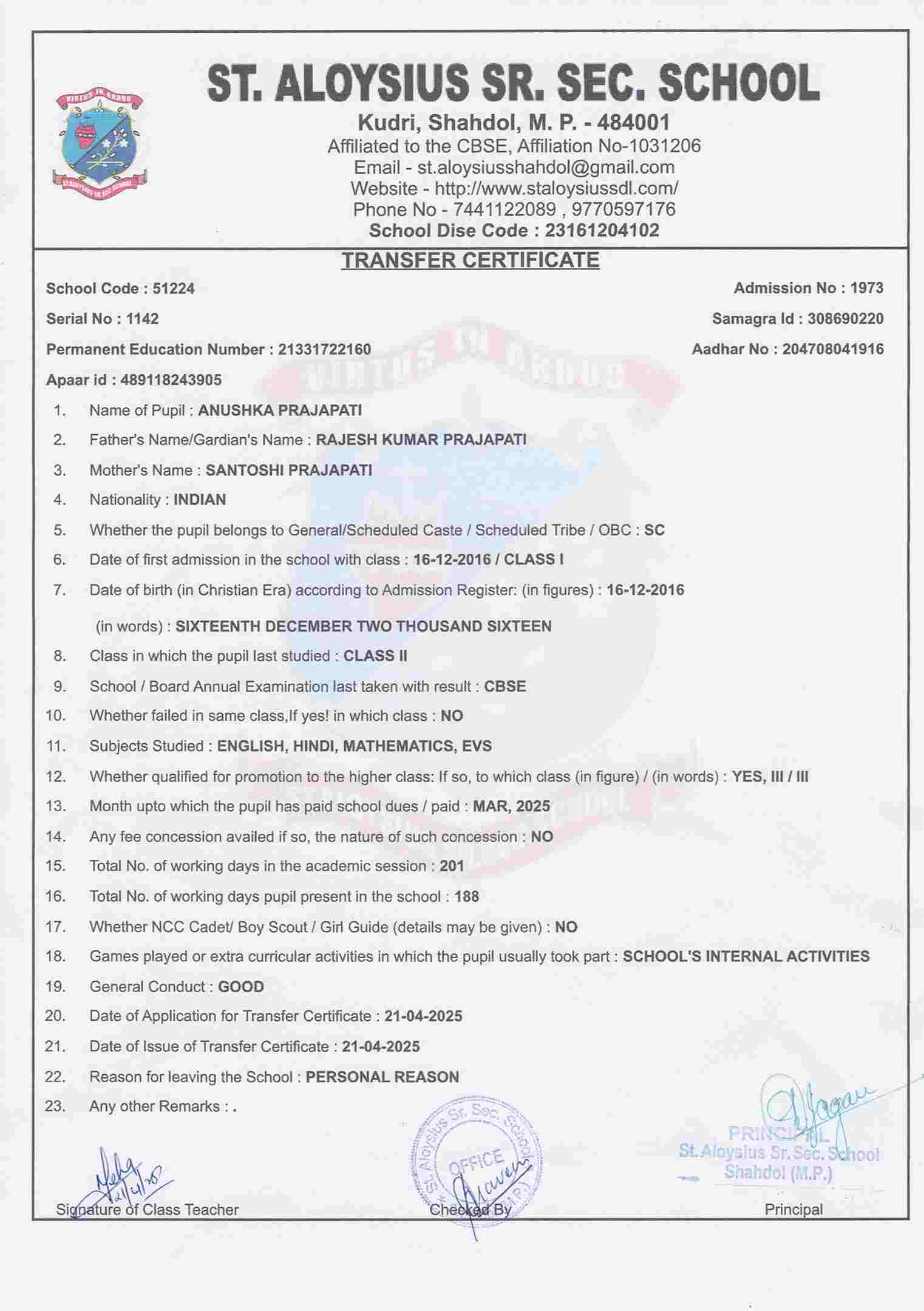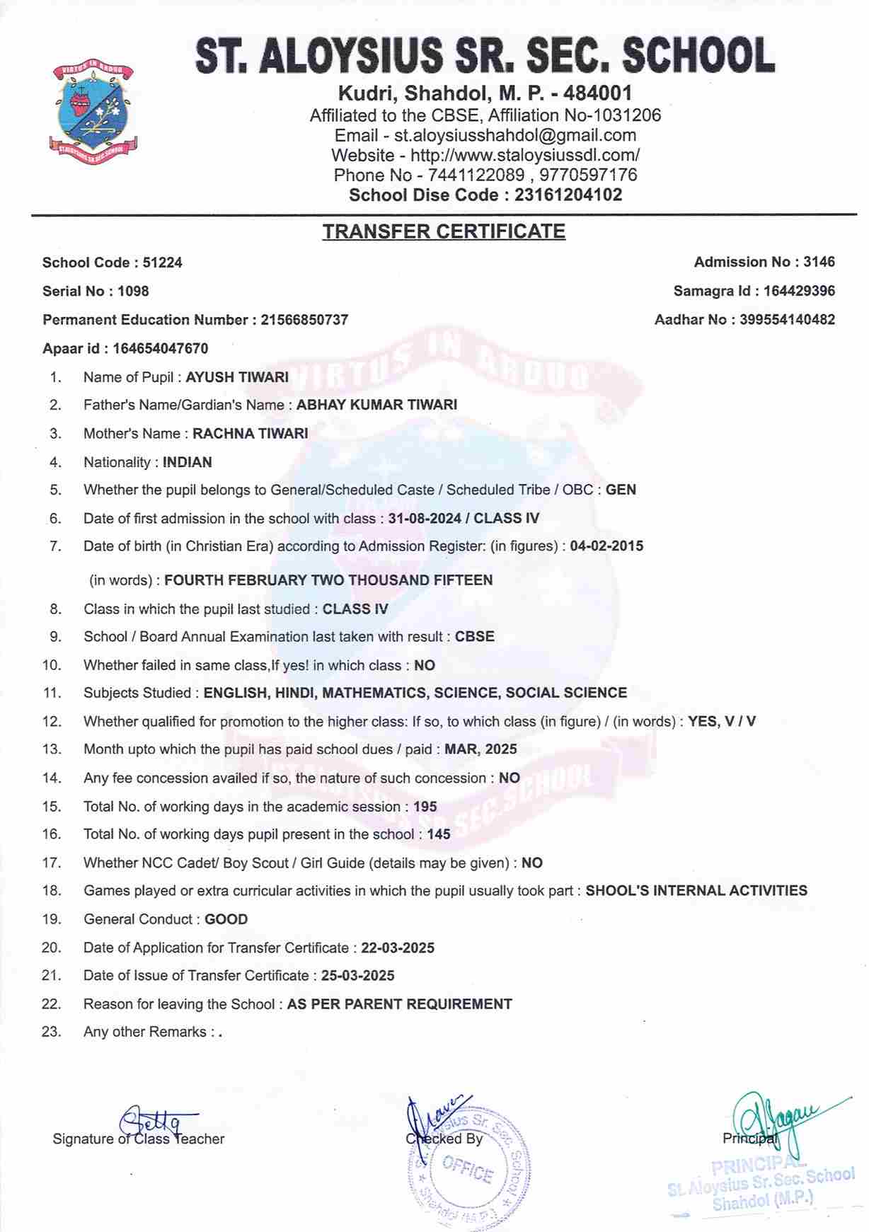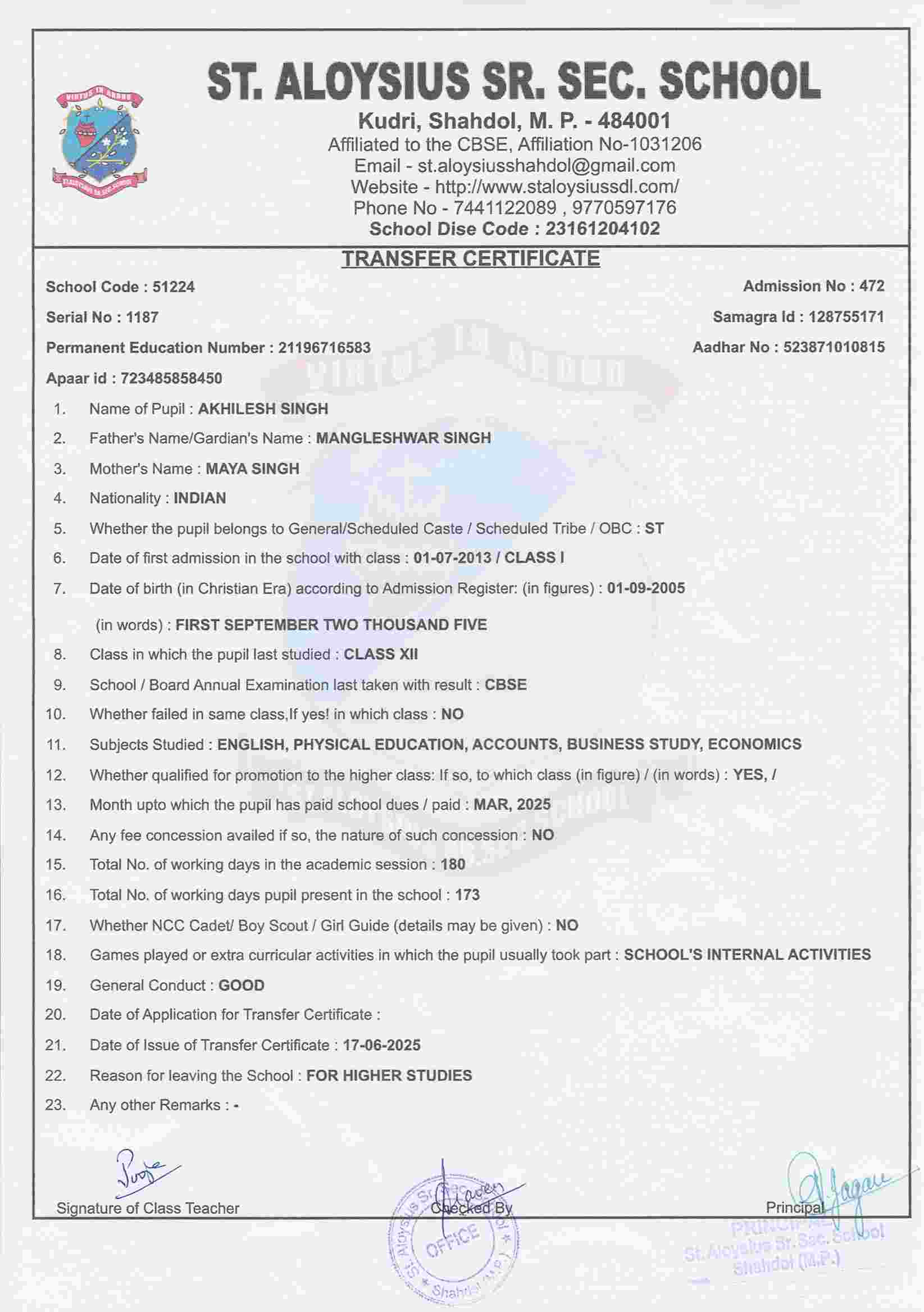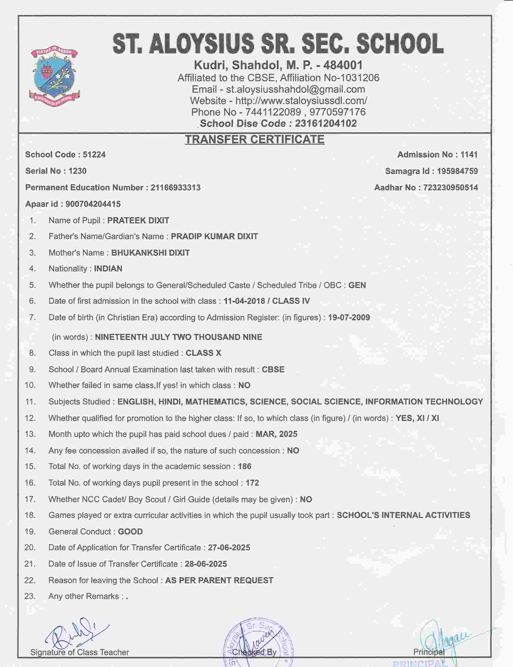 AFFILIATION NUMBER TRANSFER CERTIFICATE SCHOOL CODE