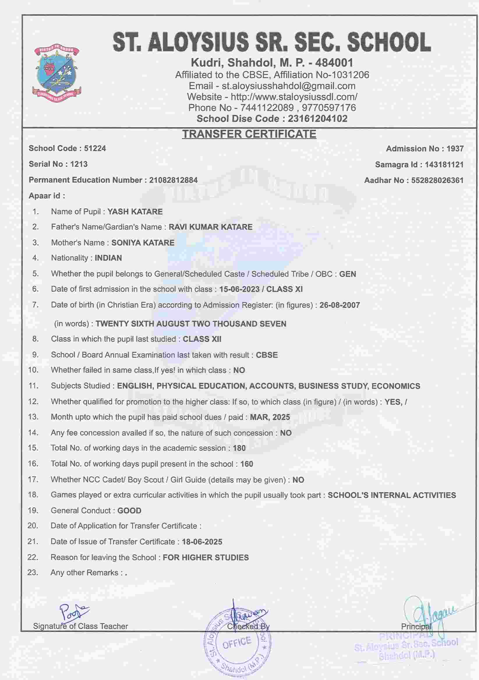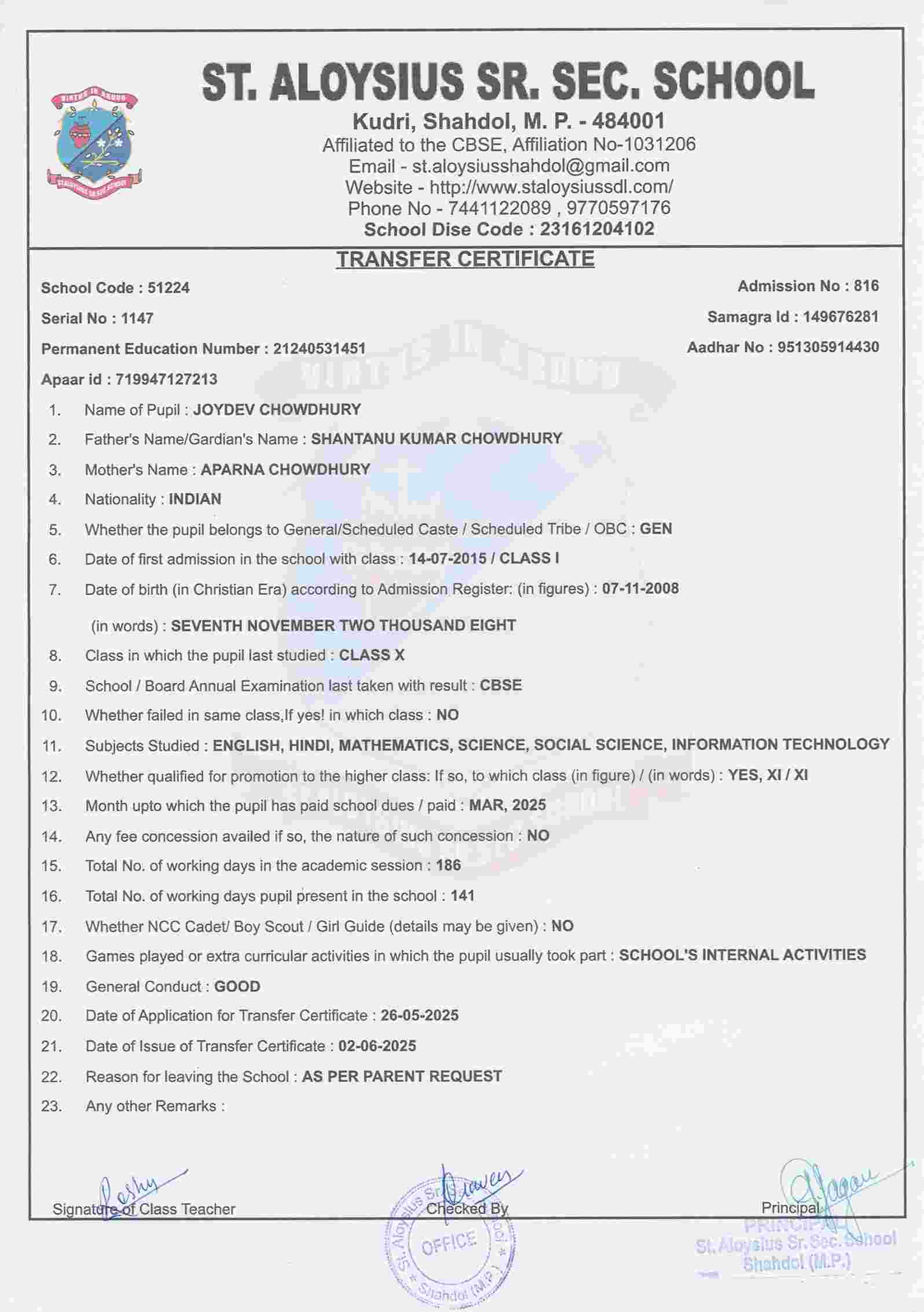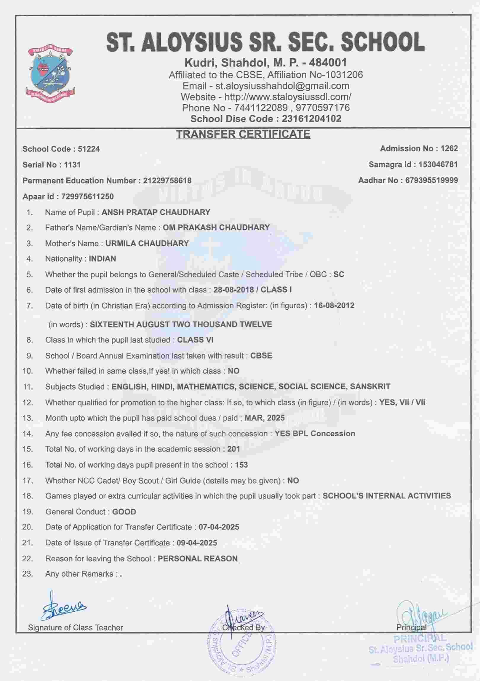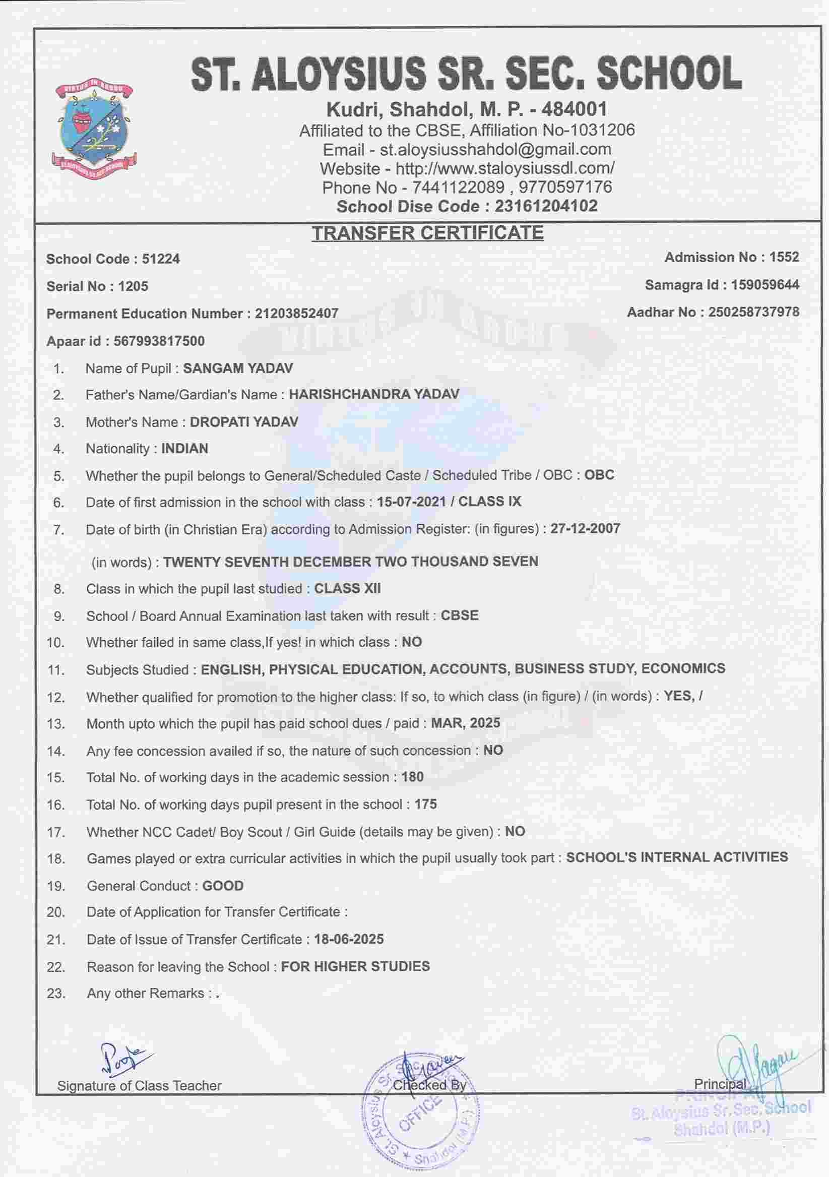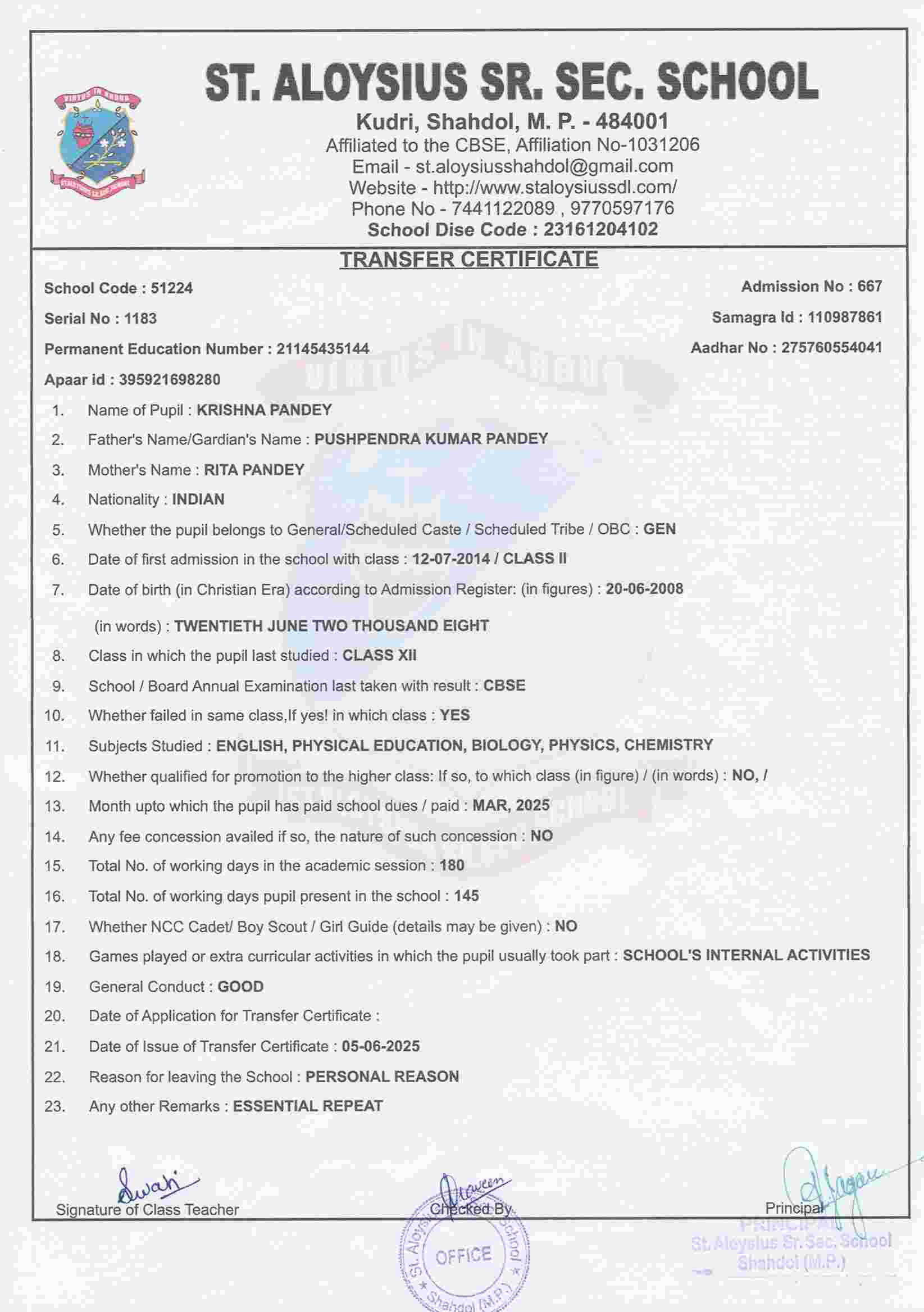 AFFILIATION NUMBER TRANSFER CERTIFICATE SCHOOL CODE