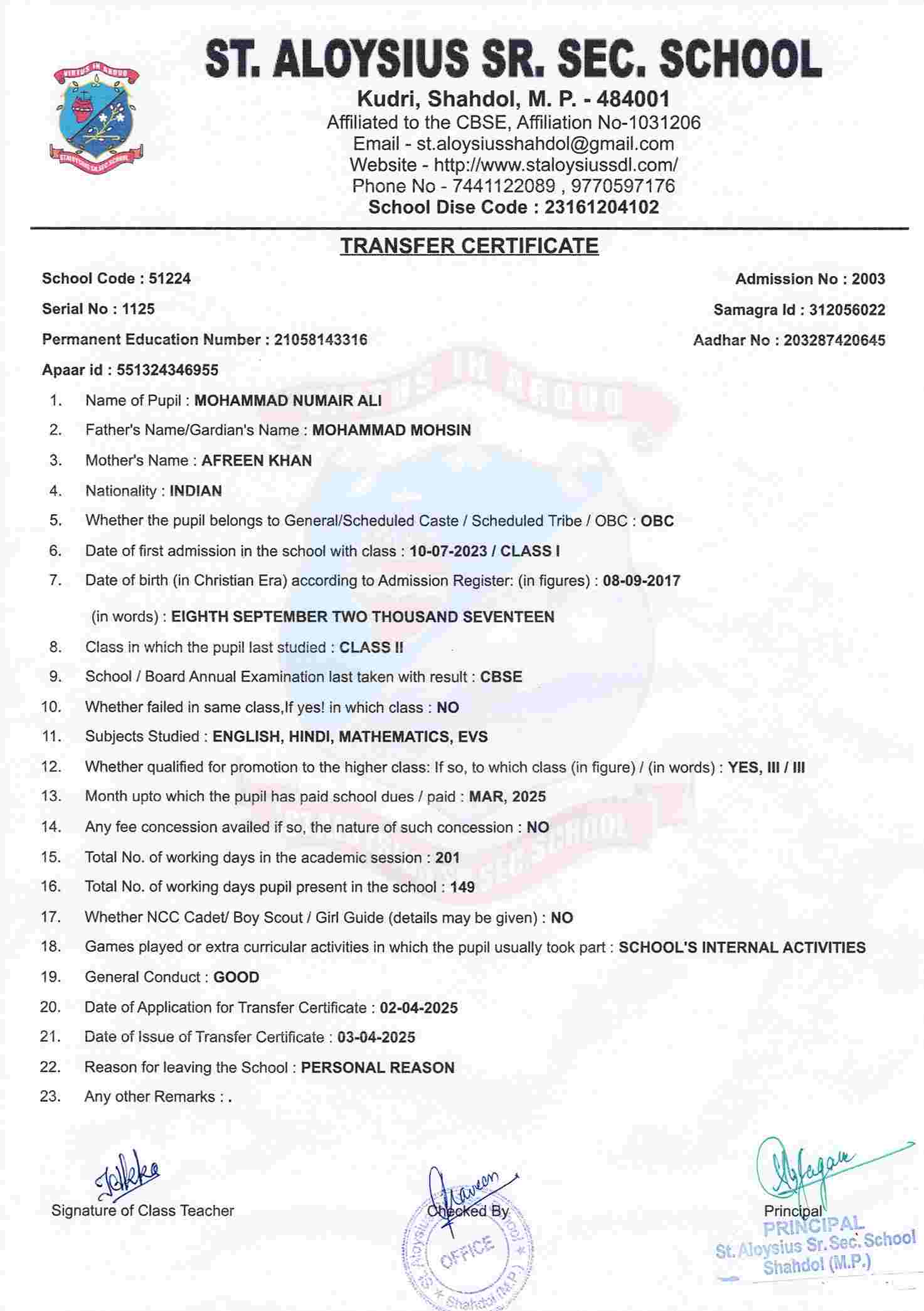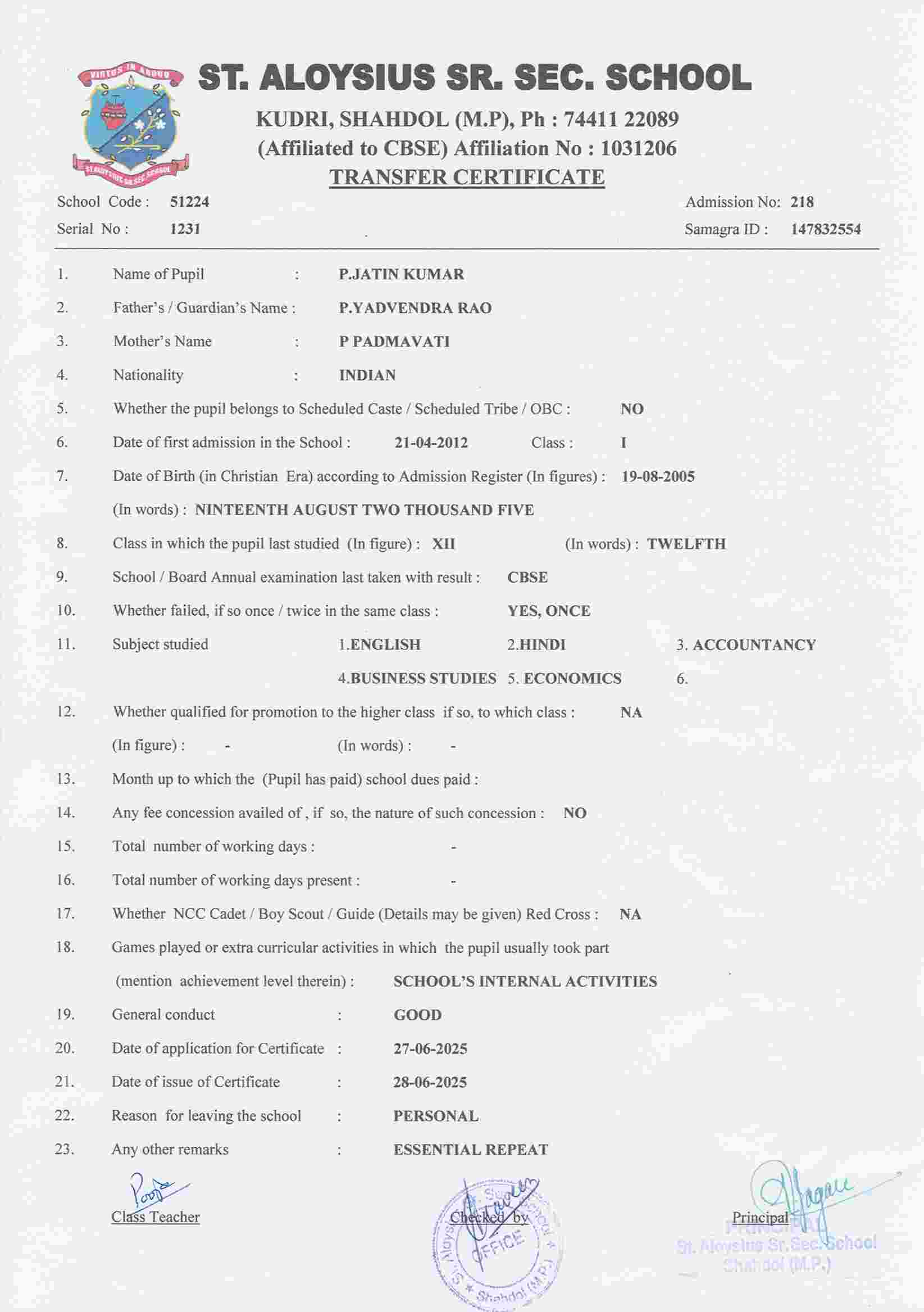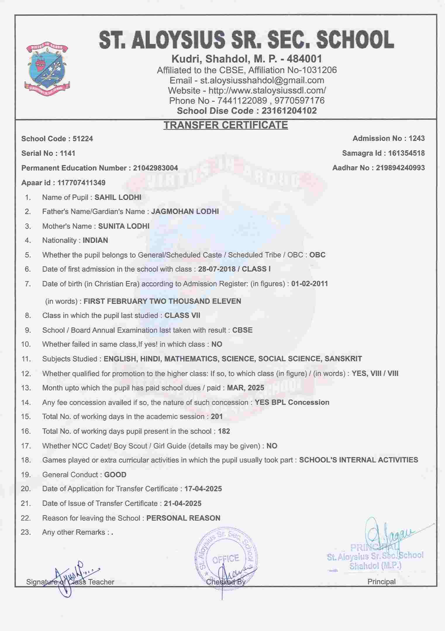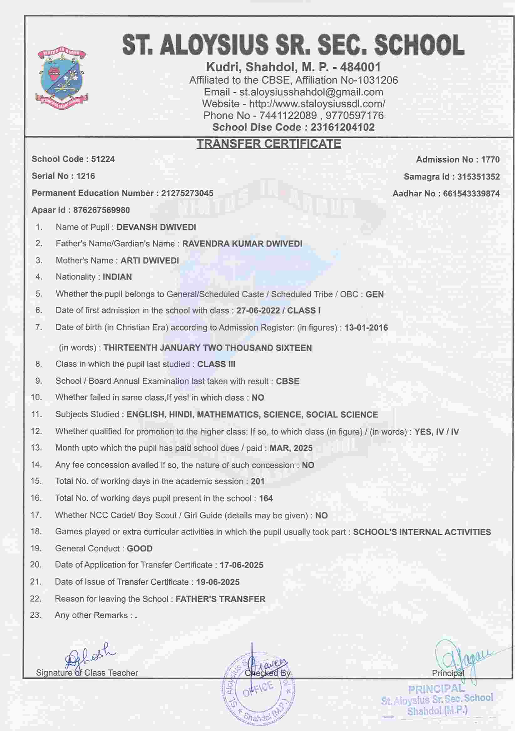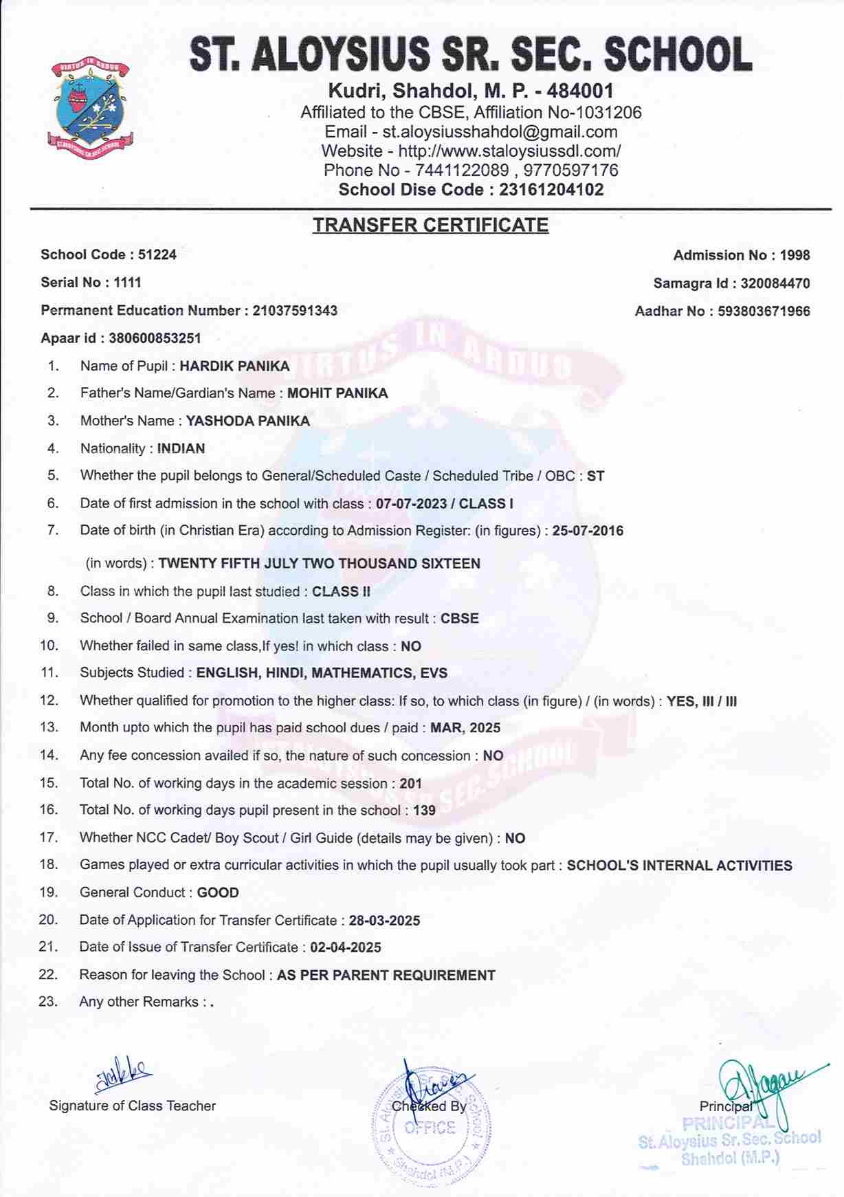 AFFILIATION NUMBER TRANSFER CERTIFICATE SCHOOL CODE