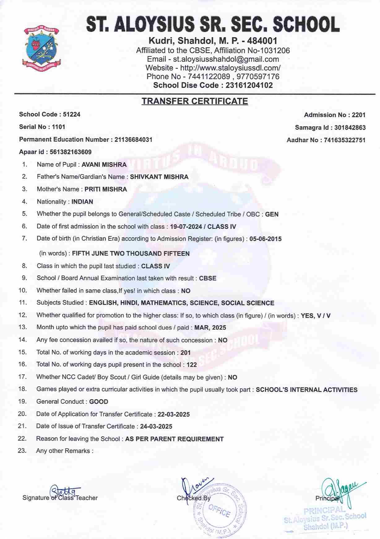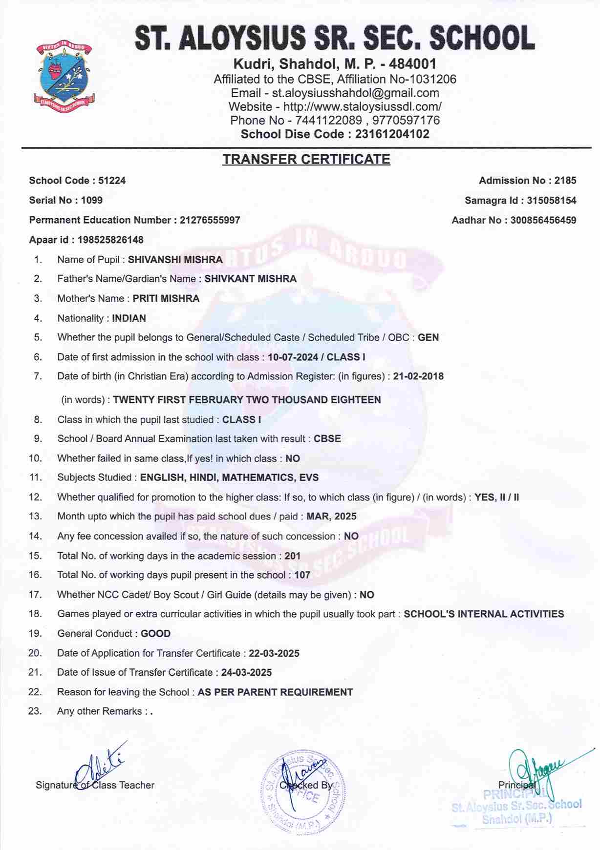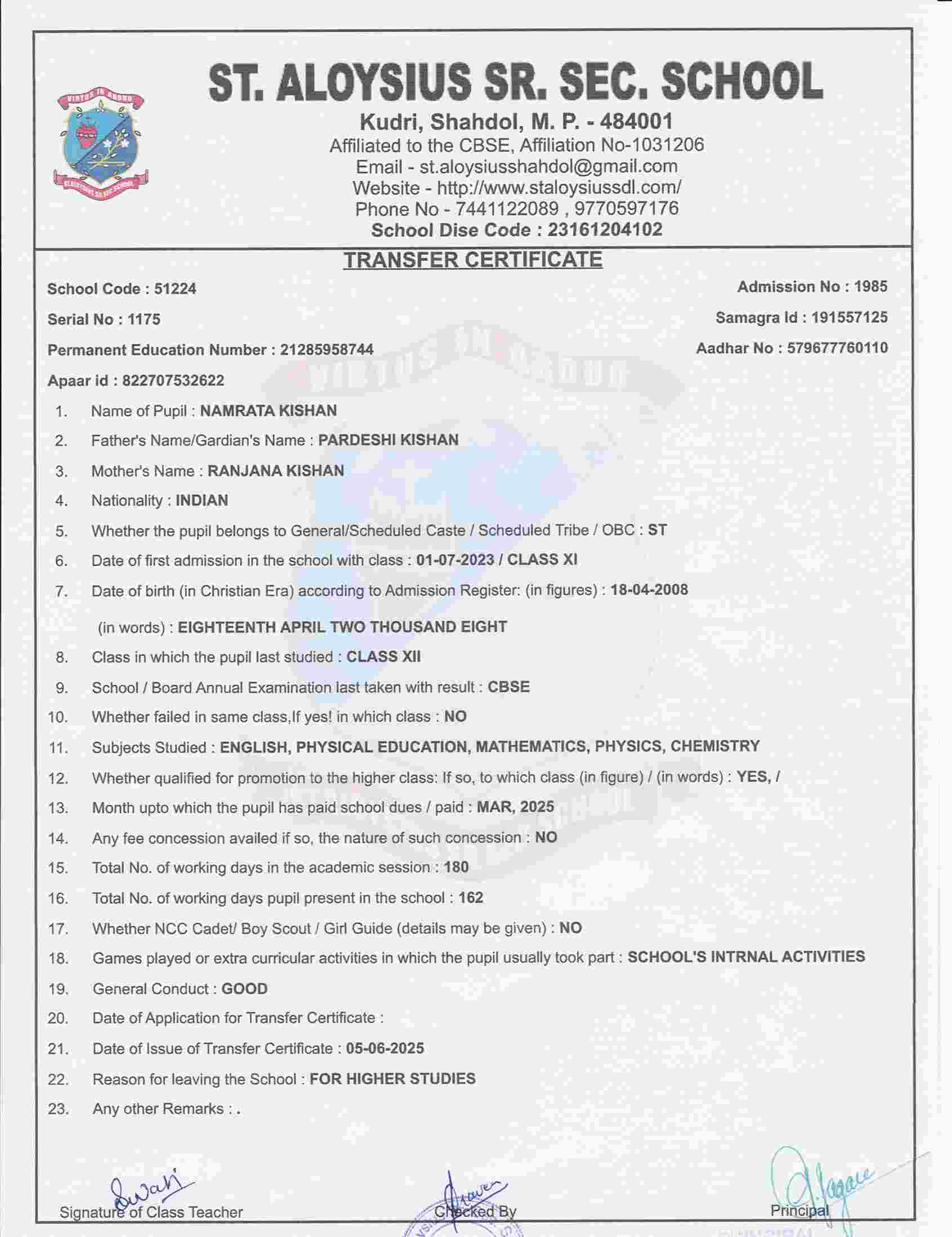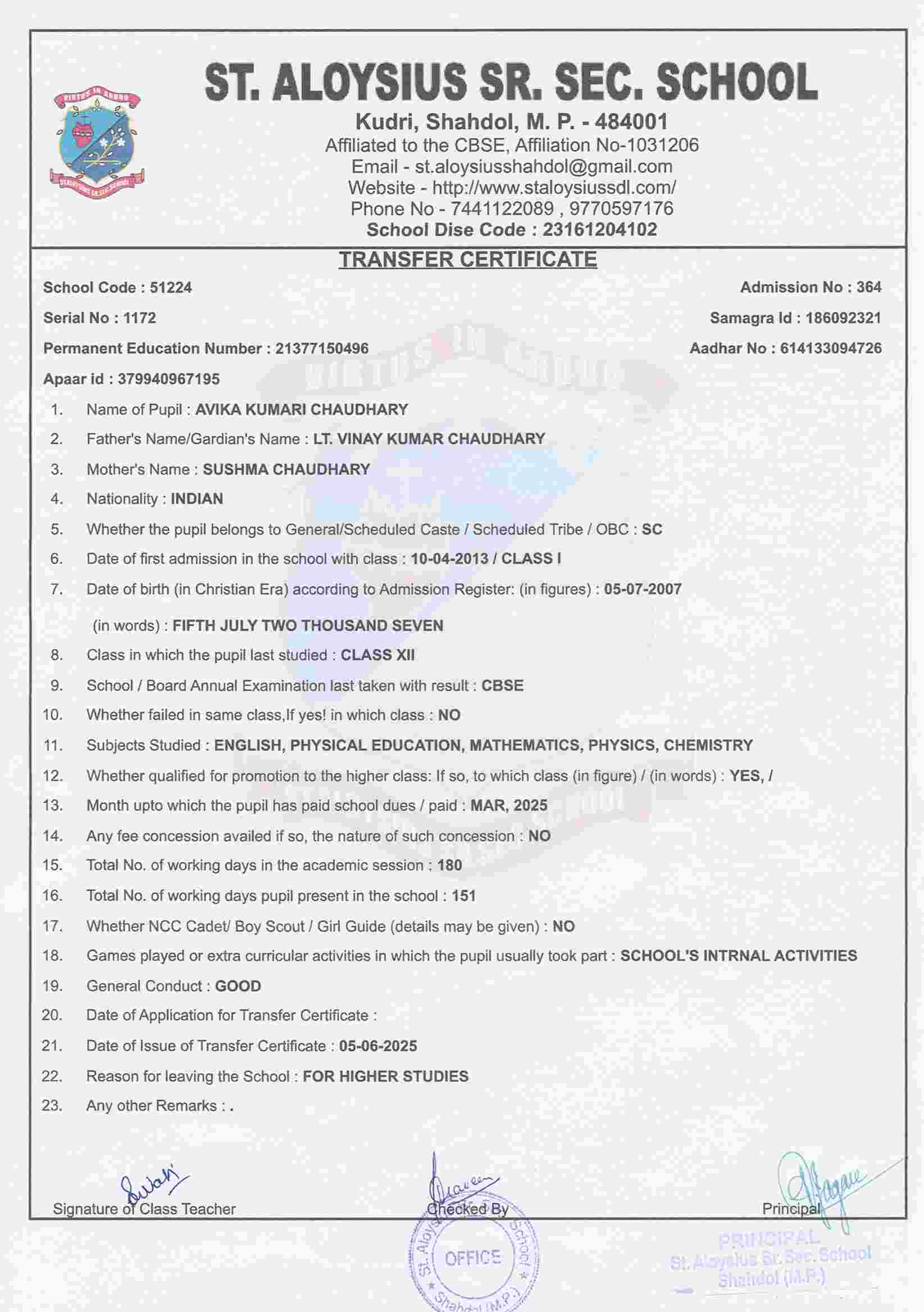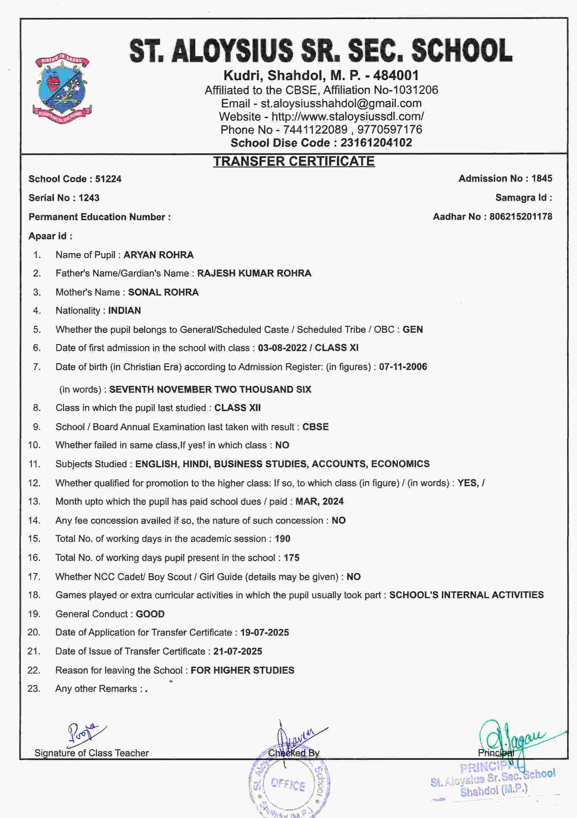 AFFILIATION NUMBER TRANSFER CERTIFICATE SCHOOL CODE
