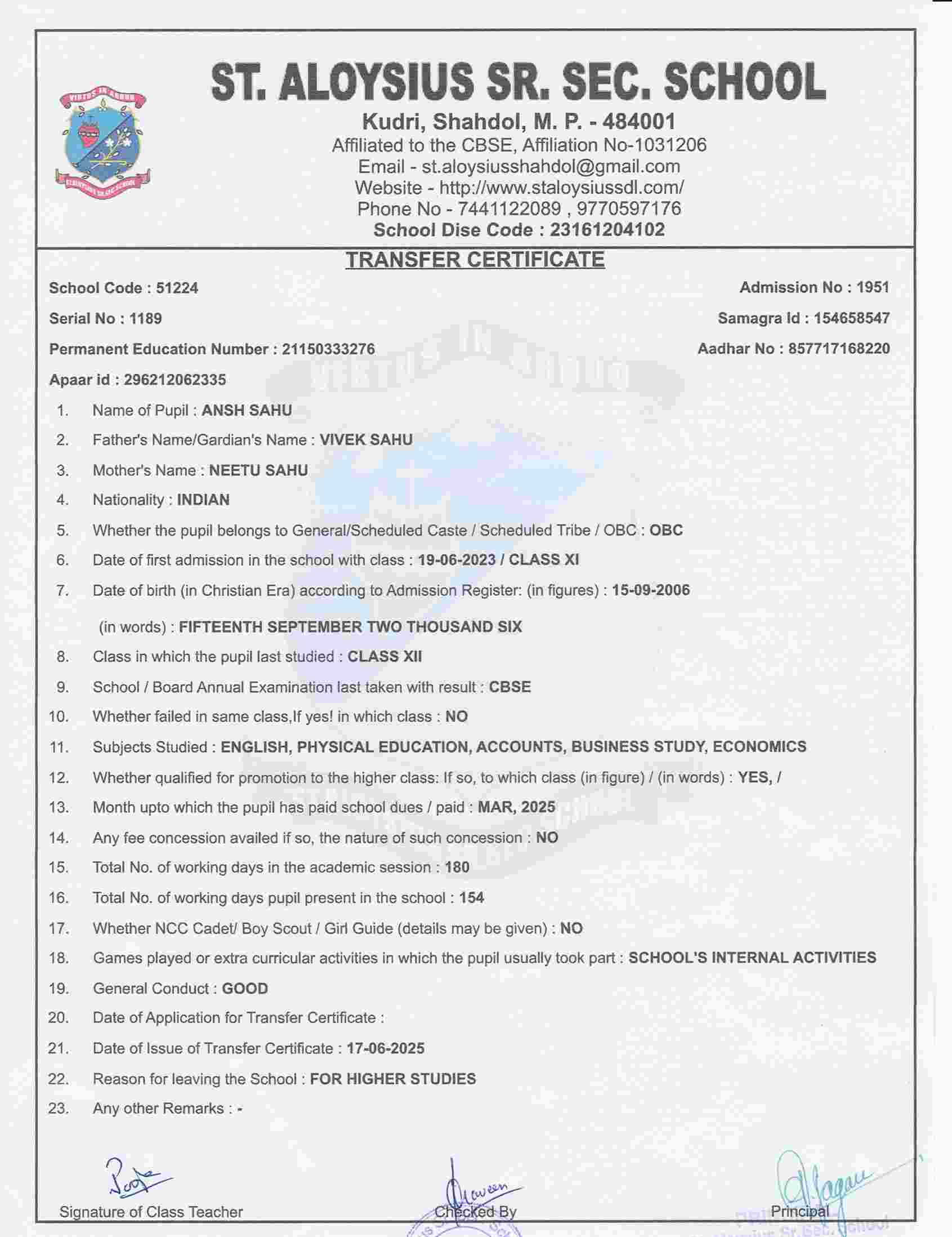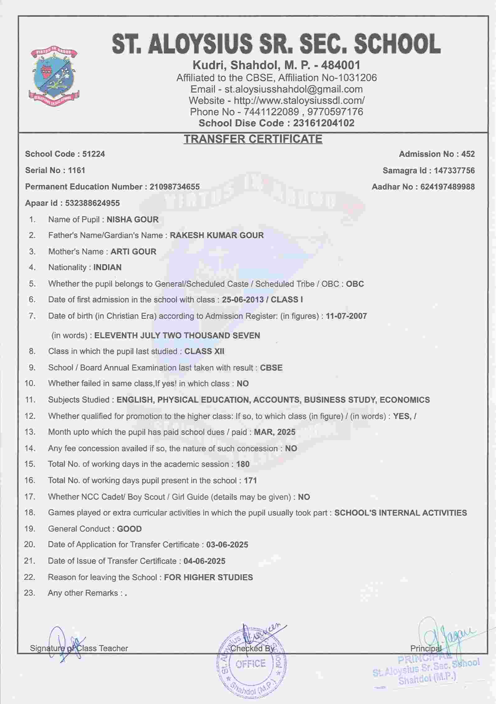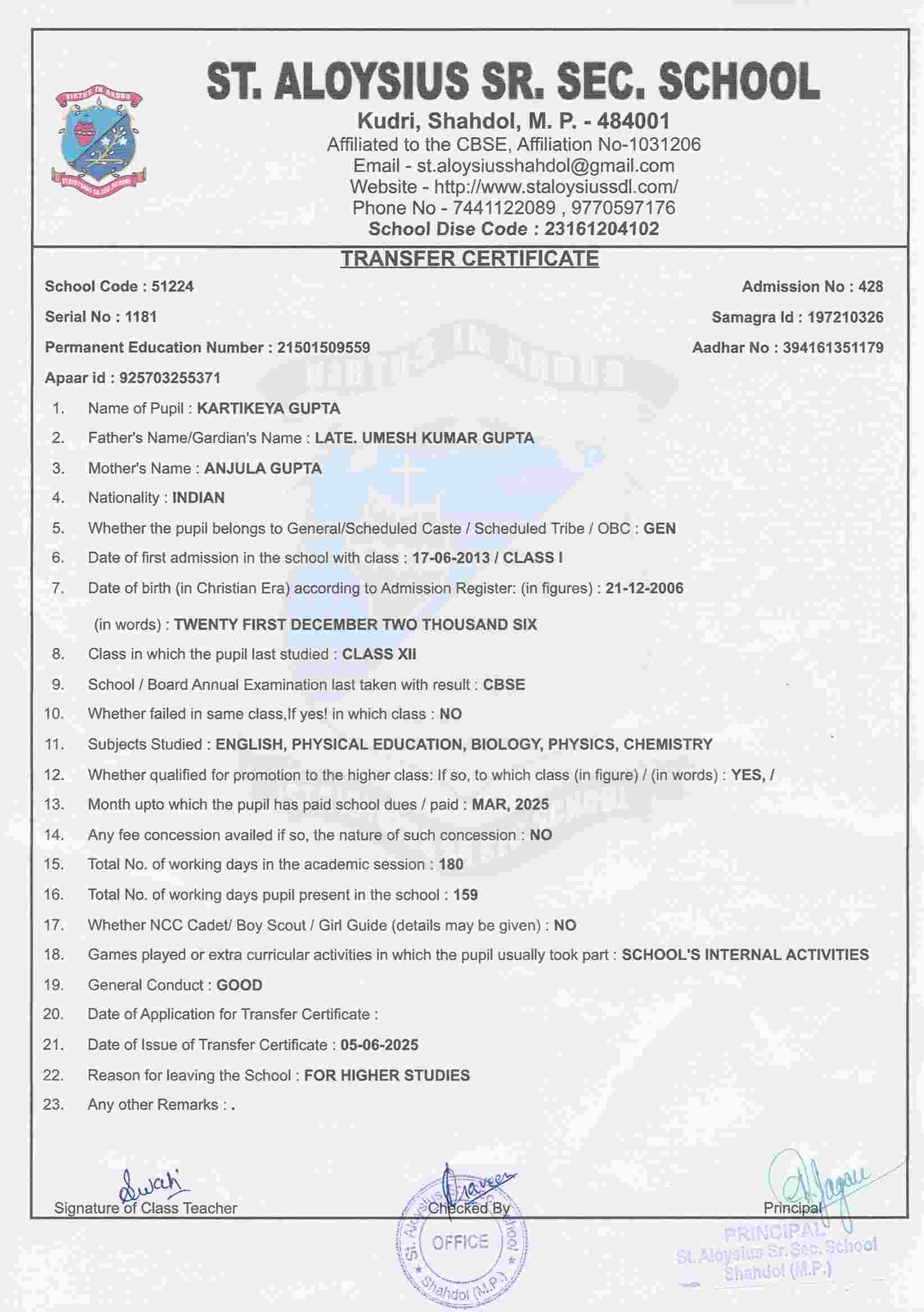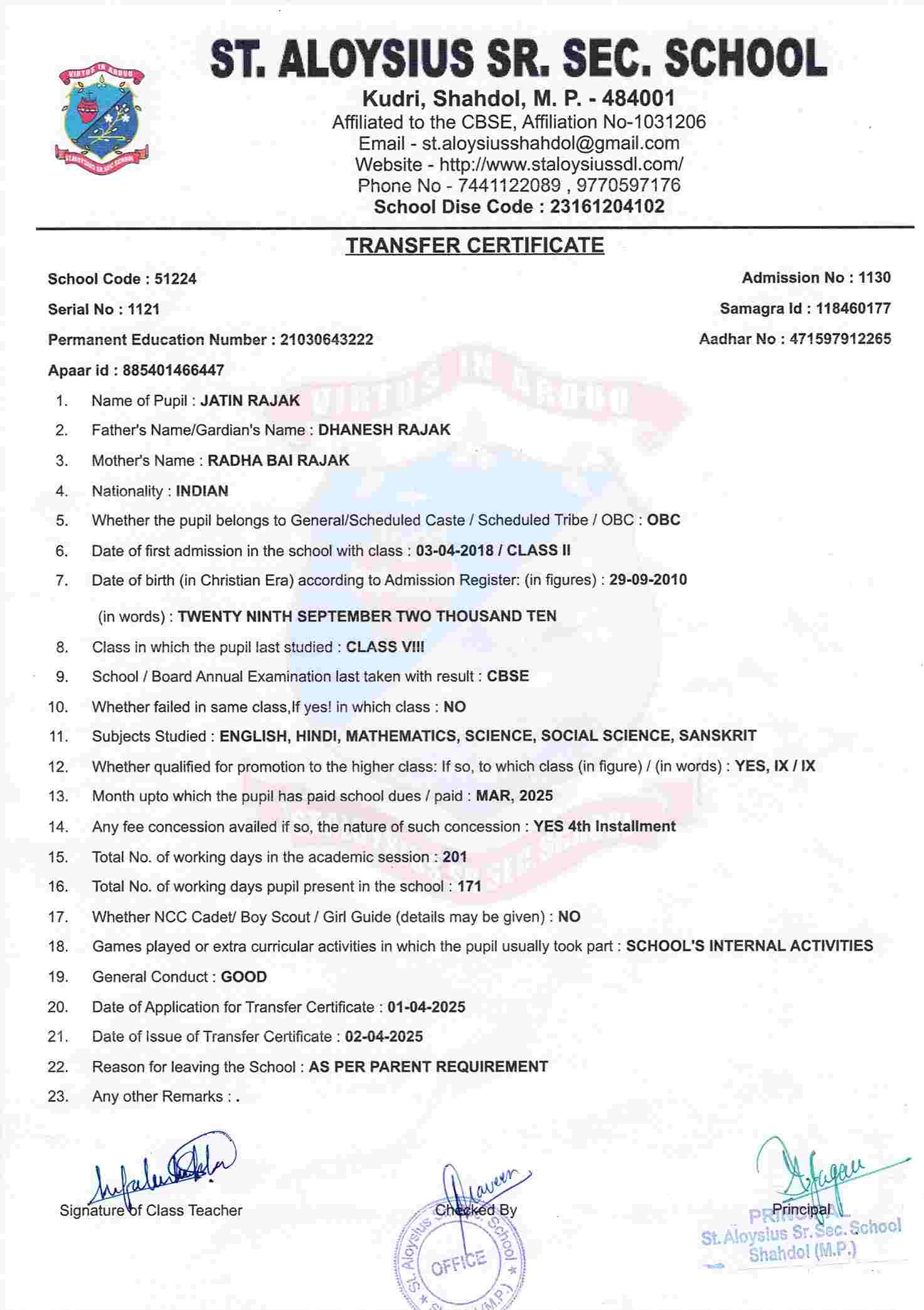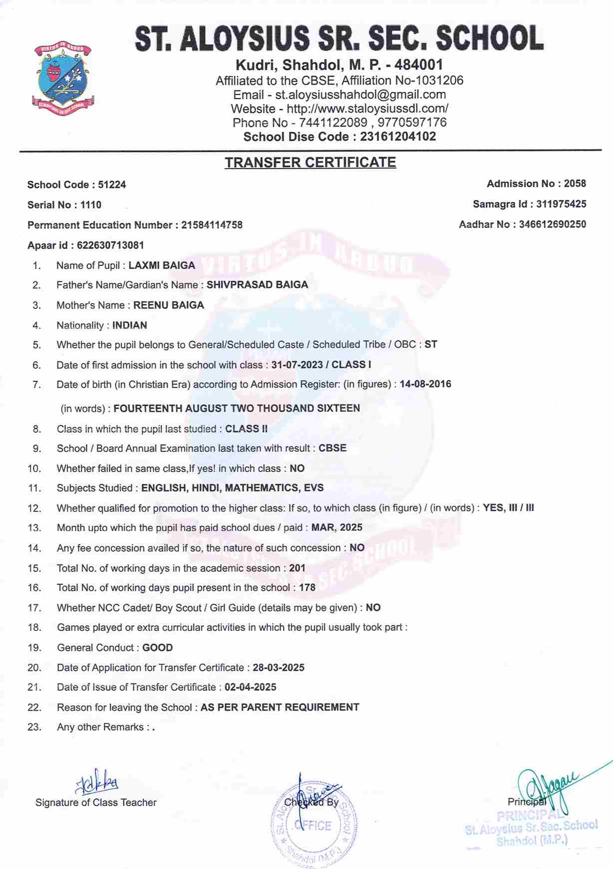 AFFILIATION NUMBER TRANSFER CERTIFICATE SCHOOL CODE