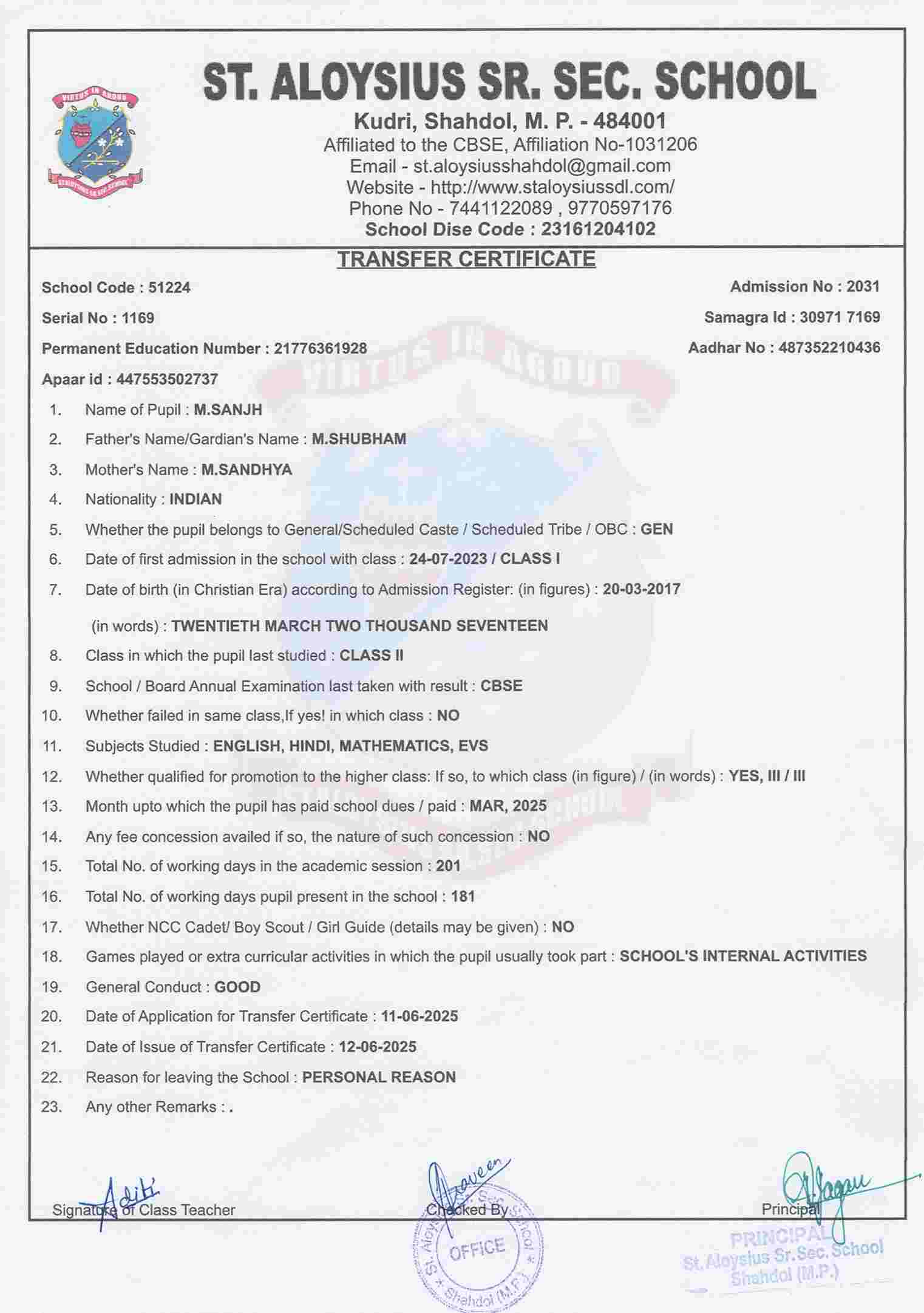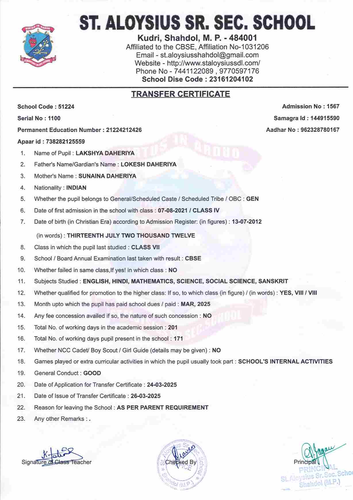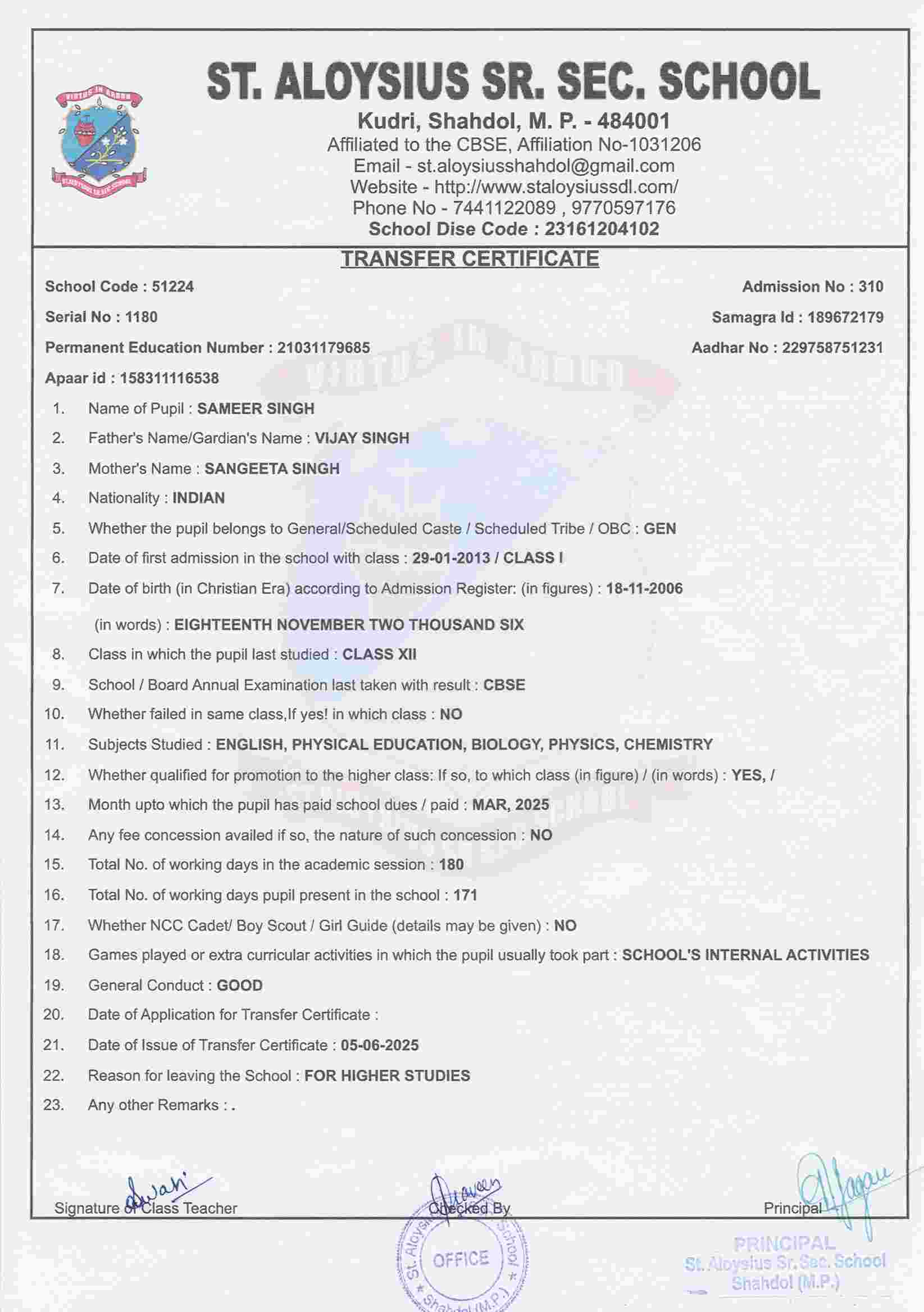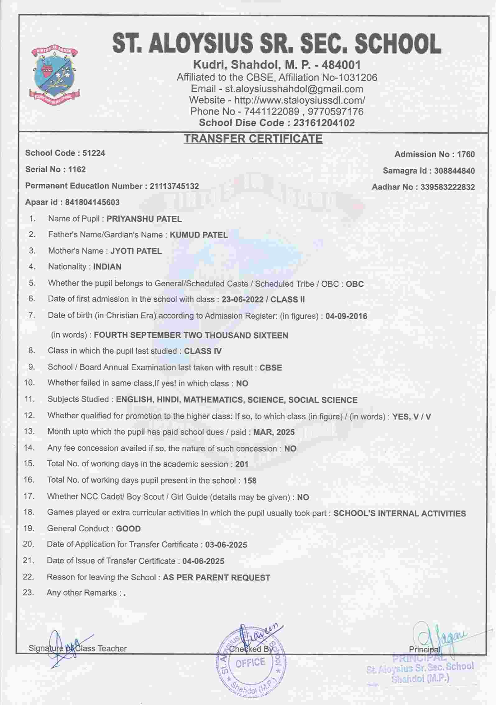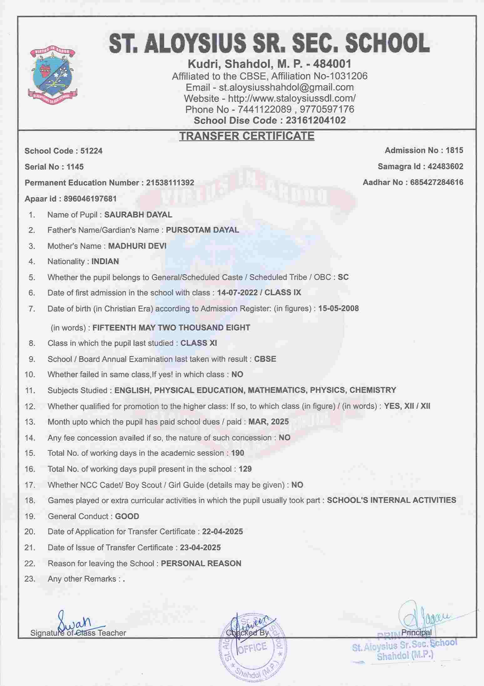 AFFILIATION NUMBER TRANSFER CERTIFICATE SCHOOL CODE