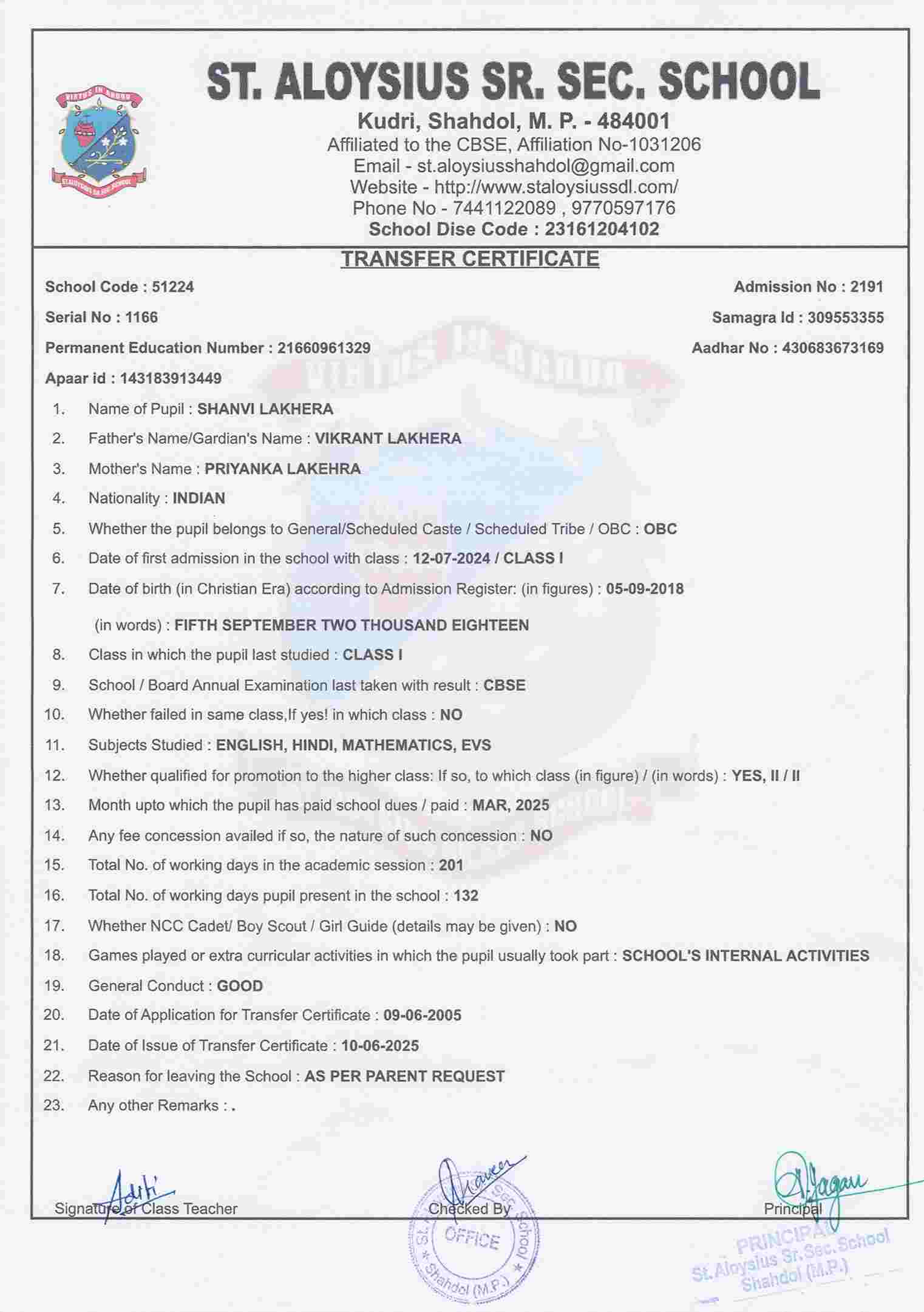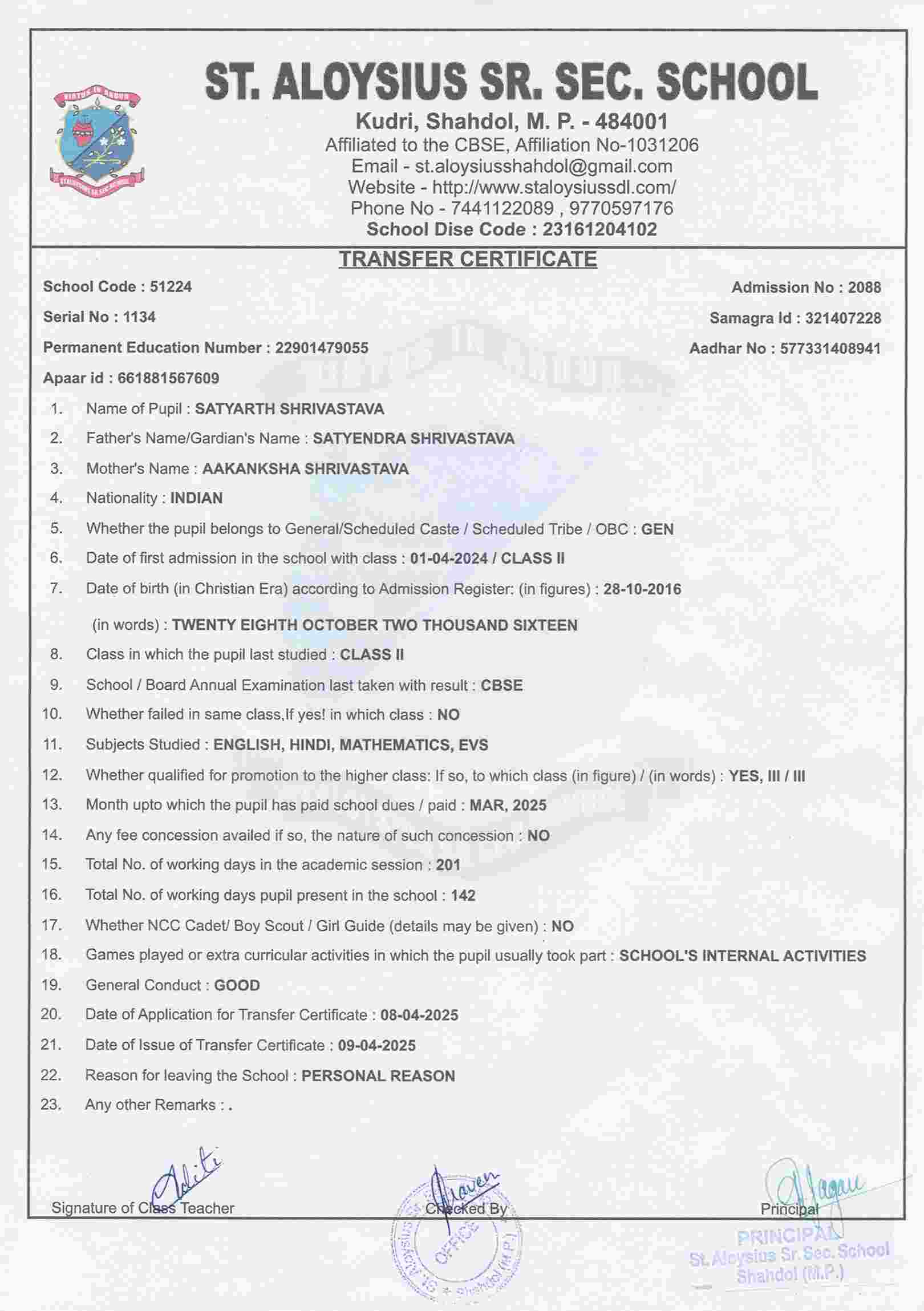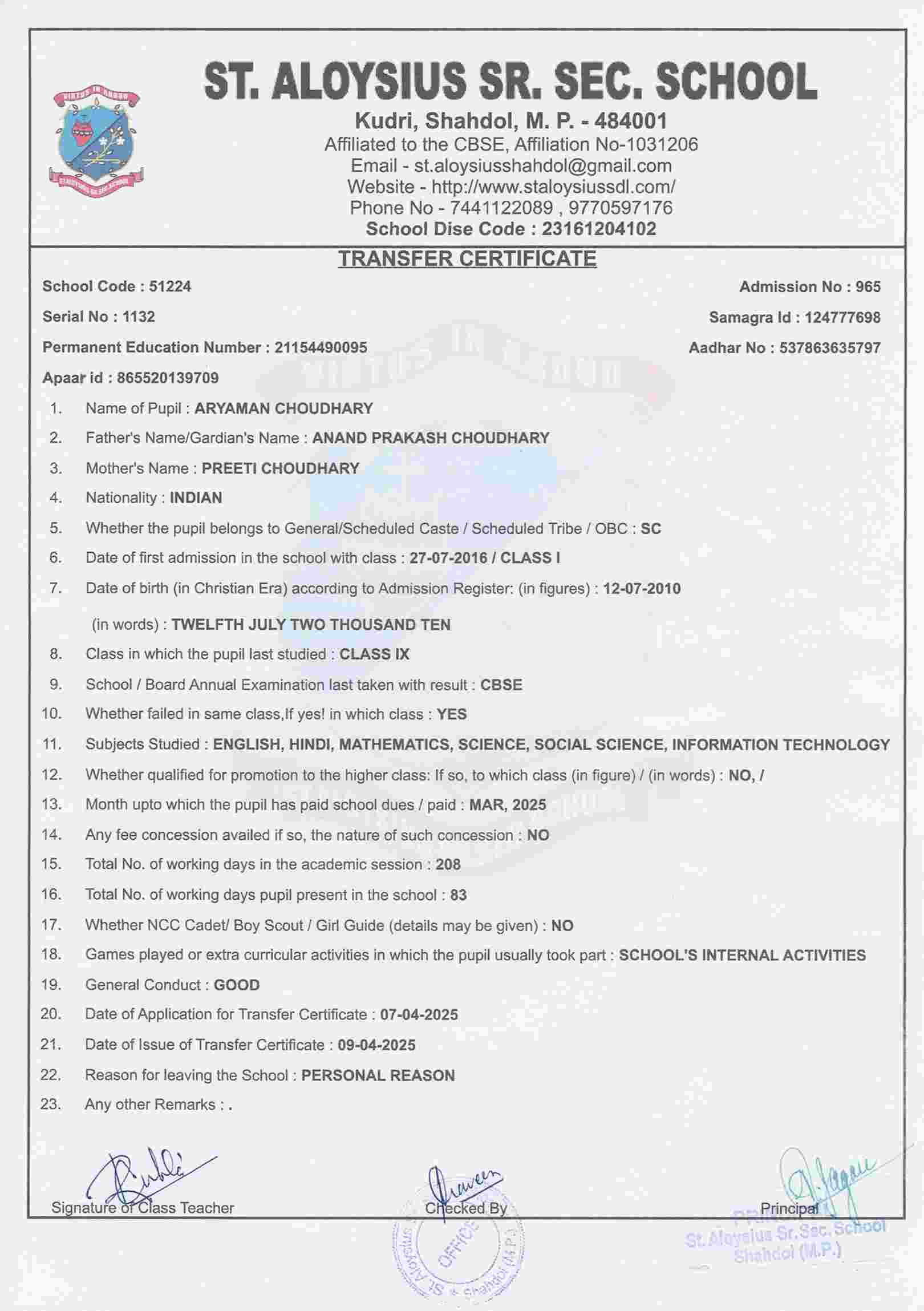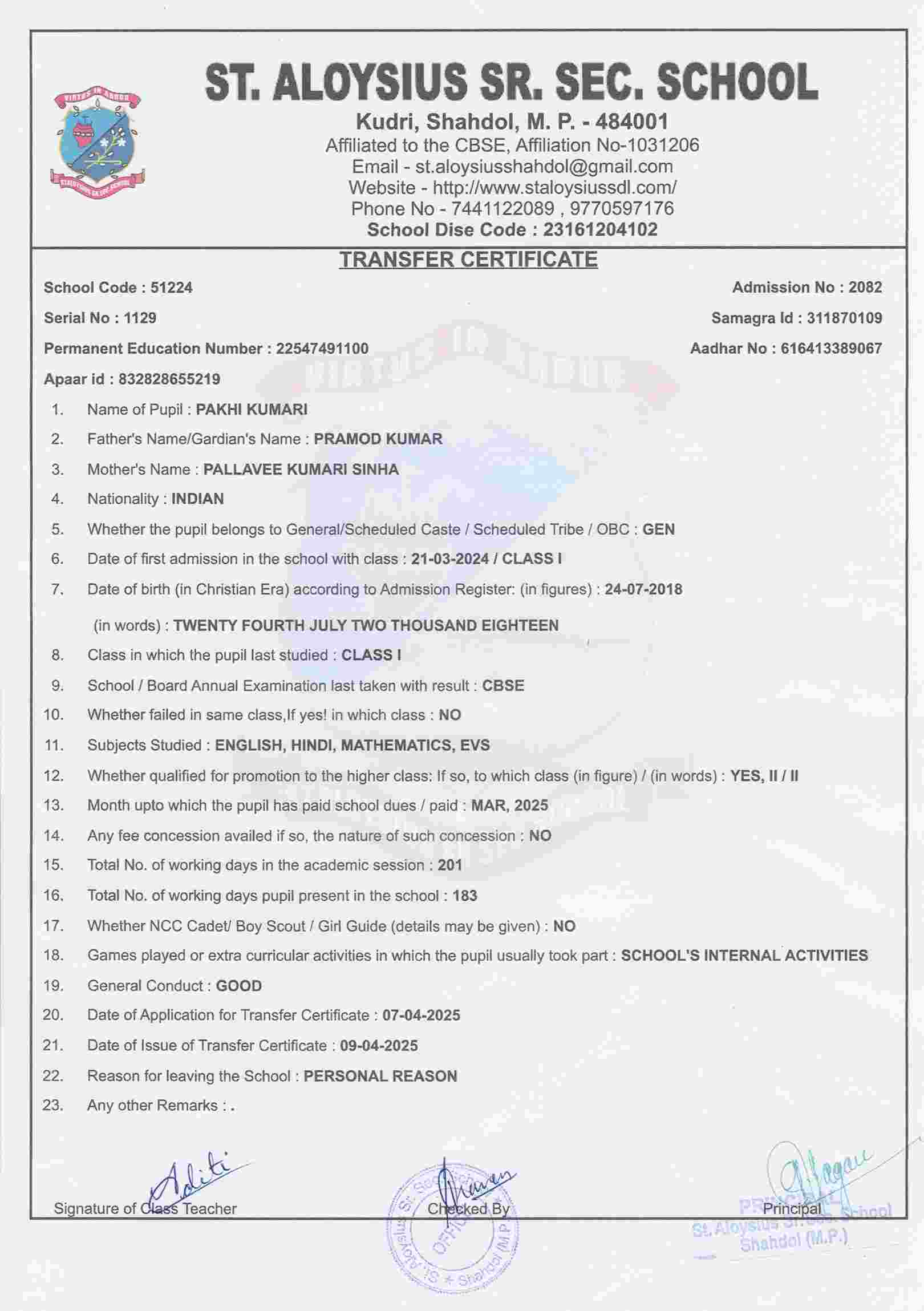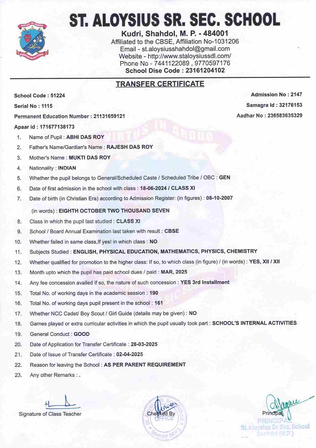 AFFILIATION NUMBER TRANSFER CERTIFICATE SCHOOL CODE