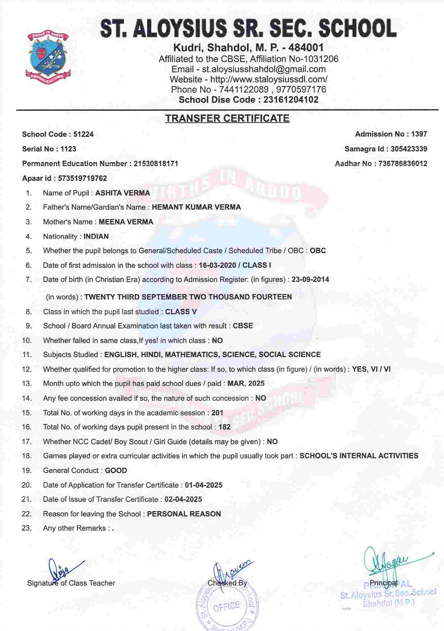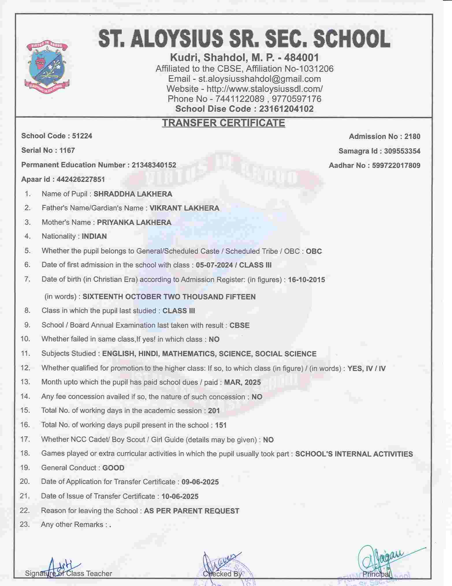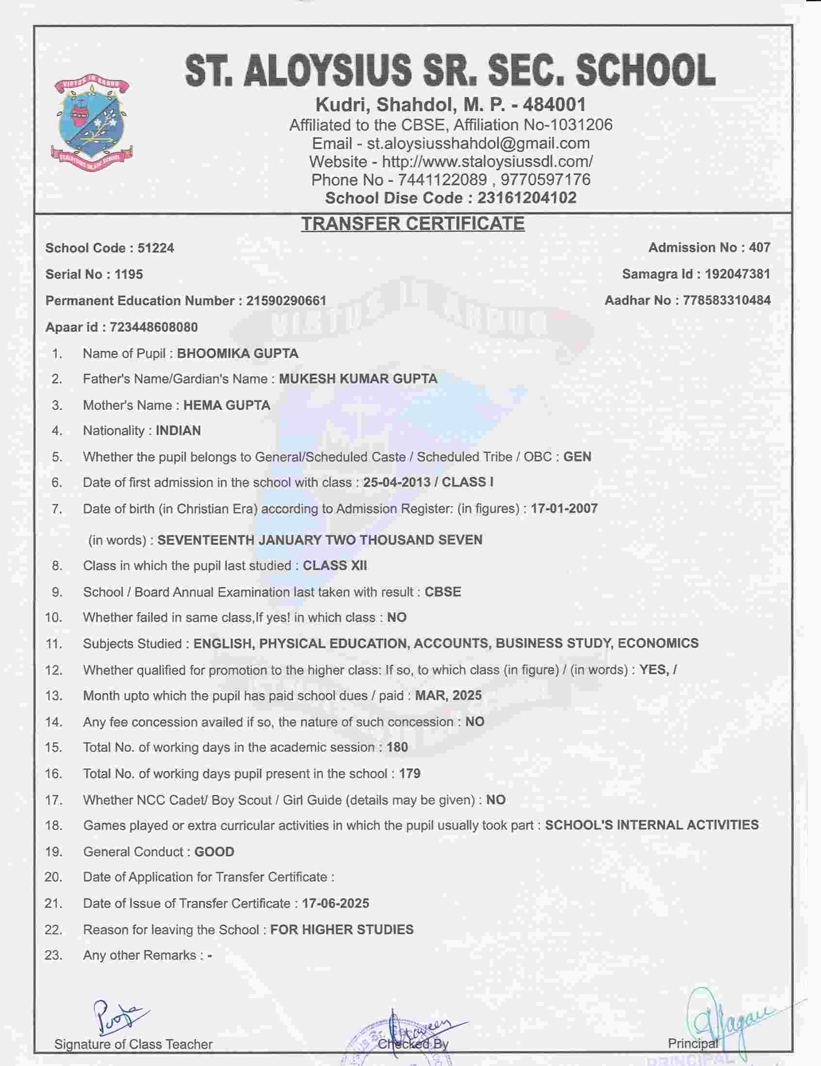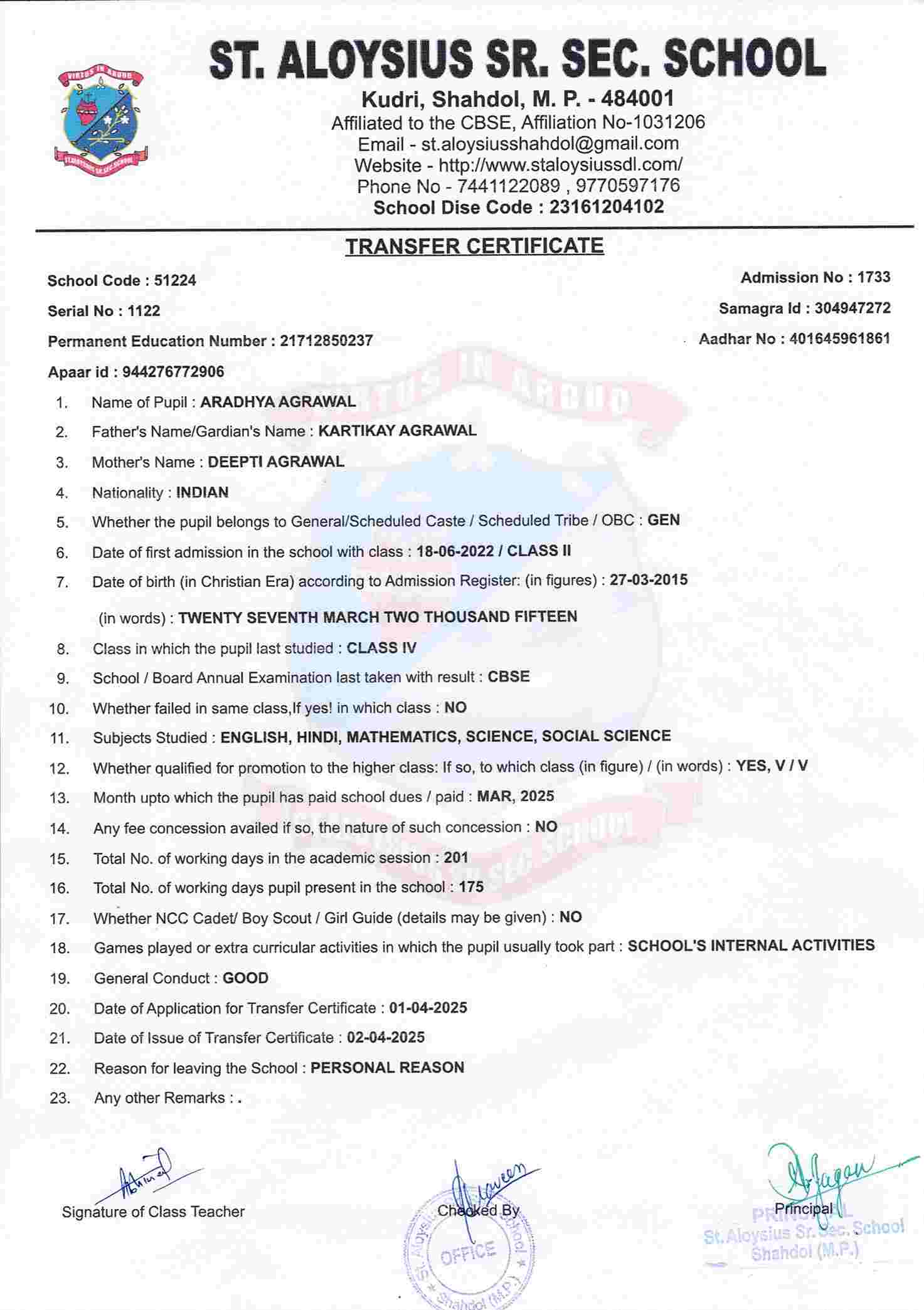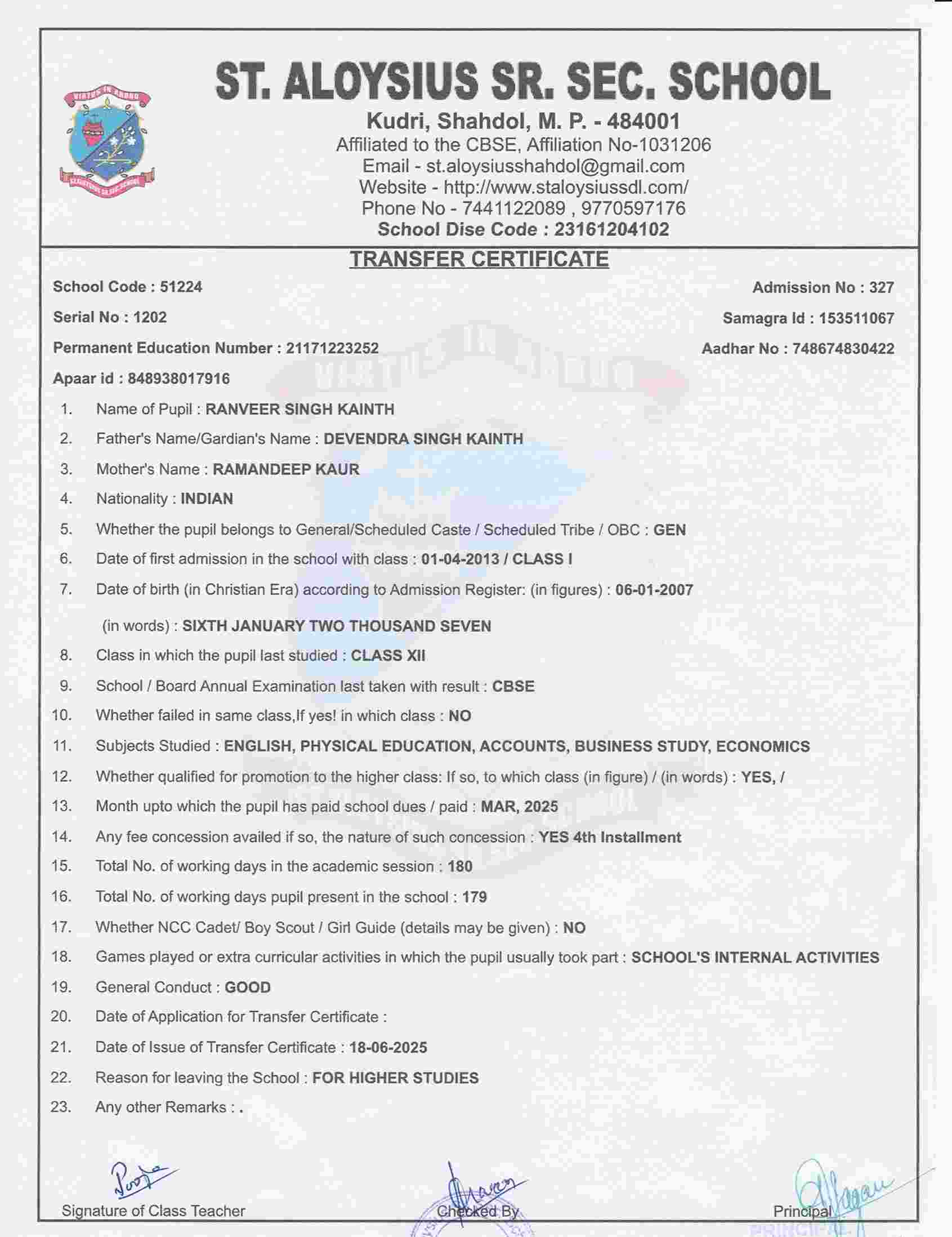 AFFILIATION NUMBER TRANSFER CERTIFICATE SCHOOL CODE