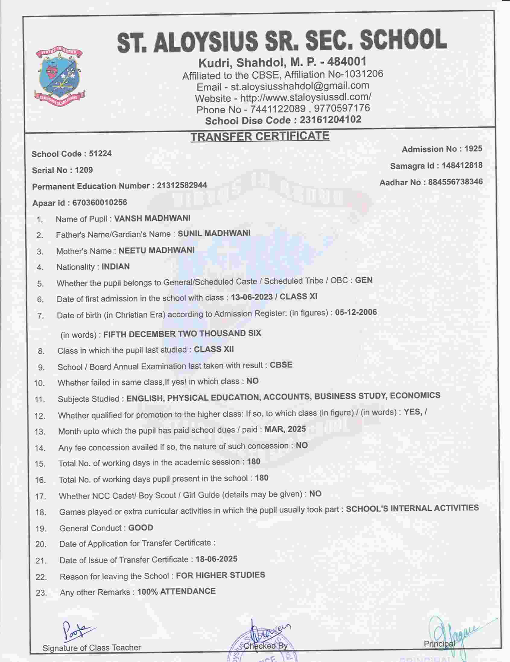 NAME OF STUDENTVANSH MADHWANI